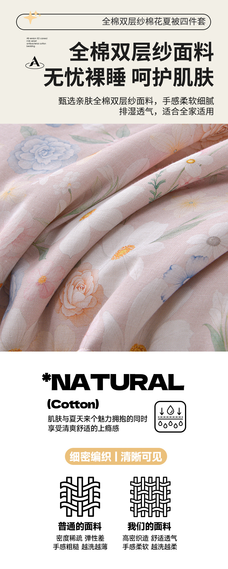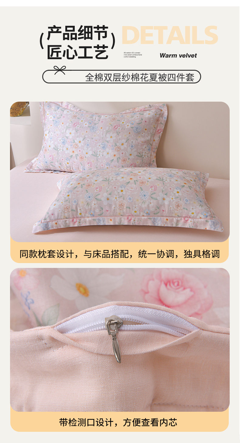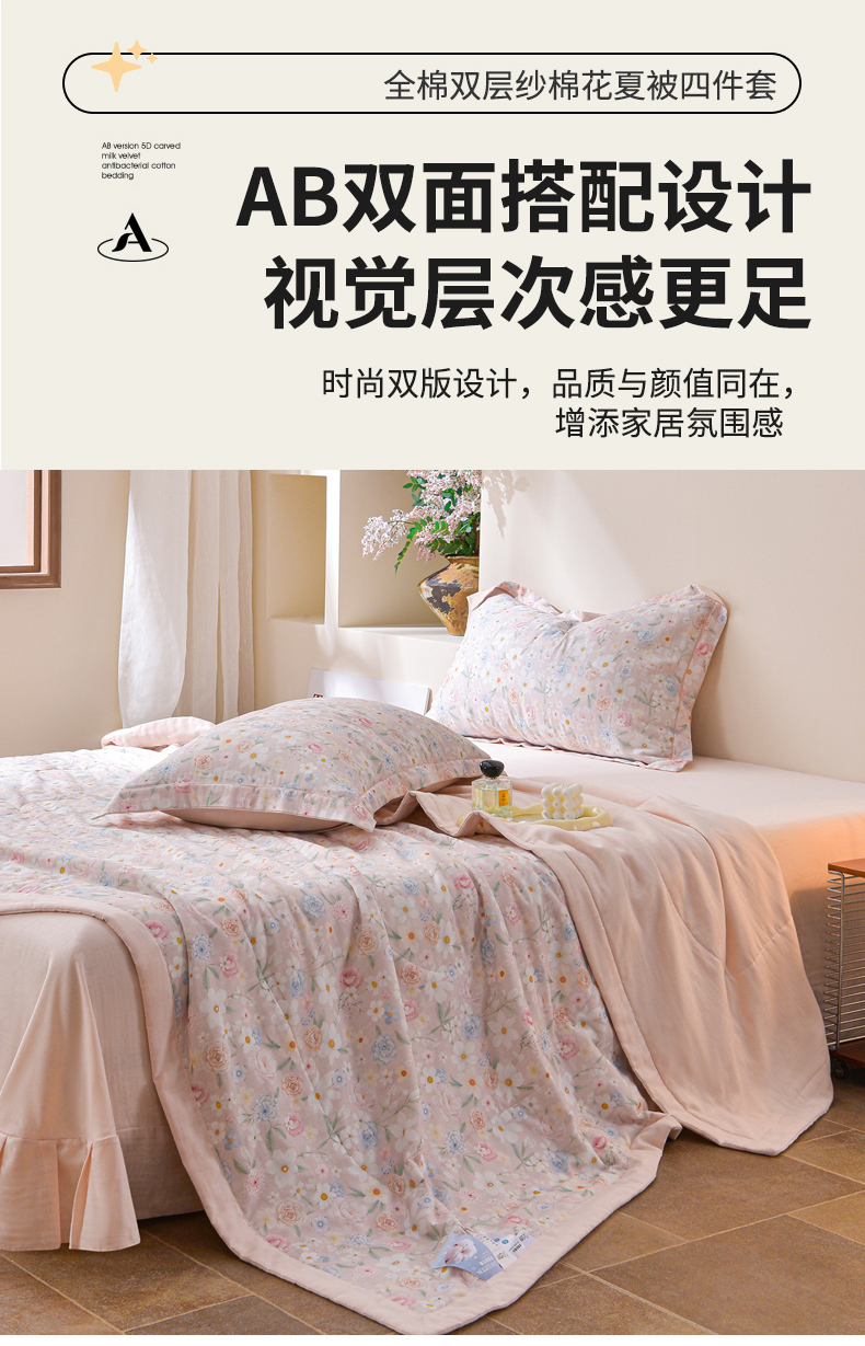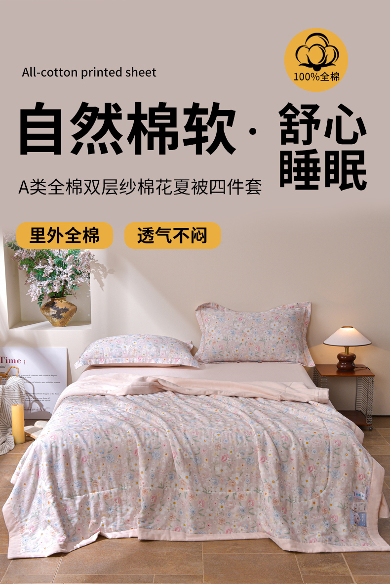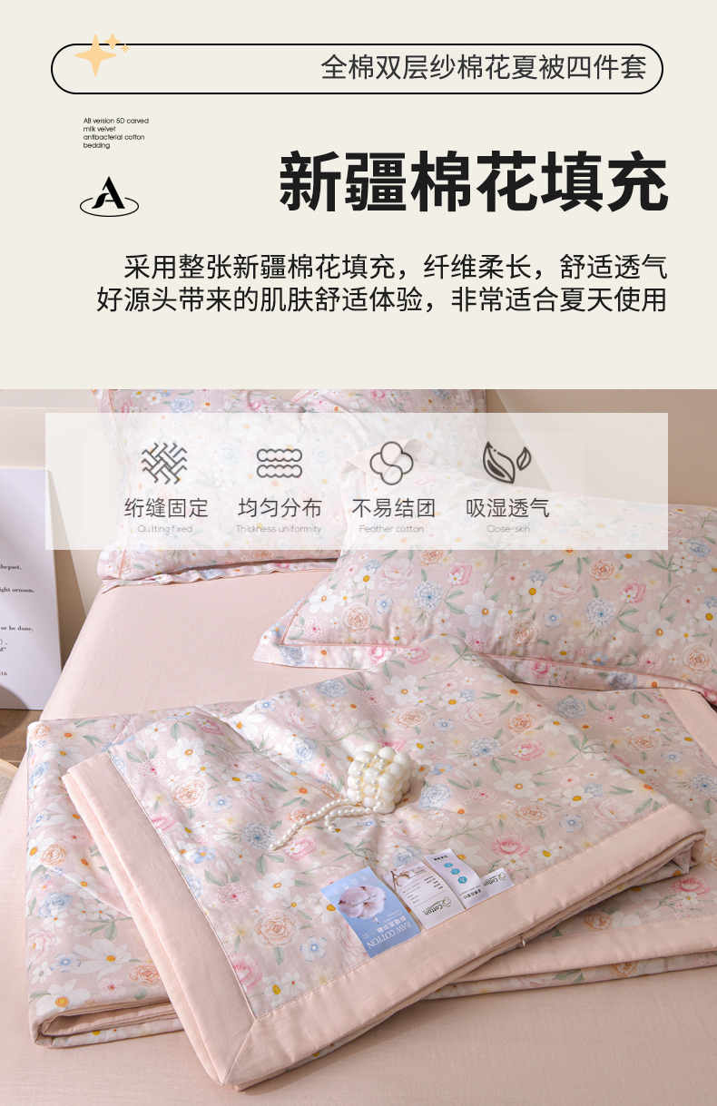 • 91家纺网 家纺一手货源 找家纺 金昱纺 2026新款A类全棉双层纱新疆棉花夏被四件套(带检测报告,包检测,有微信+买家秀) 观上月白-粉