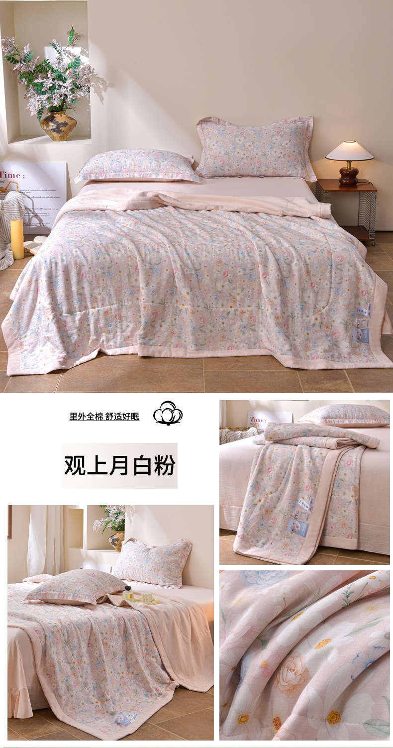 当前位置: 91家纺网 > 商品网购 > 被子 > 夏被 > 金昱纺 2026新款A类全棉双层纱新疆棉花夏被四件套(带检测报告,包检测,有微信+买家秀) 观上月白-粉