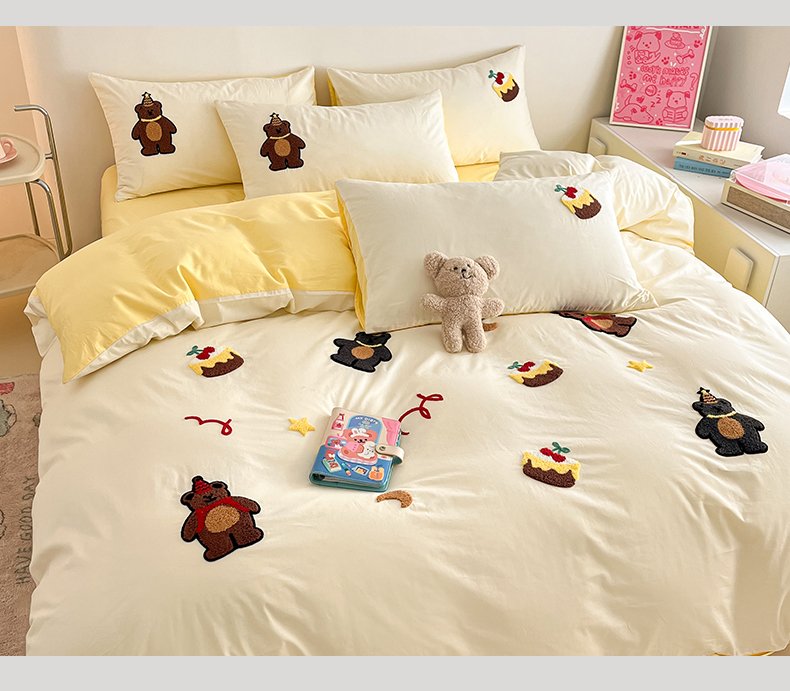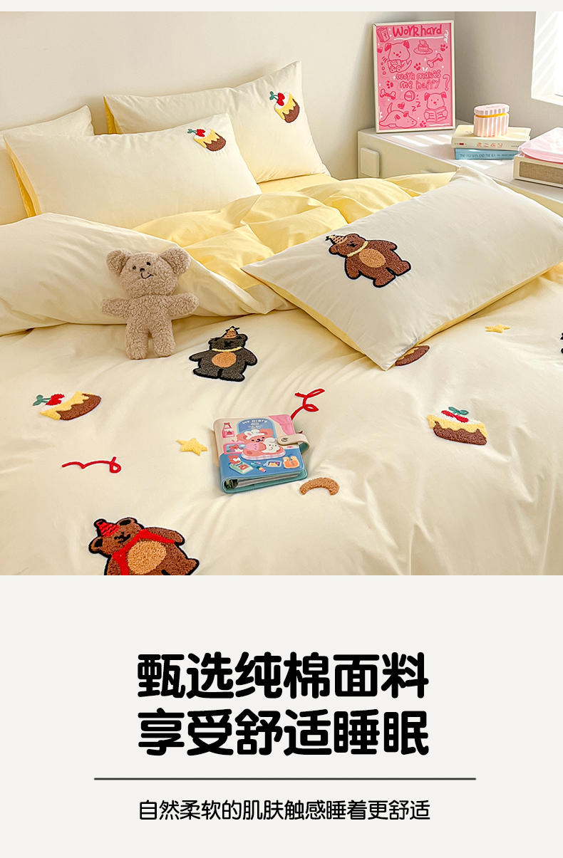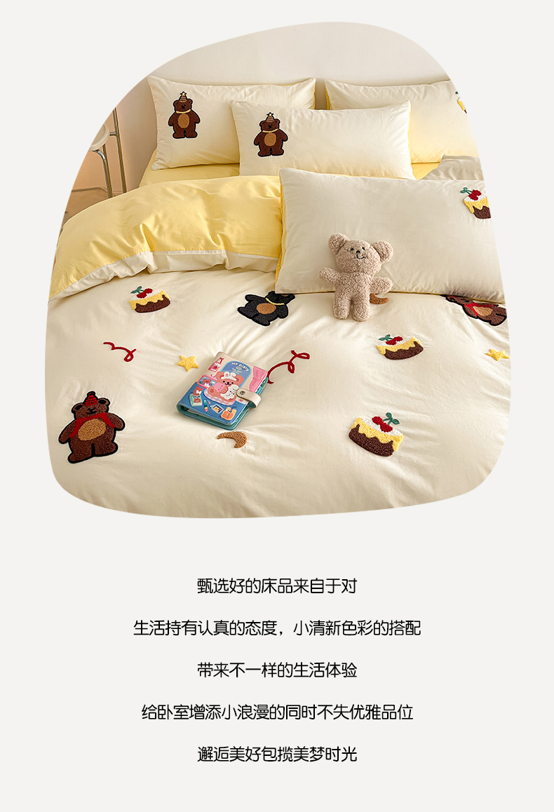 当前位置: 91家纺网 > 商品网购 > 床品套件 > 四件套 > 全棉普通四件套 > 琪格格纺织 2026新款卡通13372全棉纯棉毛巾绣四件套 小熊生日派对 米白配奶黄