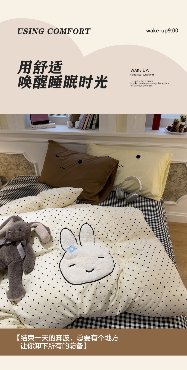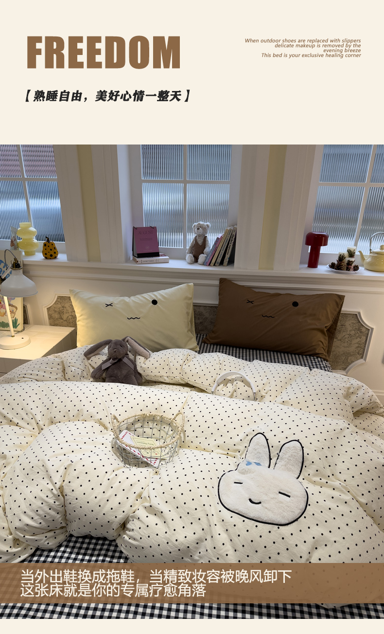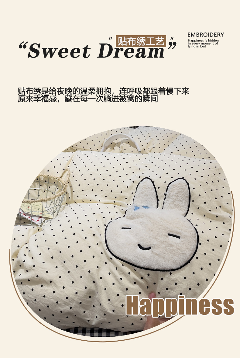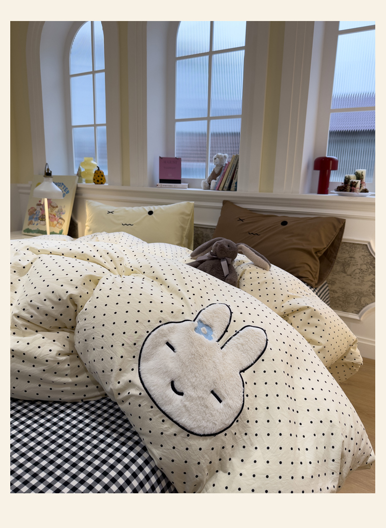 当前位置: 91家纺网 > 商品网购 > 床品套件 > 四件套 > 水洗棉四件套 > 曼谷家纺 2026年 水洗棉兔毛贴布绣四件套被套床单学生双人 菲菲兔-波点