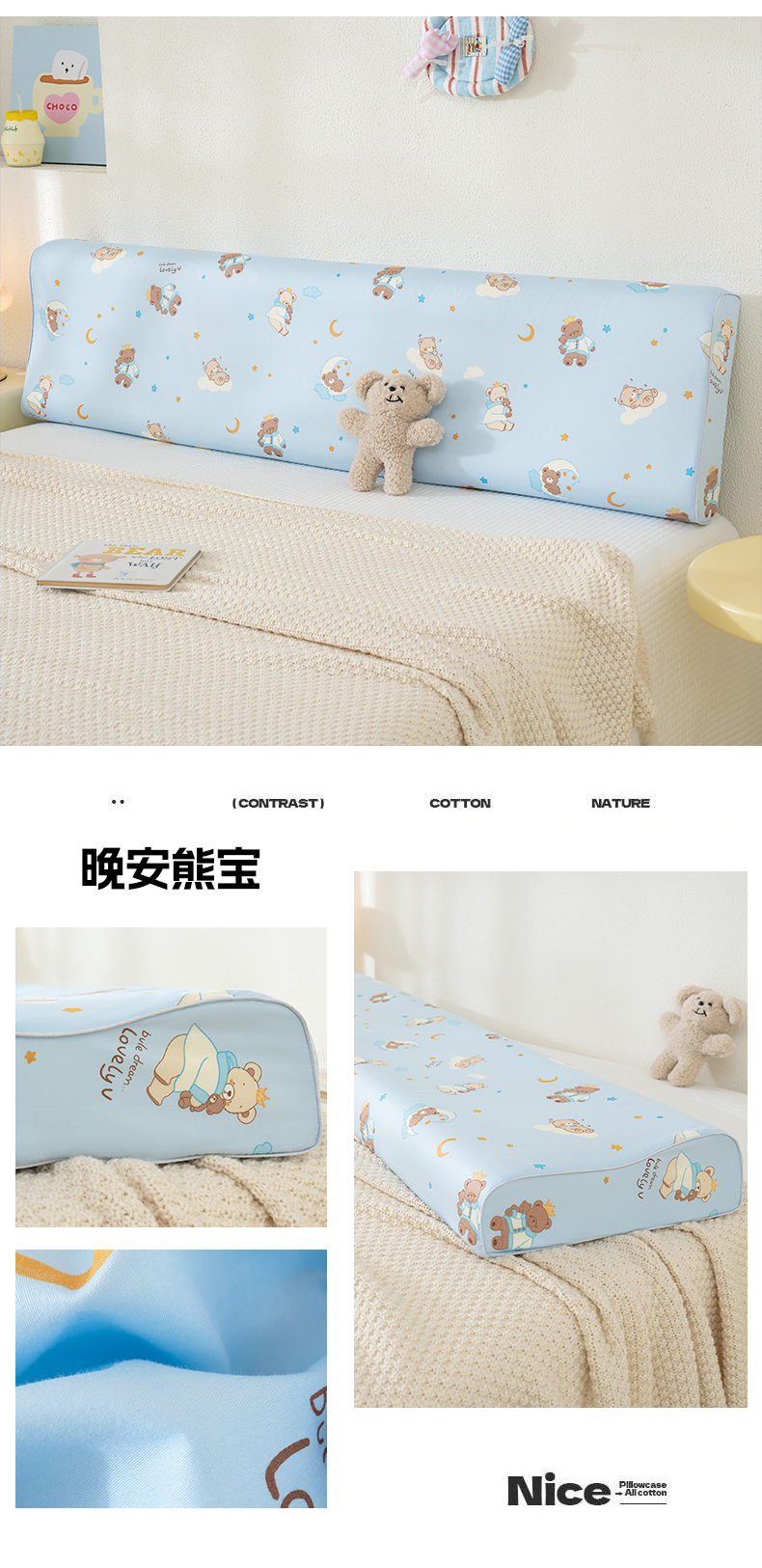 商品名称:良佐生活 2026新款60支长绒棉全棉贡缎双人乳胶枕套 晚安熊宝