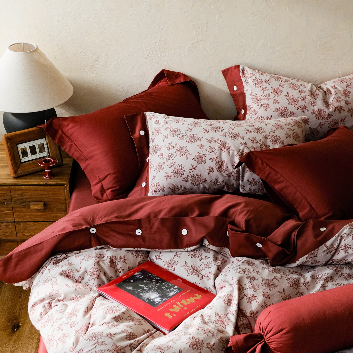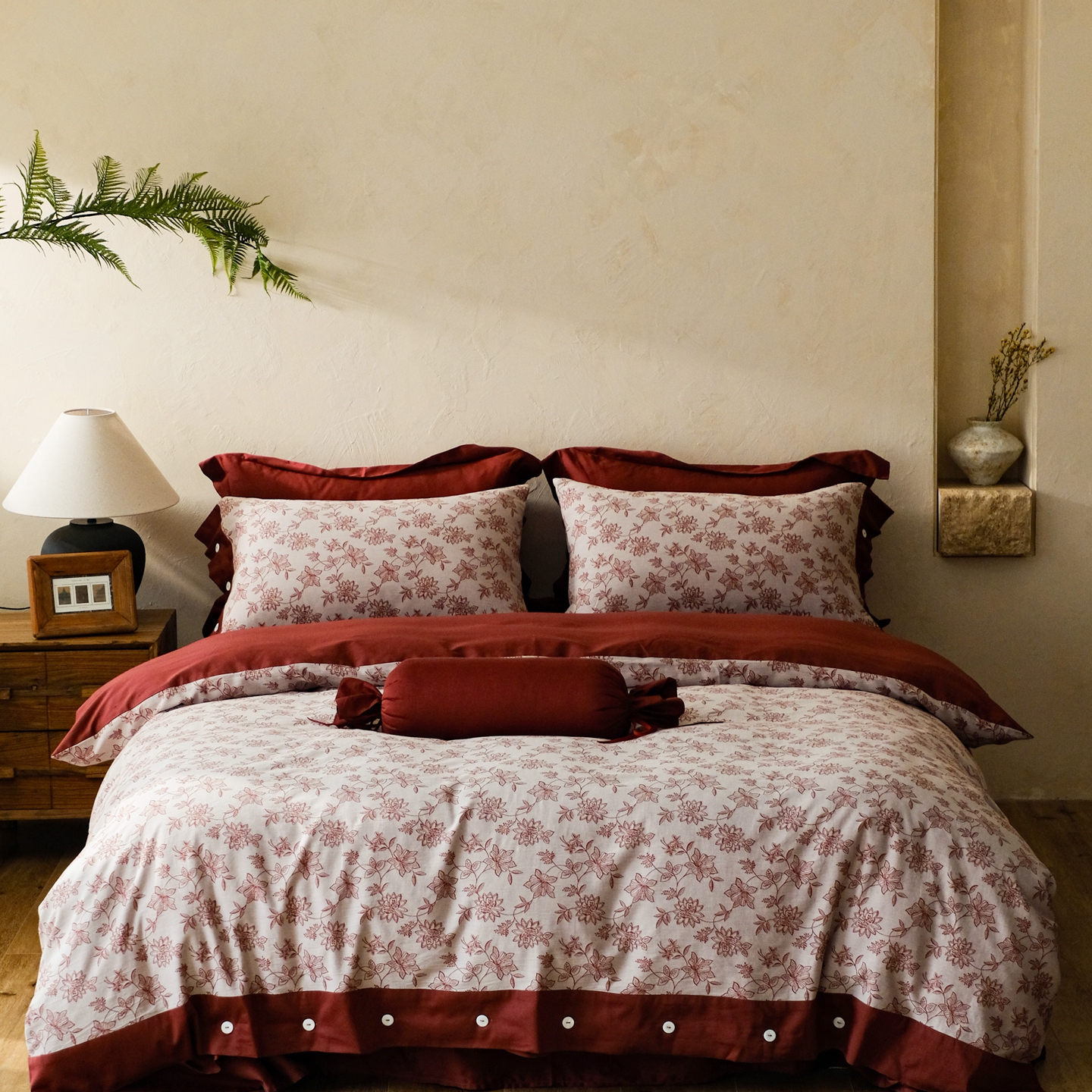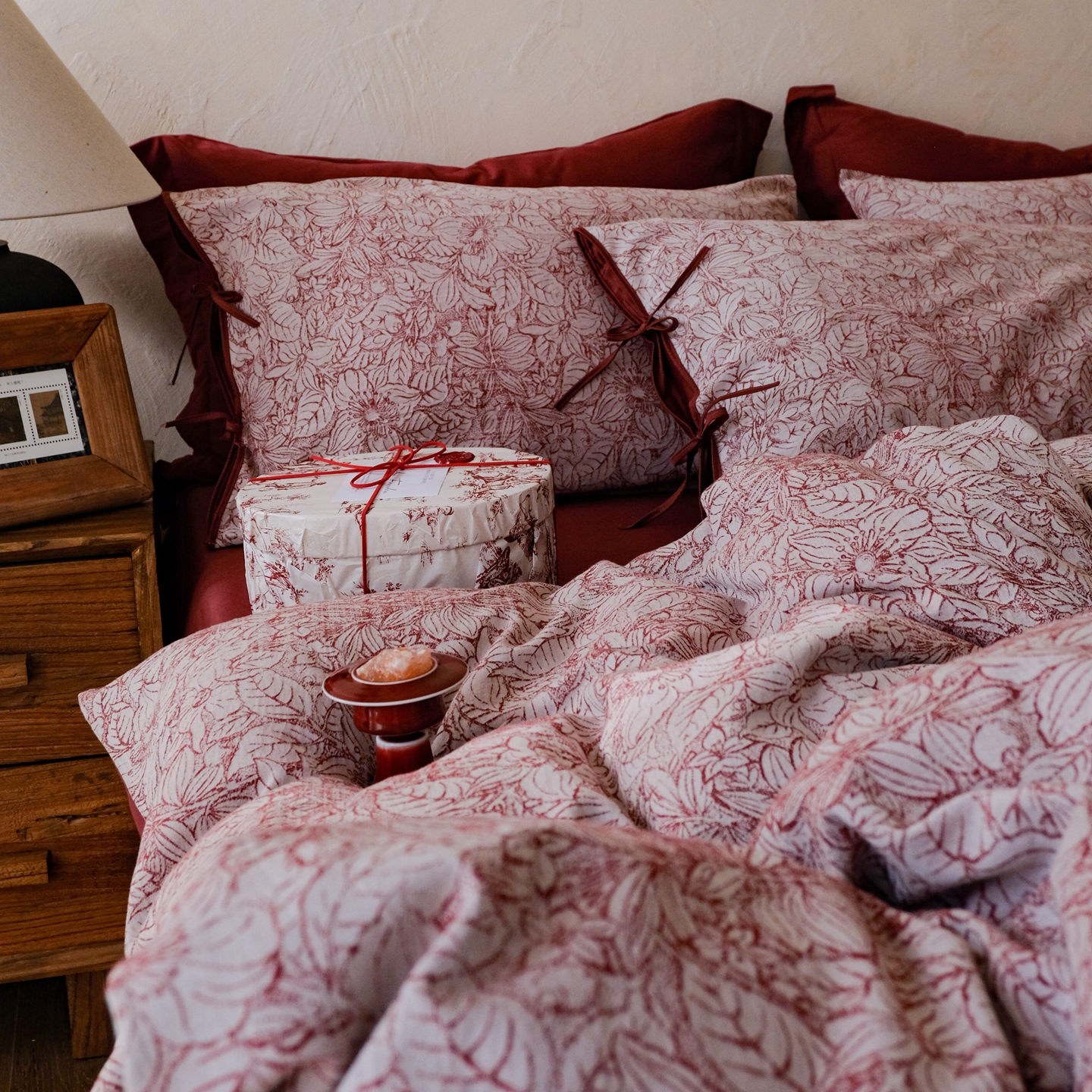 商品名称:涞澳家纺 2026新款全棉纯棉色织提花(婚庆)四件套 赤韵花影