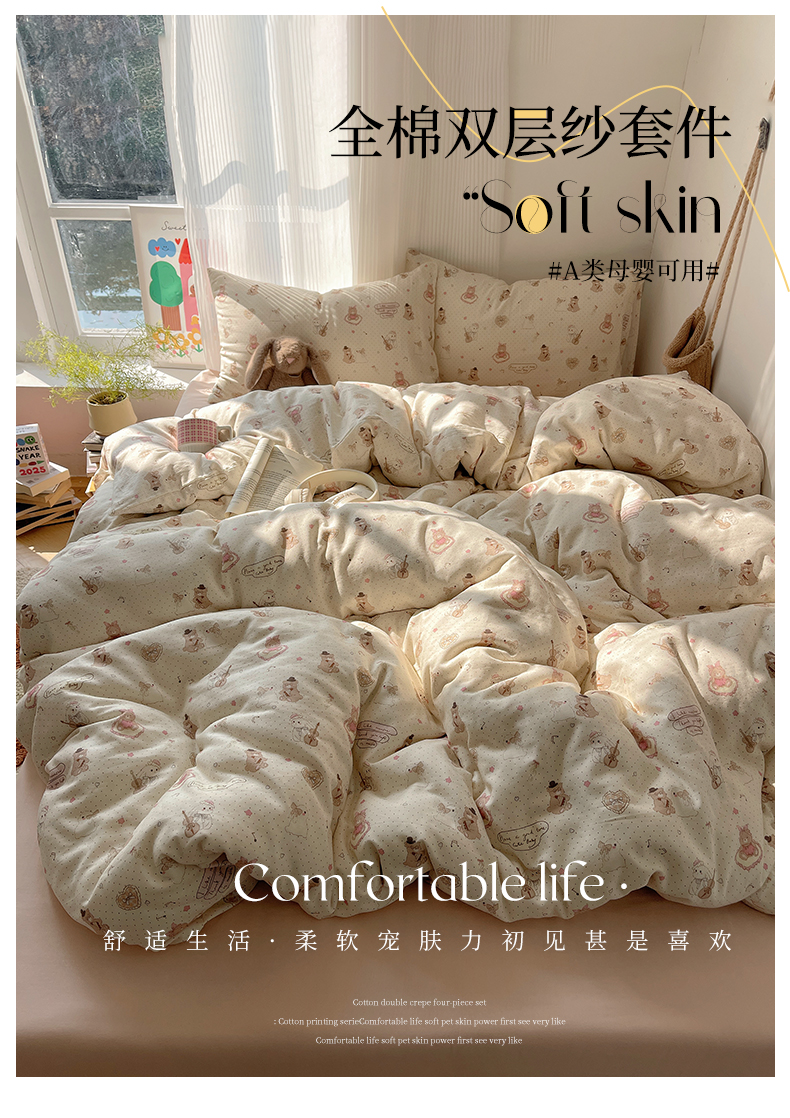 (总)萝莉家纺 2026新款全棉双层纱四件套,爱心猫咪,波点小猫,开心的一天,快乐大家族,魔术的梦想,森林兔,贪吃的猫,小人国,音乐派对