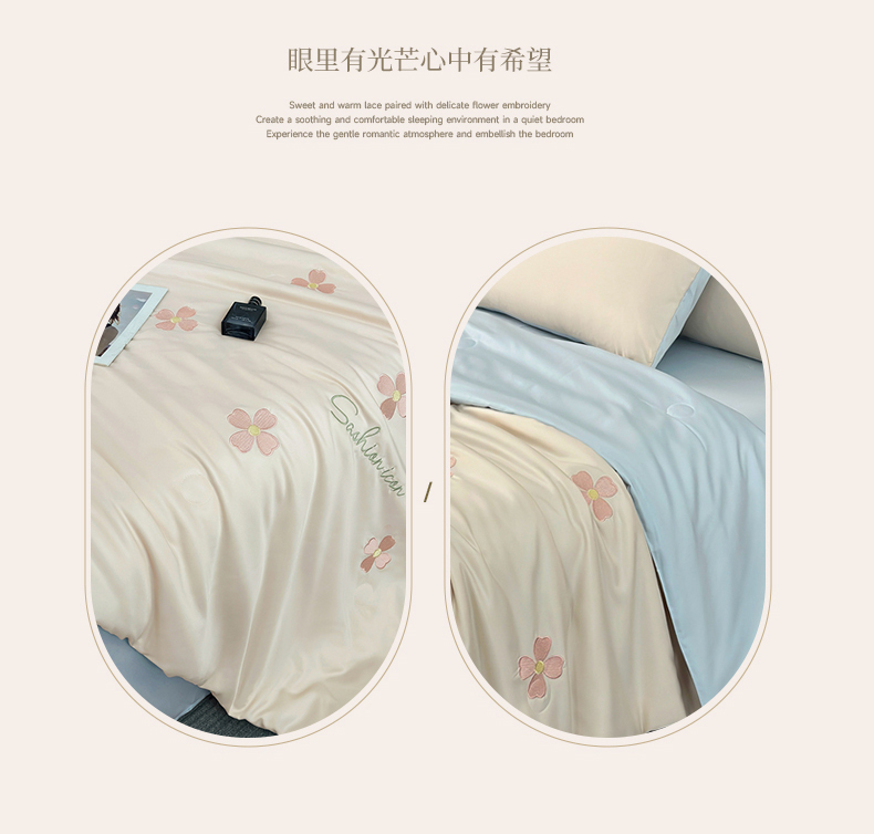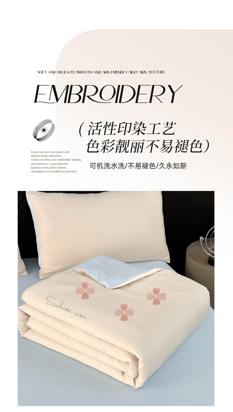• 91家纺网 家纺一手货源 找家纺 益多眠 2026新款水洗真丝刺绣夏被夏凉被空调被四件套 幸运花瓣-奶白兰