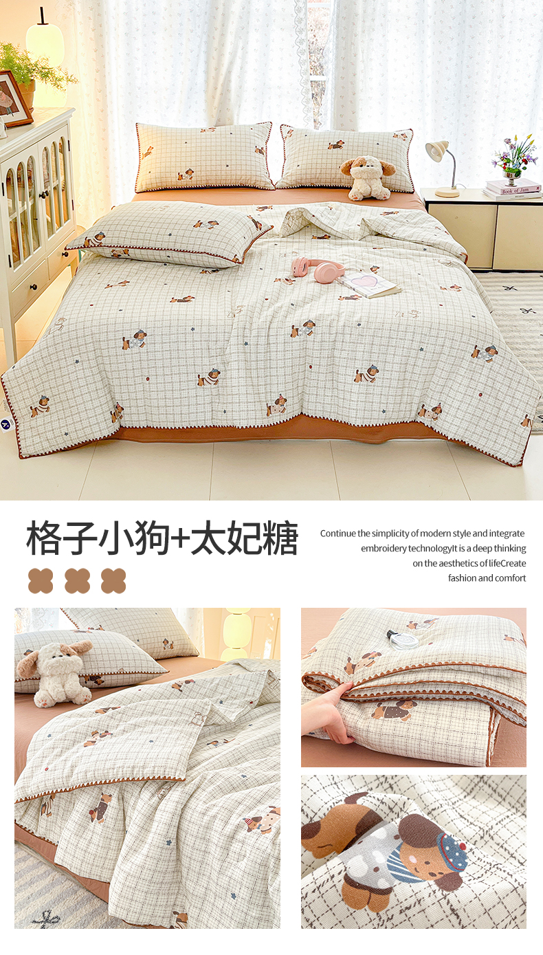 (总)盛秋家纺 2026新款皱皱纱印花夏被-萝拉,生日派对+清新绿,格子花园+奶油粉,格子铺粉+天空蓝,花丛小熊+奶油粉,可可颂蓝+天空蓝,恐龙游记+天空蓝,快乐时光+深咖,麻薯团+米驼,派对狗+深咖,森林小象+奶油粉,小狗来信+奶油粉,小伙伴+米驼,小熊小花+麦绿,修勾咖+米驼