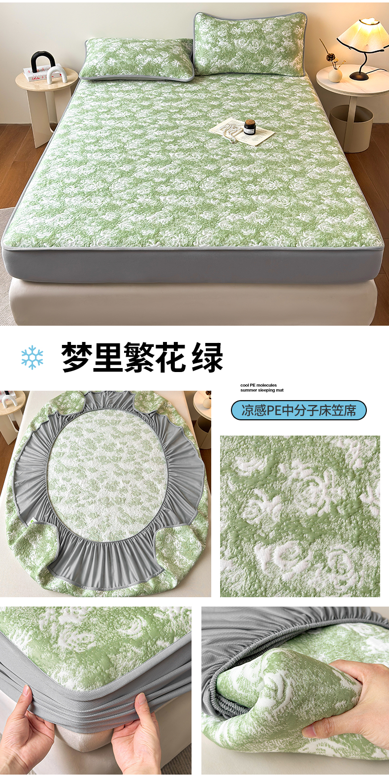 (总)柔品 2026春夏新款PE中分子床裙款凉席席子-梦里繁花,床裙 梦里繁花 粉,床裙 梦里繁花 蓝,床裙 梦里繁花 绿,床裙梦里繁花 灰