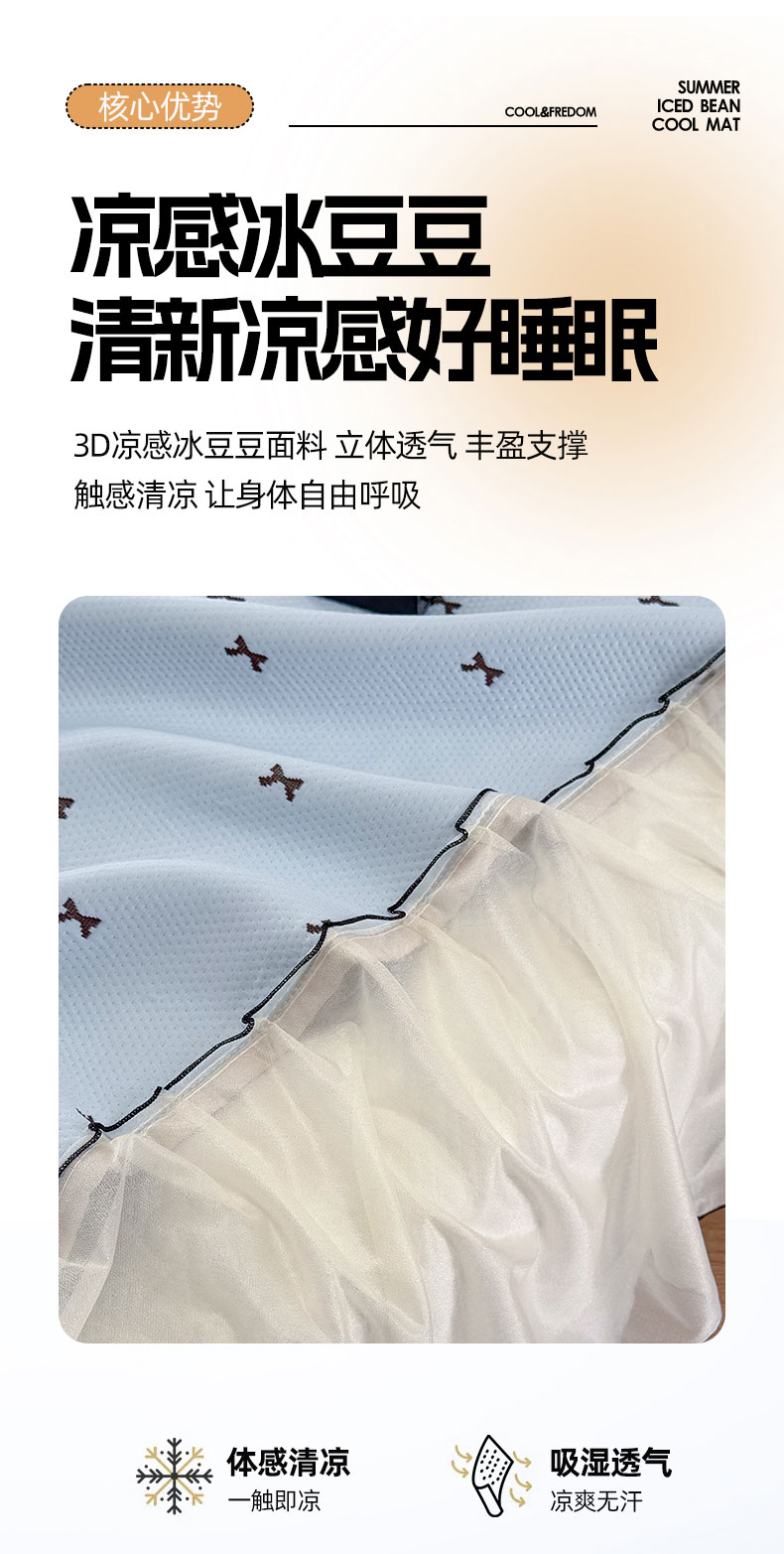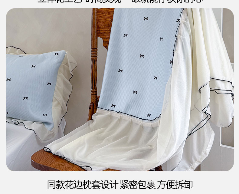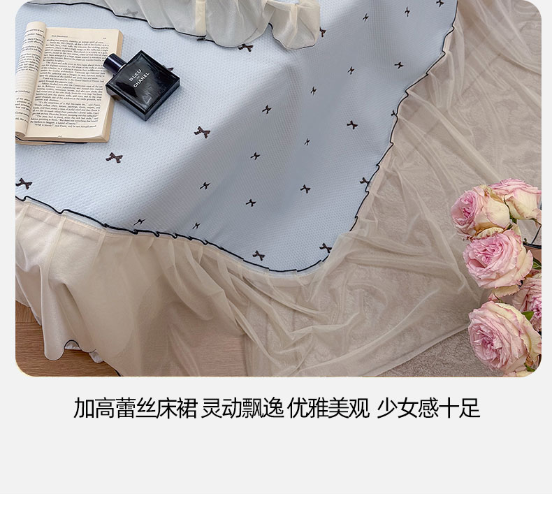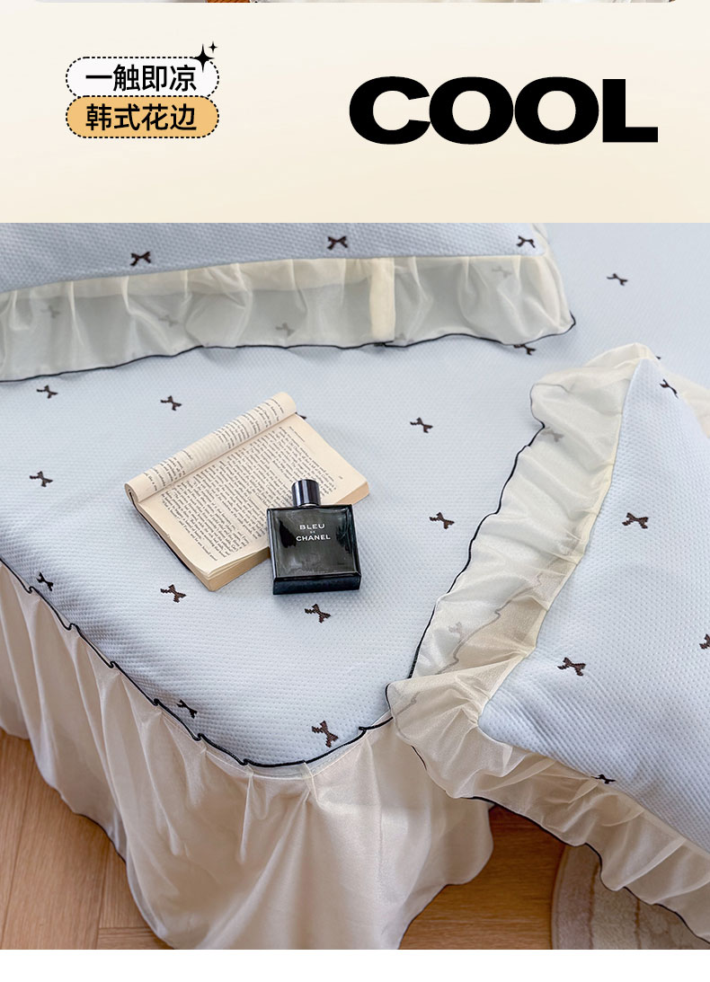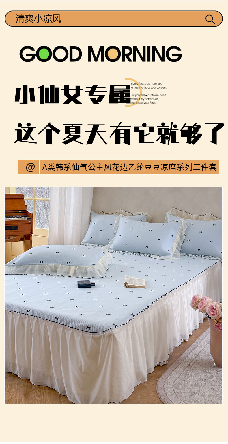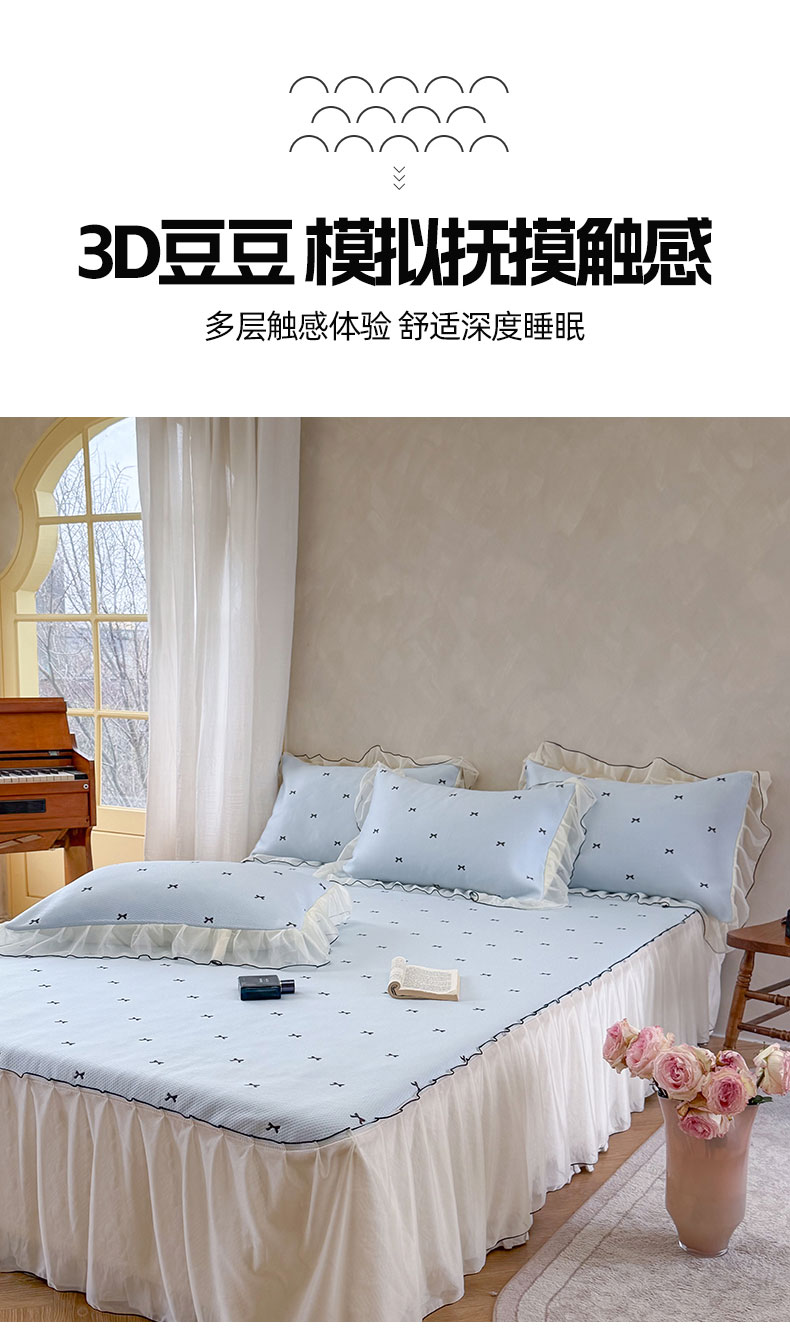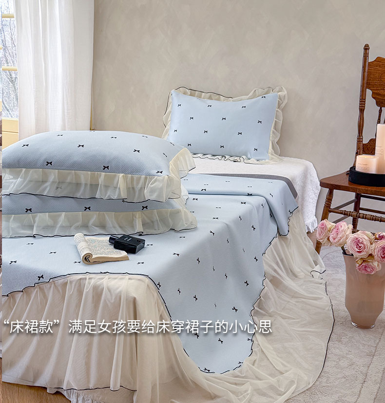 当前位置: 91家纺网 > 商品网购 > 床上用品 > 凉席 > 凉席套件 > 桃子家居 2026新款A类韩系仙气公主风PE凉感中分子床裙凉席蕾丝花边蝴蝶结乙纶豆豆凉席系列三件套 床裙席-仙气蝴蝶结蓝