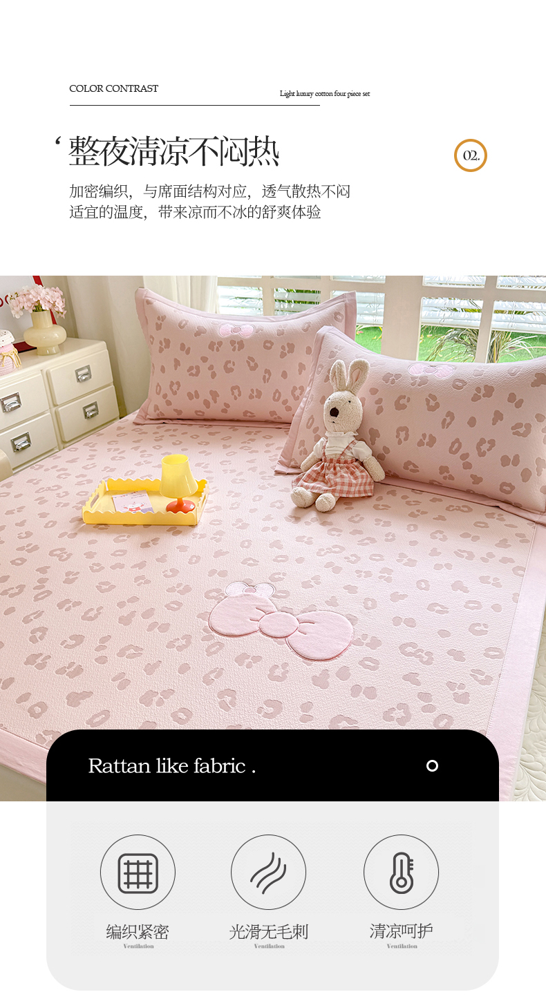 商品名称:优贝家纺 2026新款高克重PE聚乙中分子复合凉感软席贴布绣三件套凉席 豹纹蝴蝶