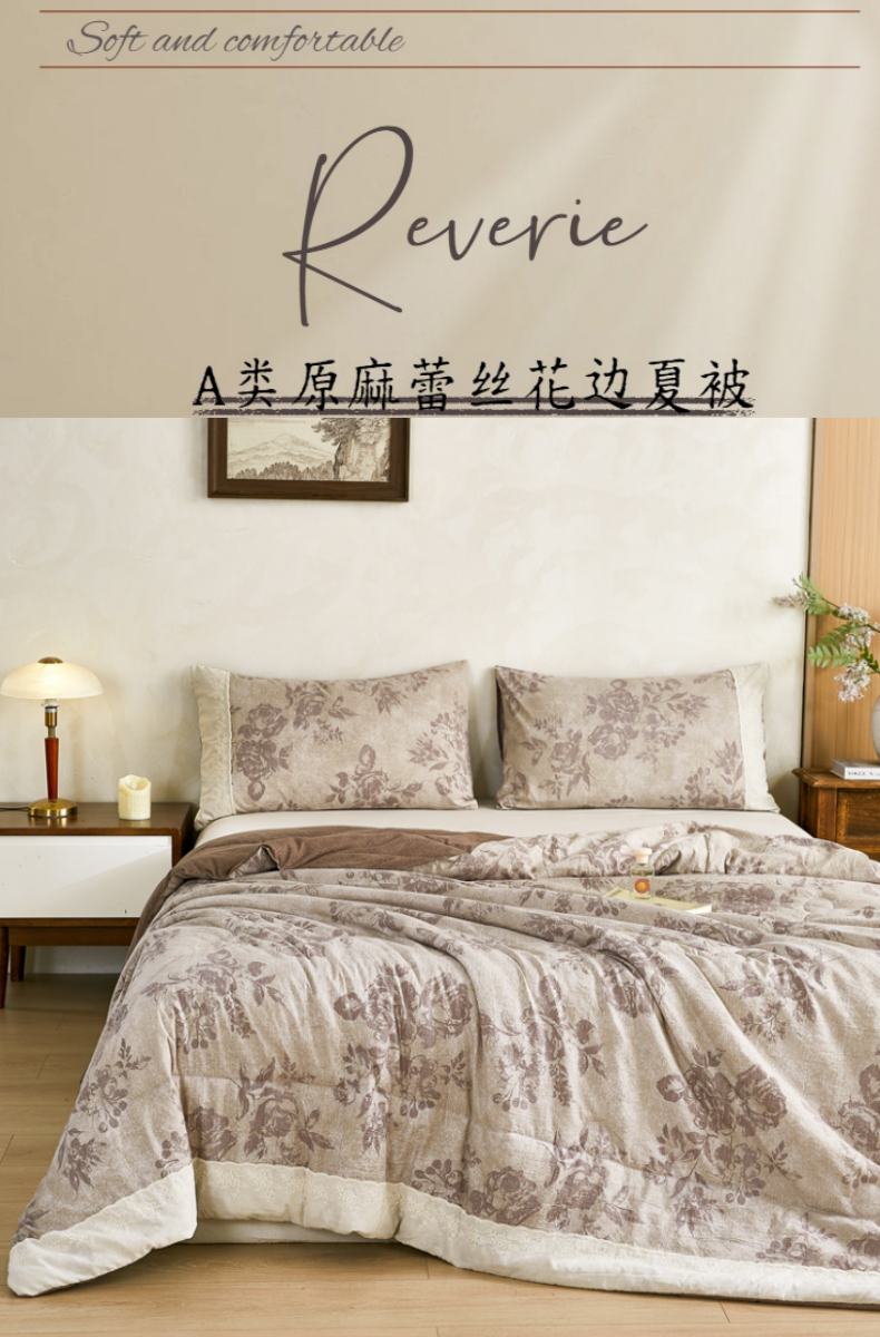 商品名称:梦舒羽 2026新款A类夏天原麻全棉蕾丝花边加厚夏被宿舍双人床仿亚麻被子被芯 古堡花园-咖