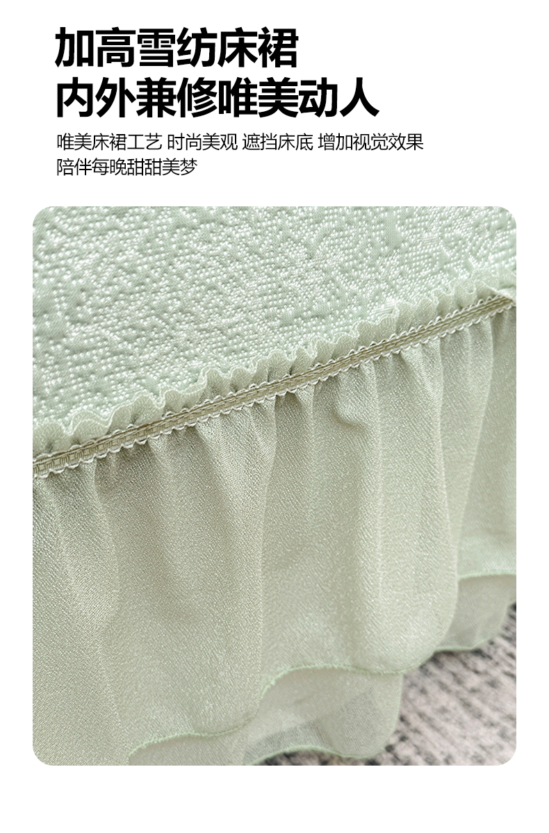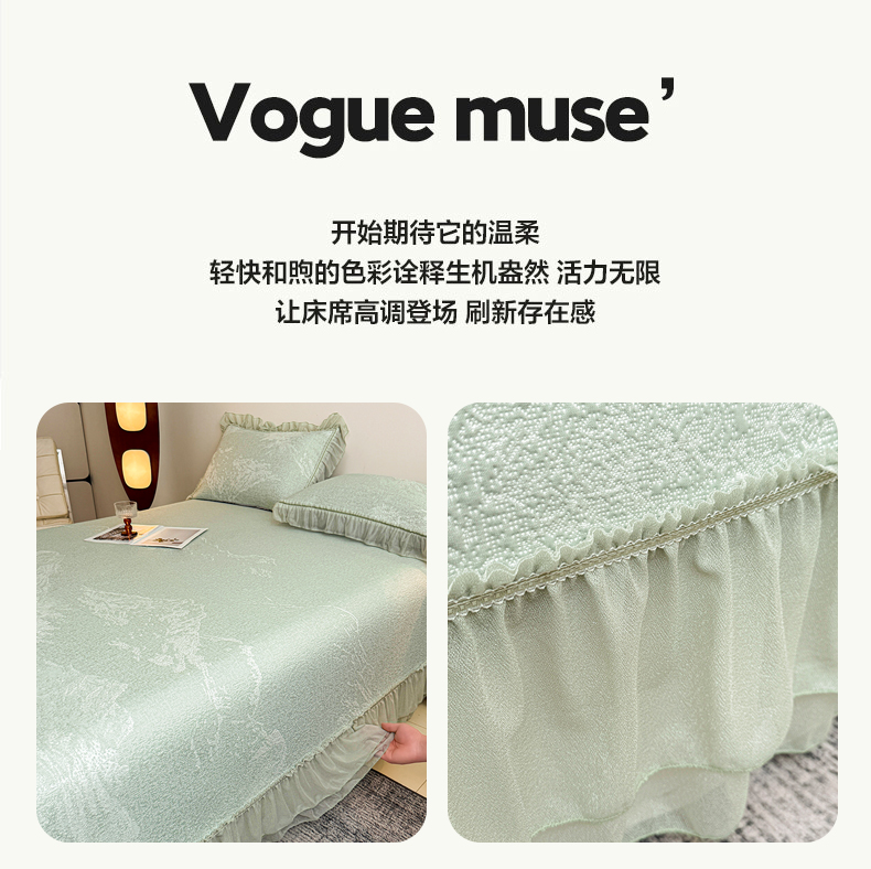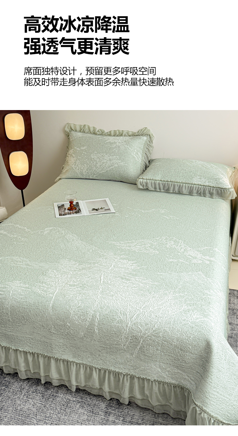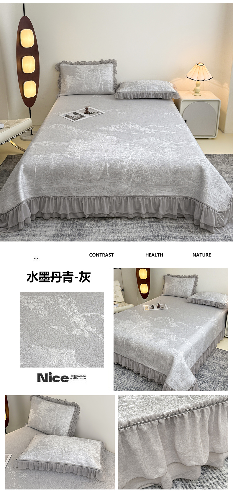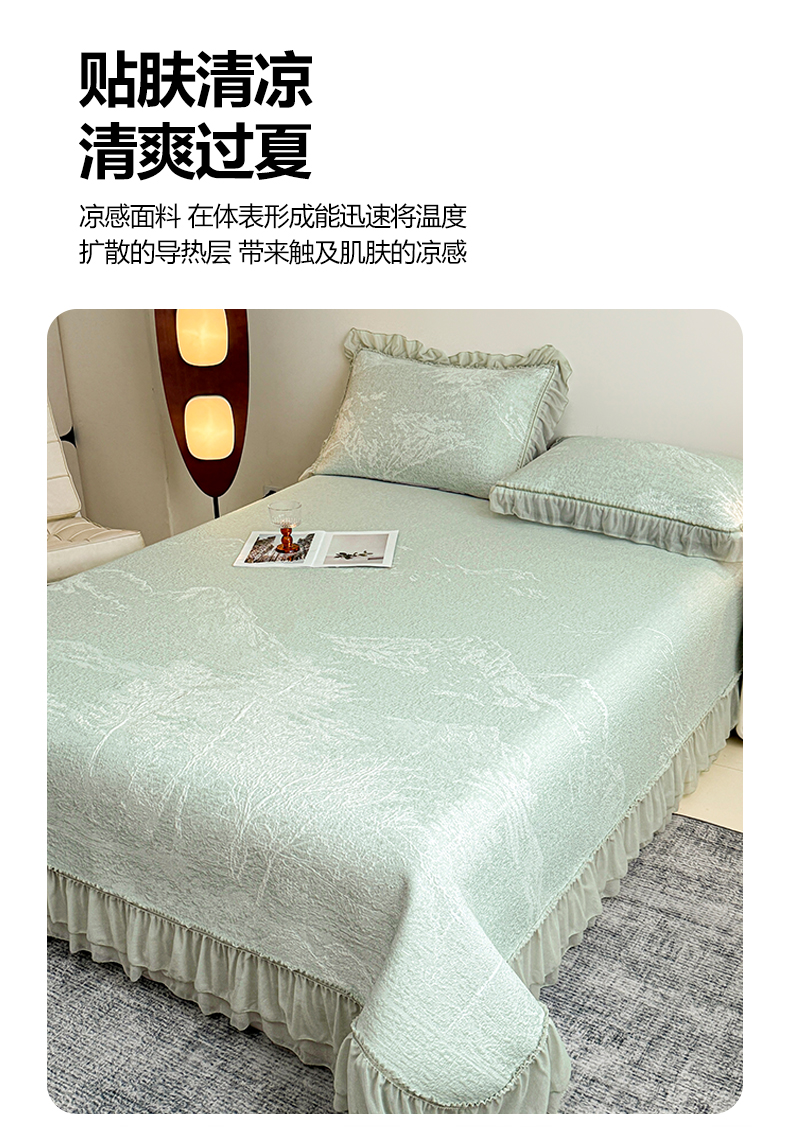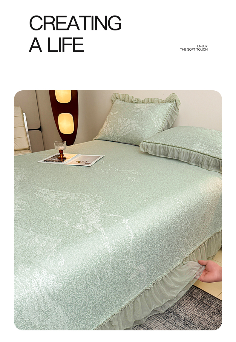 慕木家纺 2026新款A类三明治复合乙纶提花冰豆豆花边床盖款床裙水墨丹青系列(提供买家秀) 水墨丹青-绿