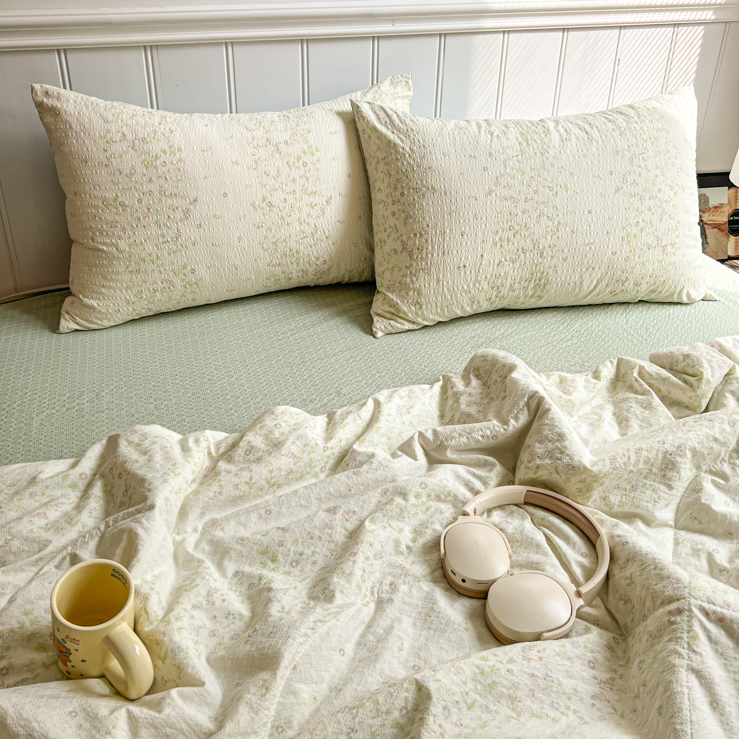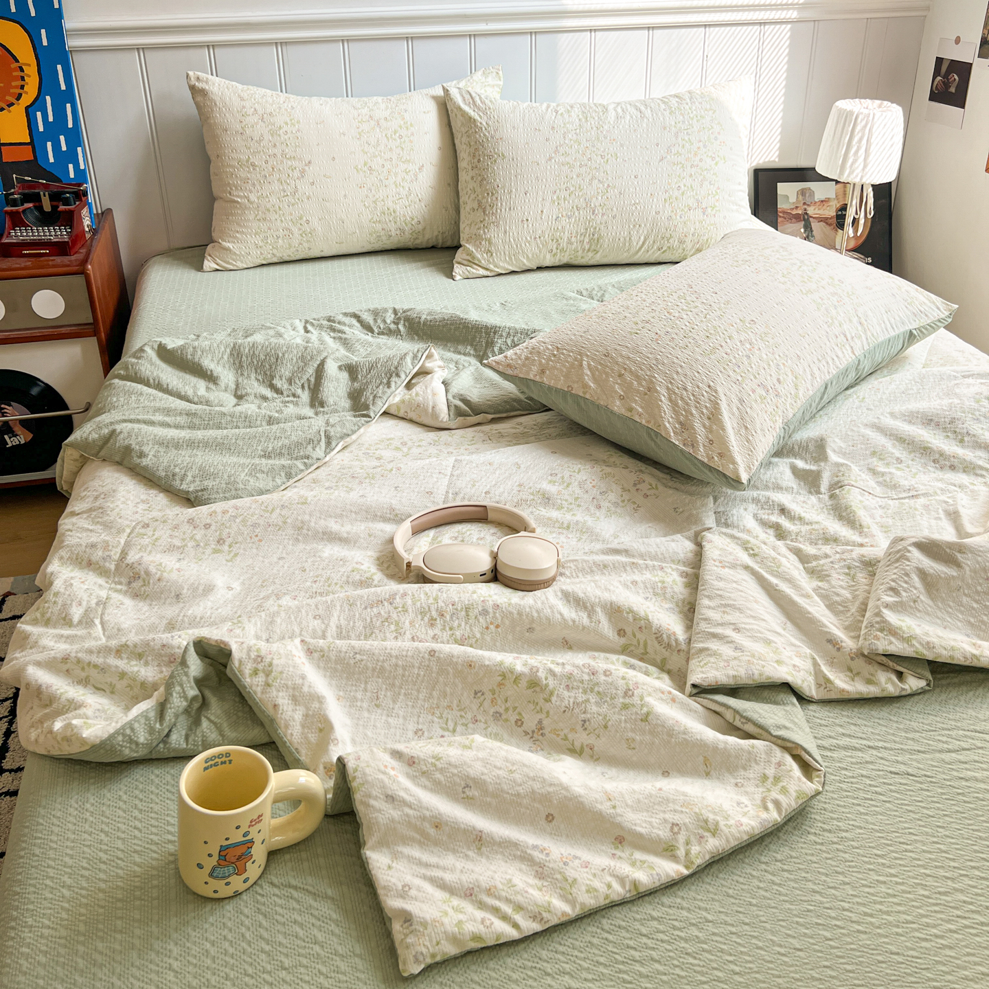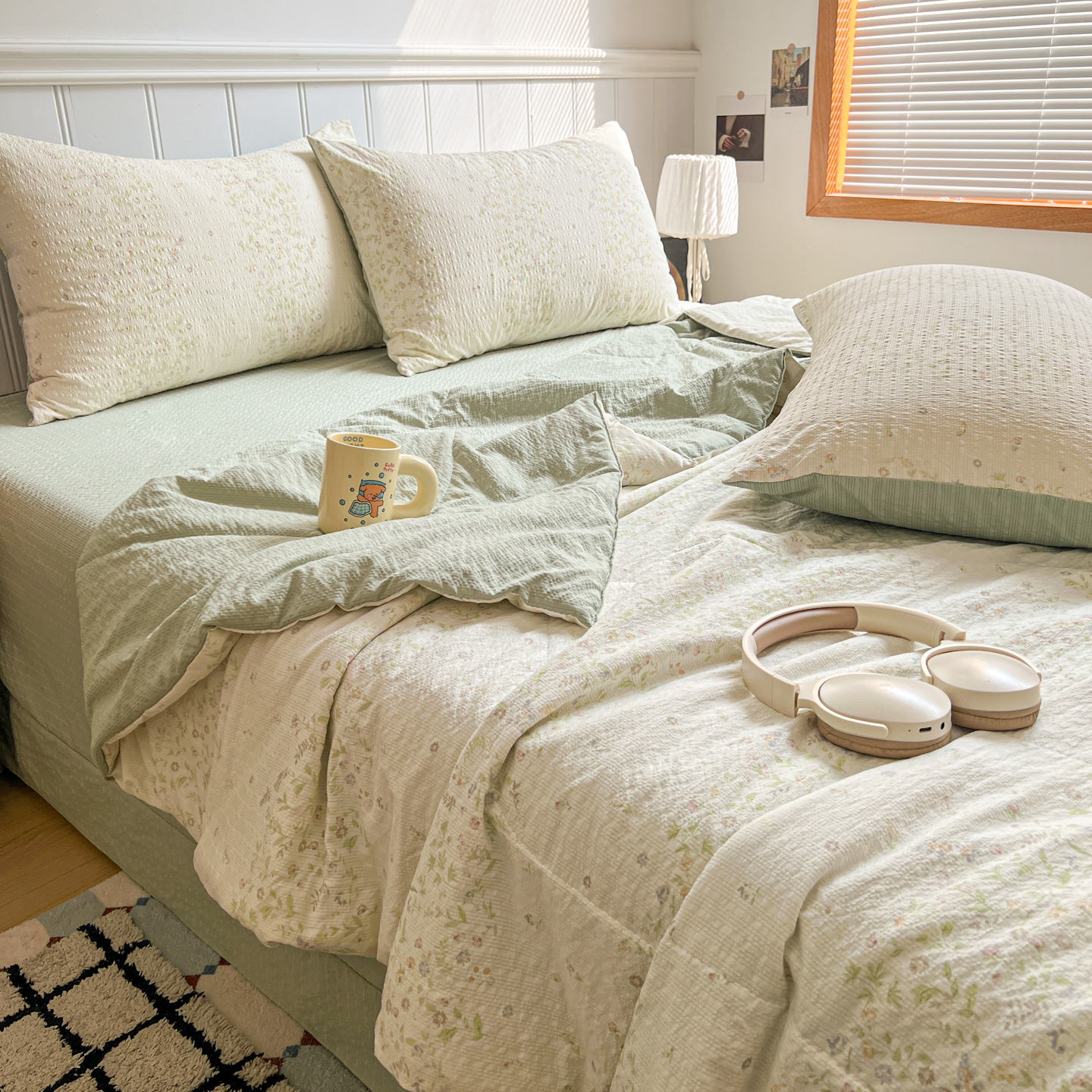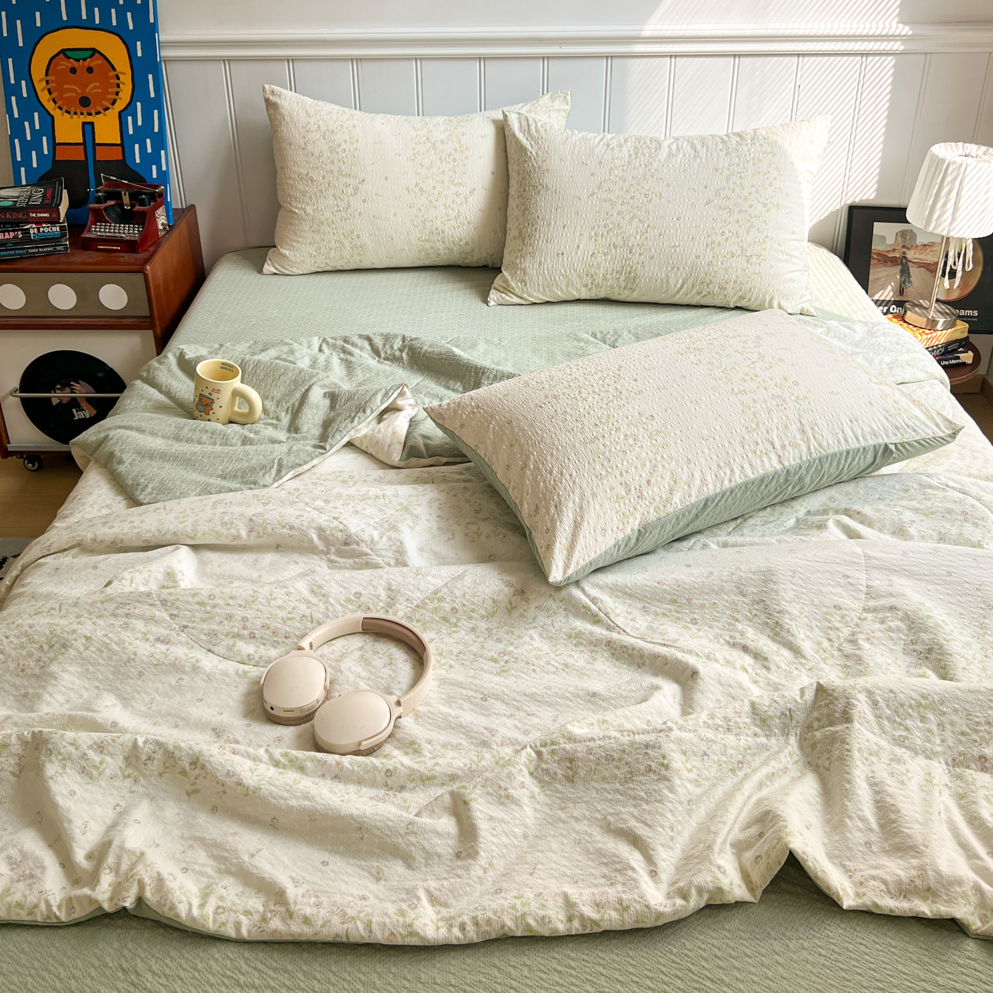 禾沐 2026新款云感泡芙纱全棉蕾丝花边款夏被四件套 田园免,田园免