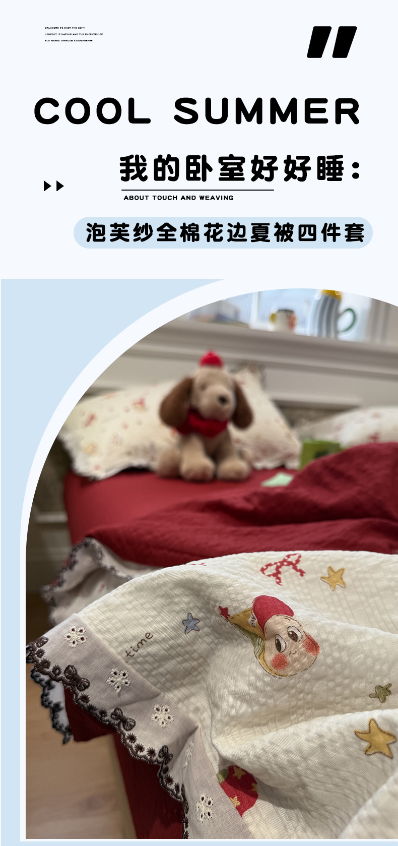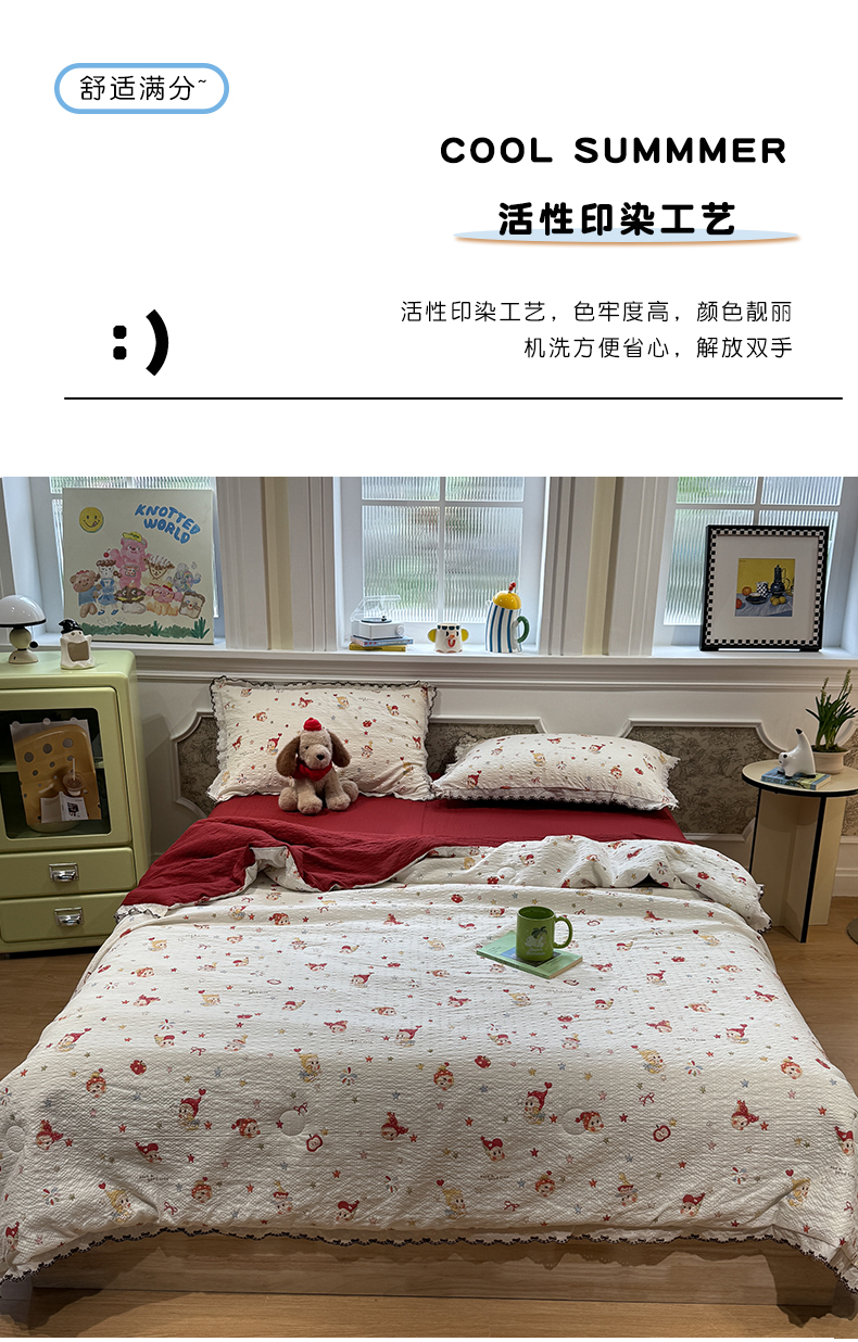 (总)水墨江南 2026新款泡芙纱花边夏被四件套,波点蝴蝶,蛋糕星仔,动感小狗,粉色小兔,红果果,可爱熊,快乐云朵,浪漫粉黛,猫猫聚会,奶酪星仔,幸运小狗,紫色小兔,hello星仔,组合图仅供参考