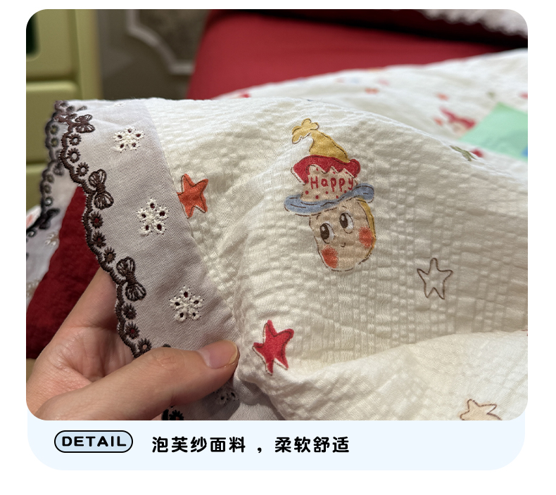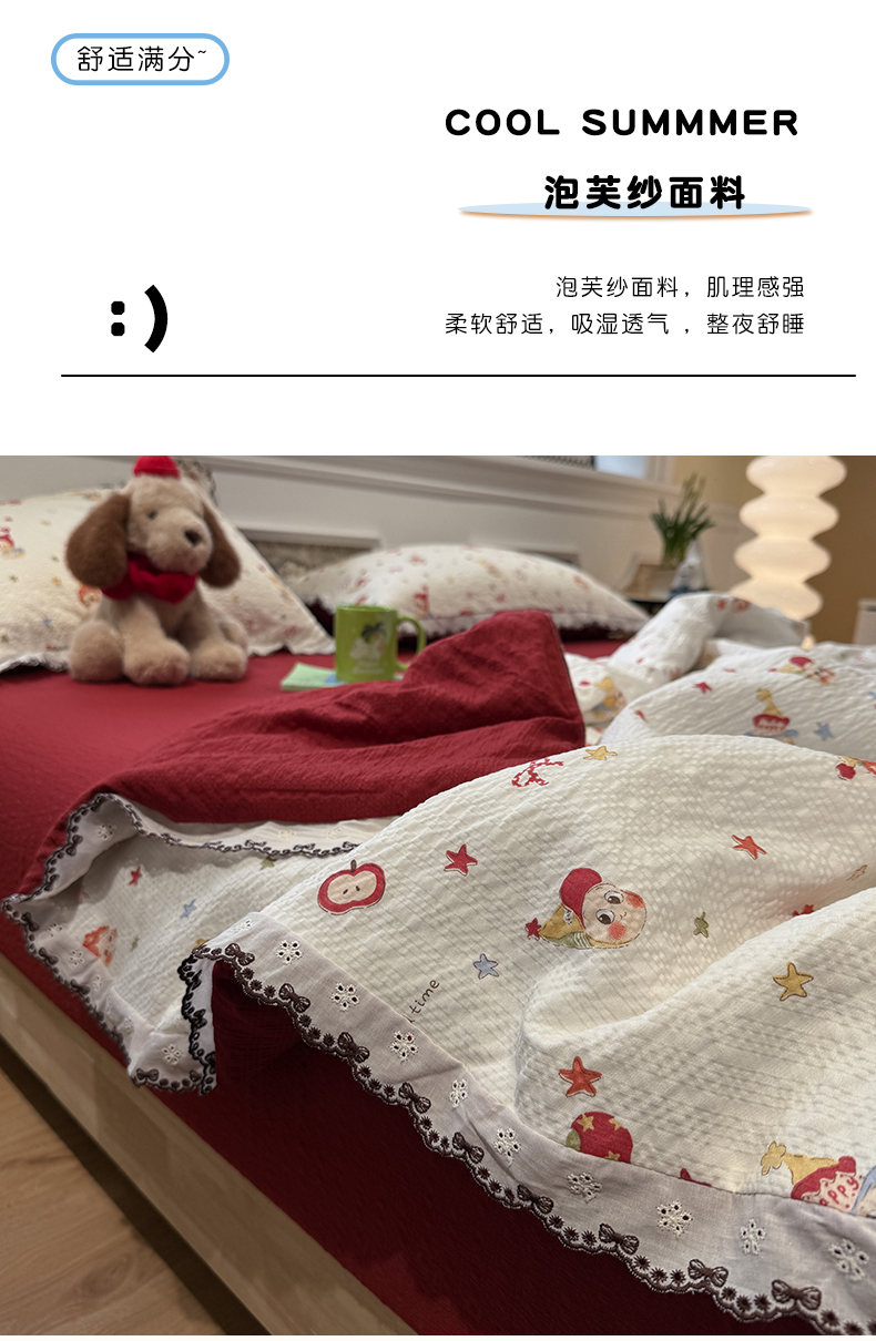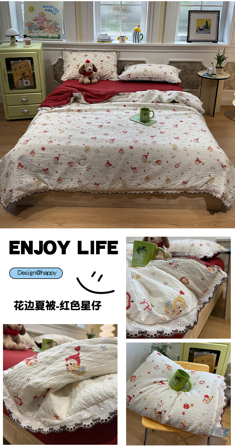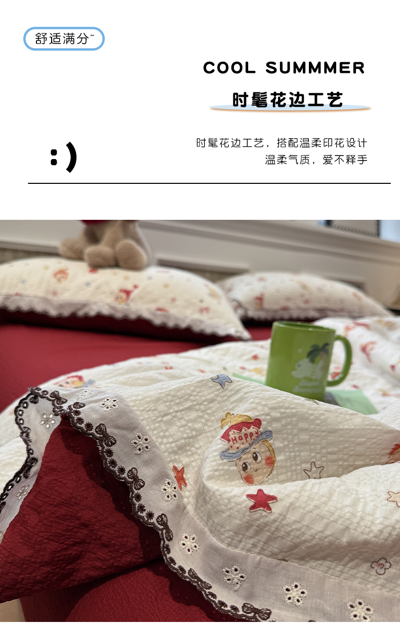 商品名称:水墨江南 2026新款泡芙纱全棉花边夏被四件套 花边夏被-红色星仔