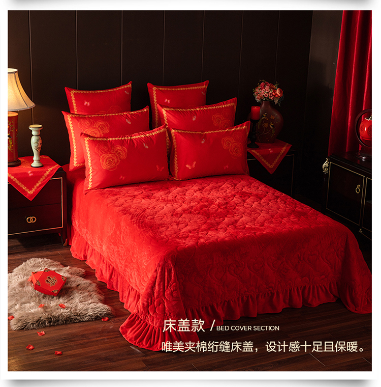 (总)宜凡家纺 2025新款婴儿绒压花全夹棉床盖四件套,韵雅-中国红,韵雅-黑天鹅