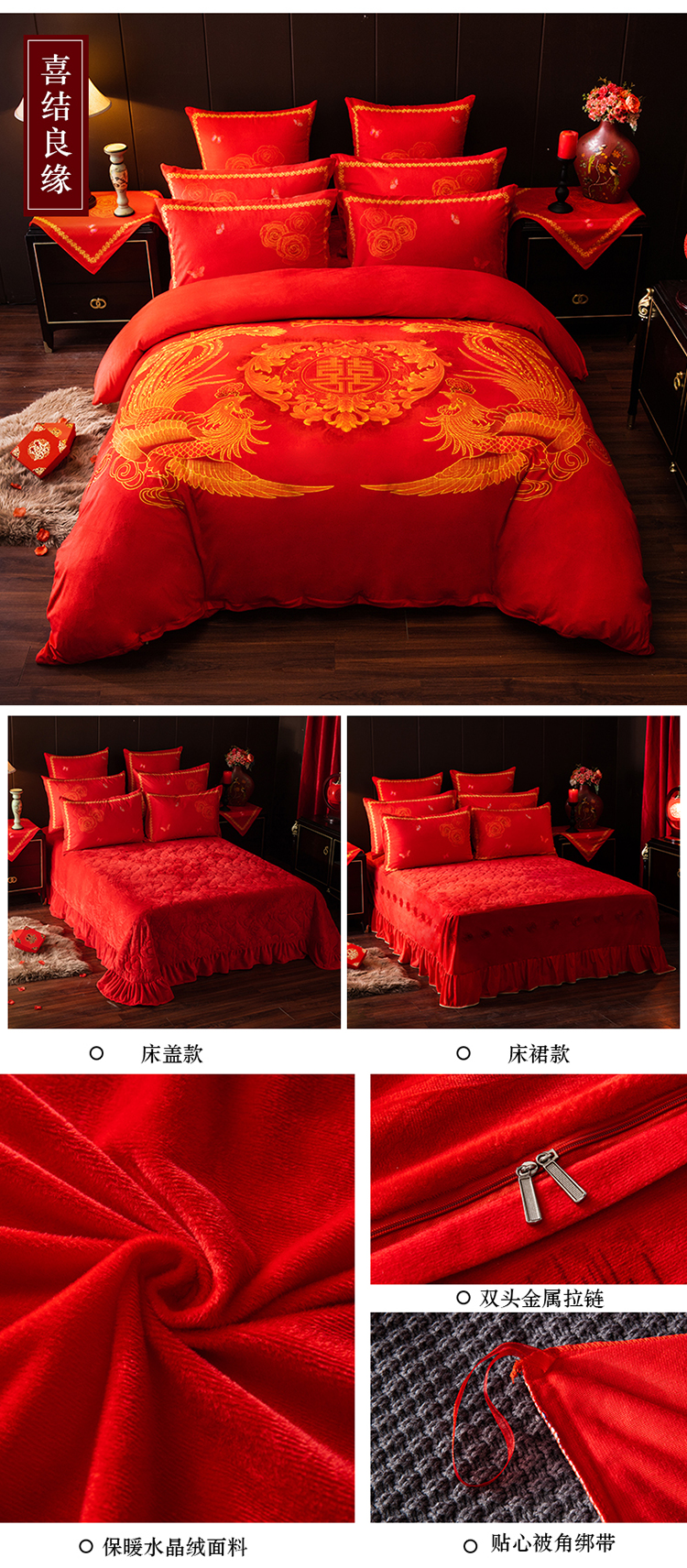 (总)宜凡家纺 2025新款婴儿绒压花全夹棉床裙四件套,韵雅-中国红,韵雅-黑天鹅