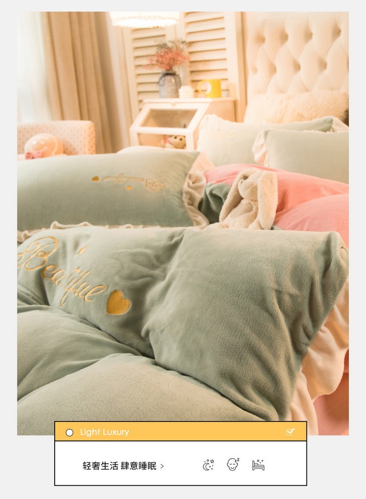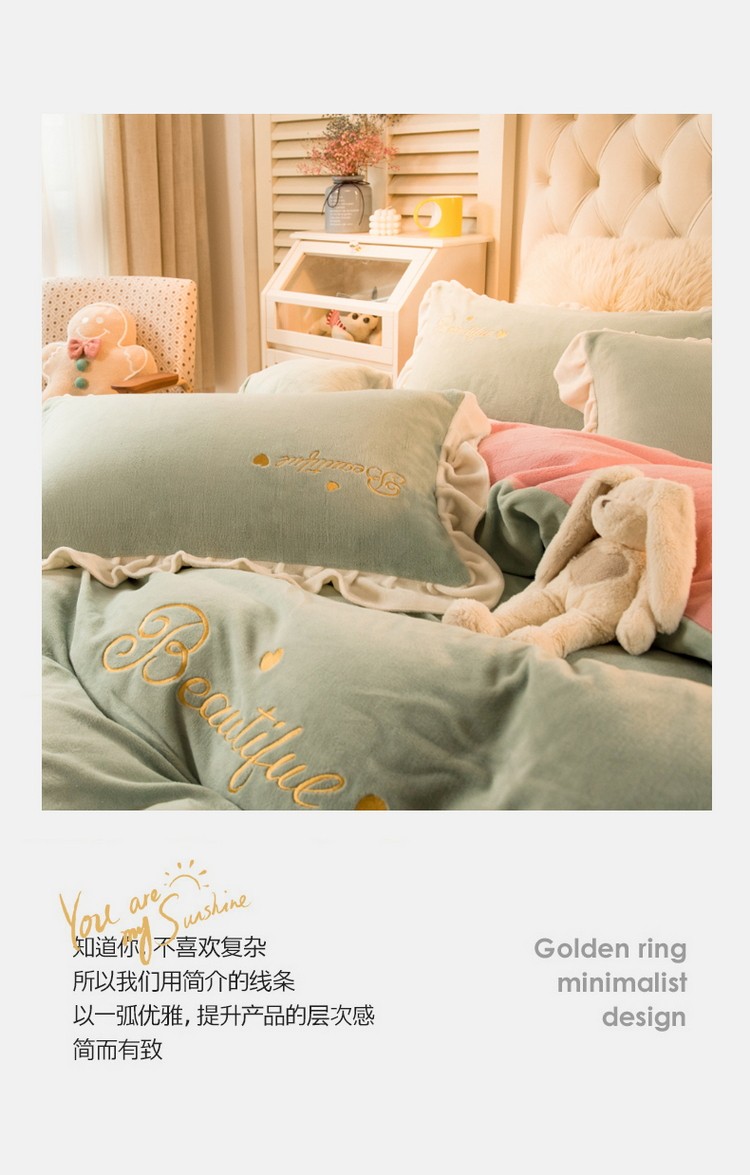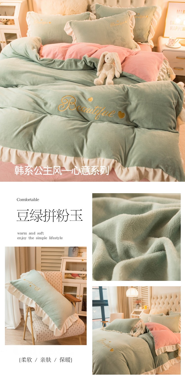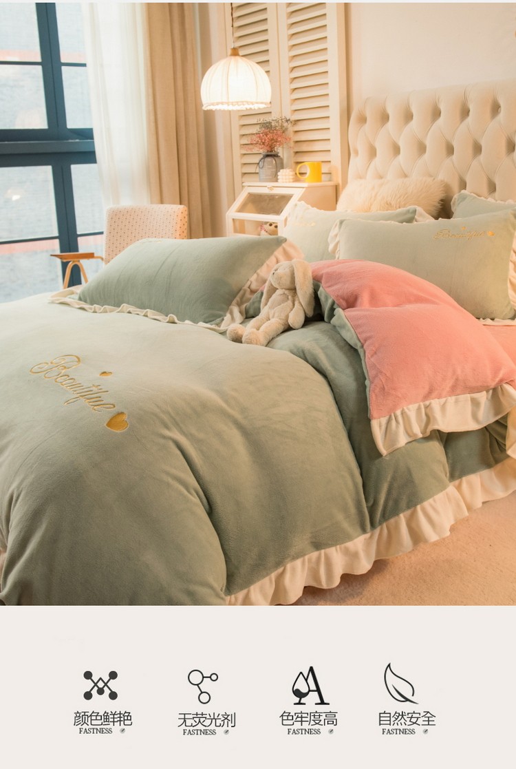 商品名称:丝羽坊 2021新款牛奶绒韩系心意系列四件套 豆绿拼粉玉