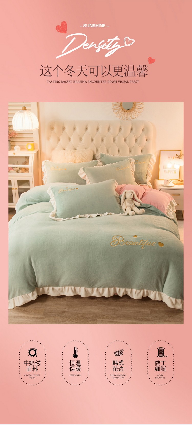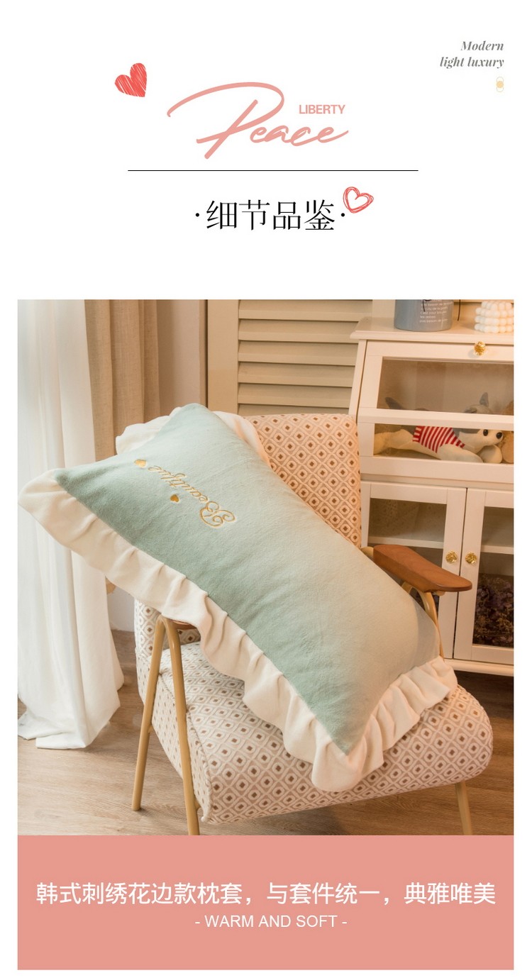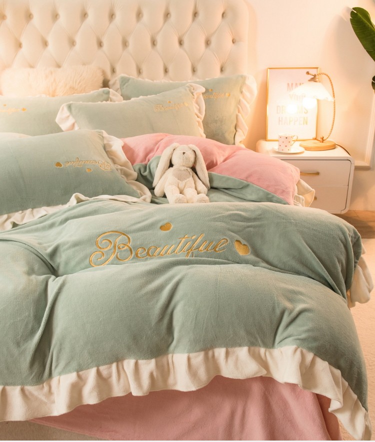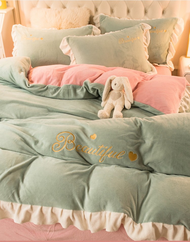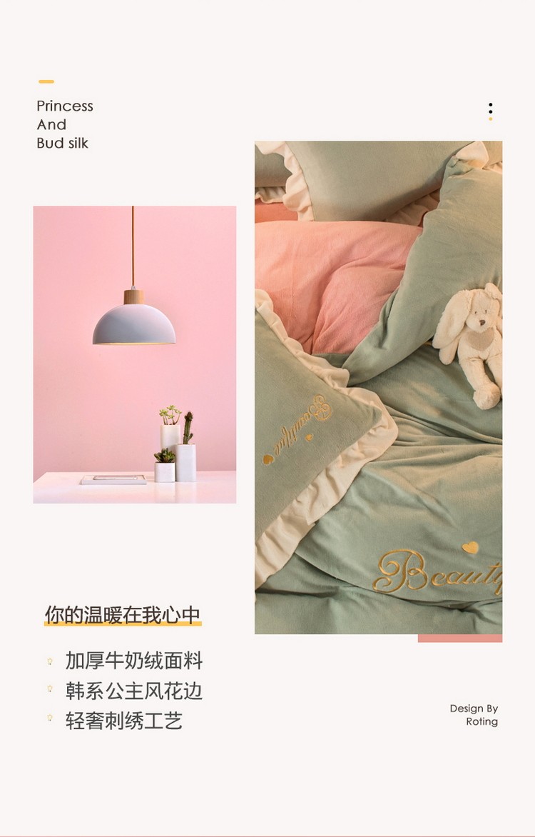 商品名称:丝羽坊 2021新款牛奶绒韩系心意系列四件套 豆绿拼粉玉