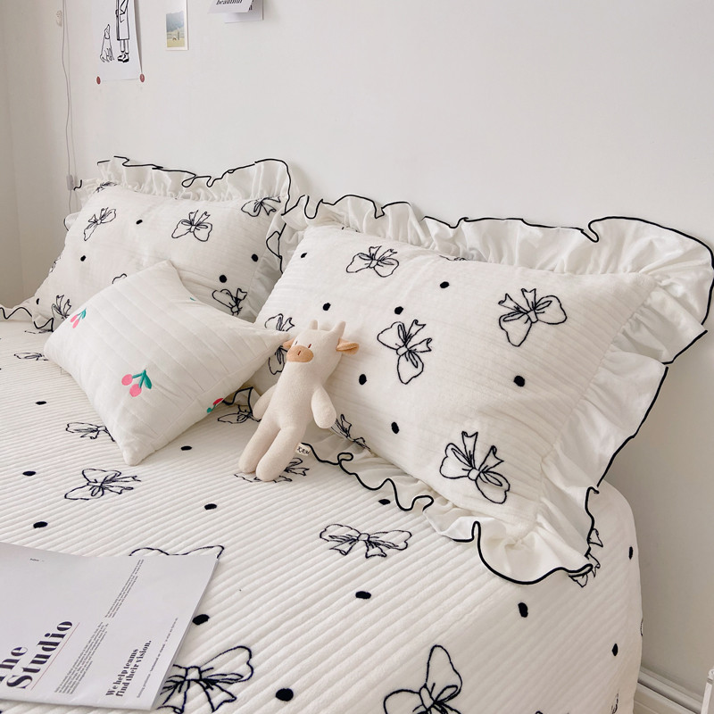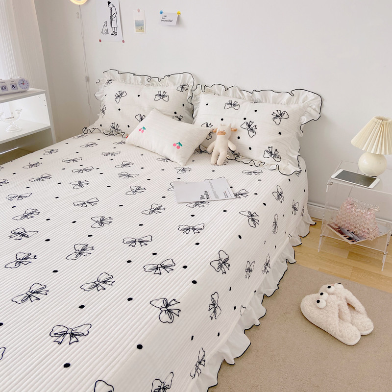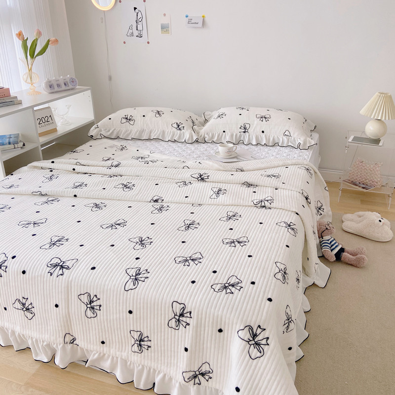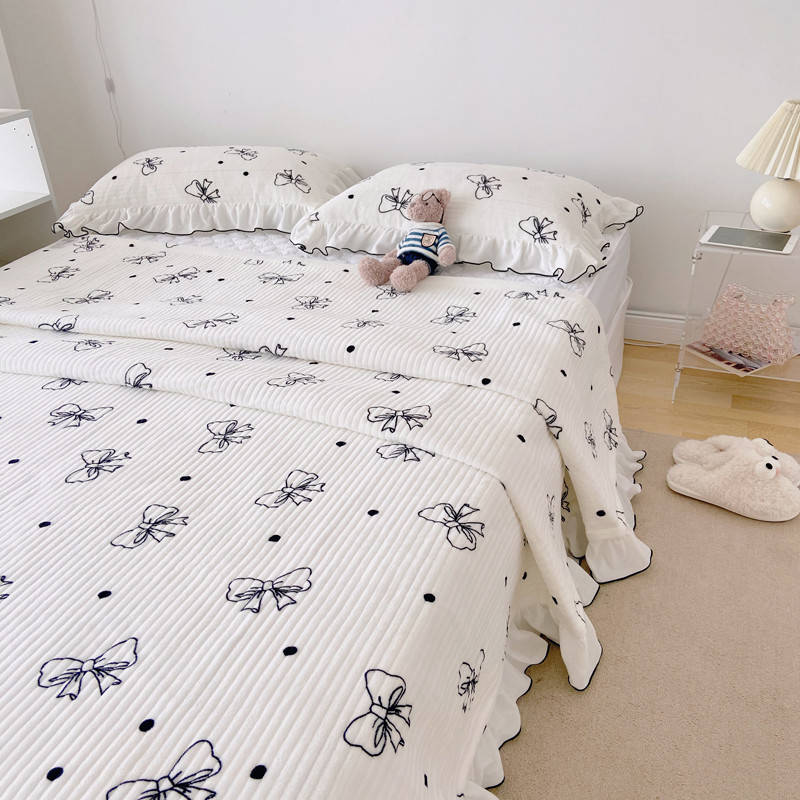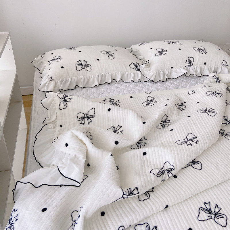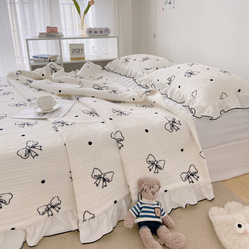 (总)漫调家纺 2025新款全棉ins风蝴蝶结韩系奶油花边床盖三件套,奶油白,奶油粉,奶油杏