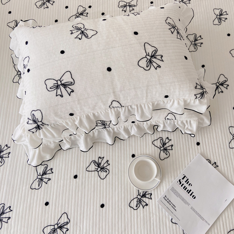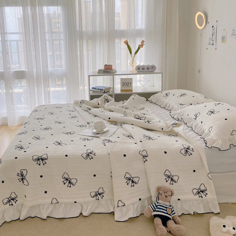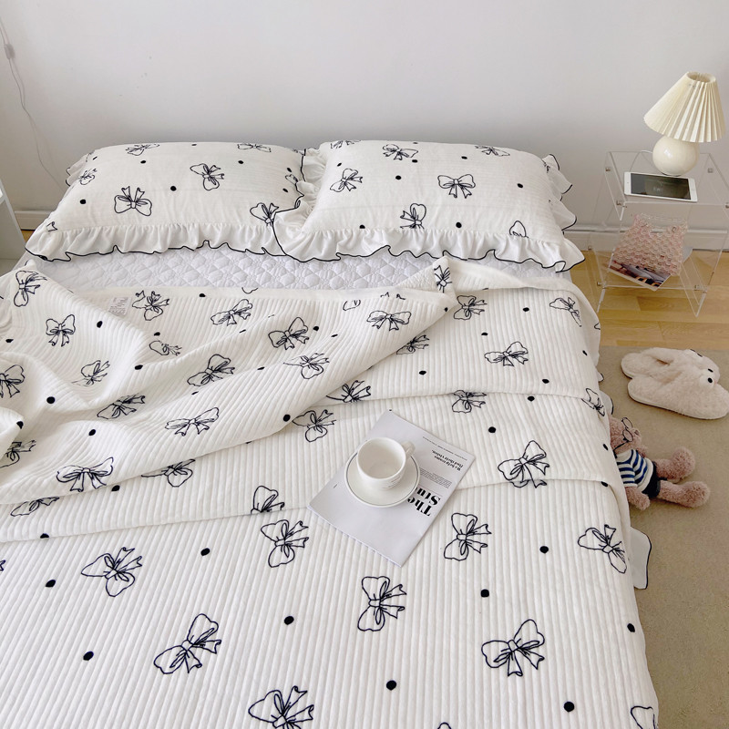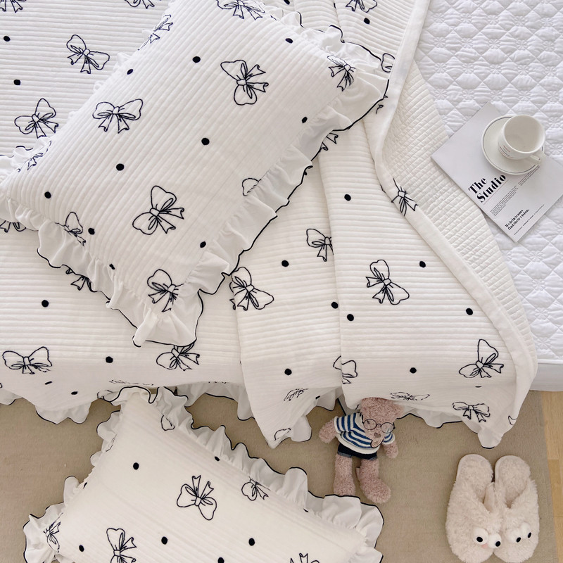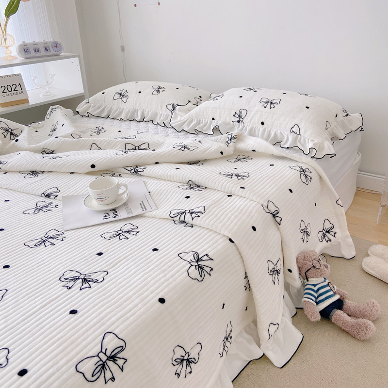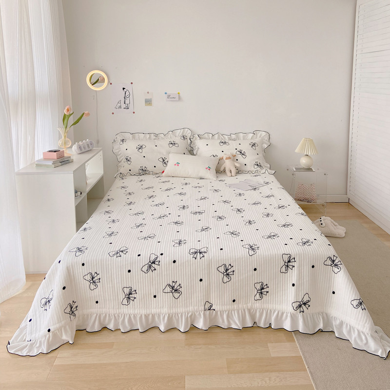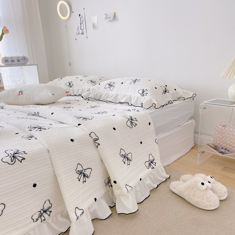 (总)漫调家纺 2025新款全棉ins风蝴蝶结韩系奶油花边床盖三件套,奶油白,奶油粉,奶油杏