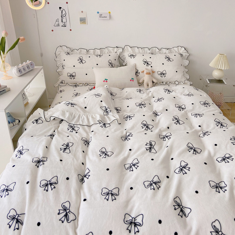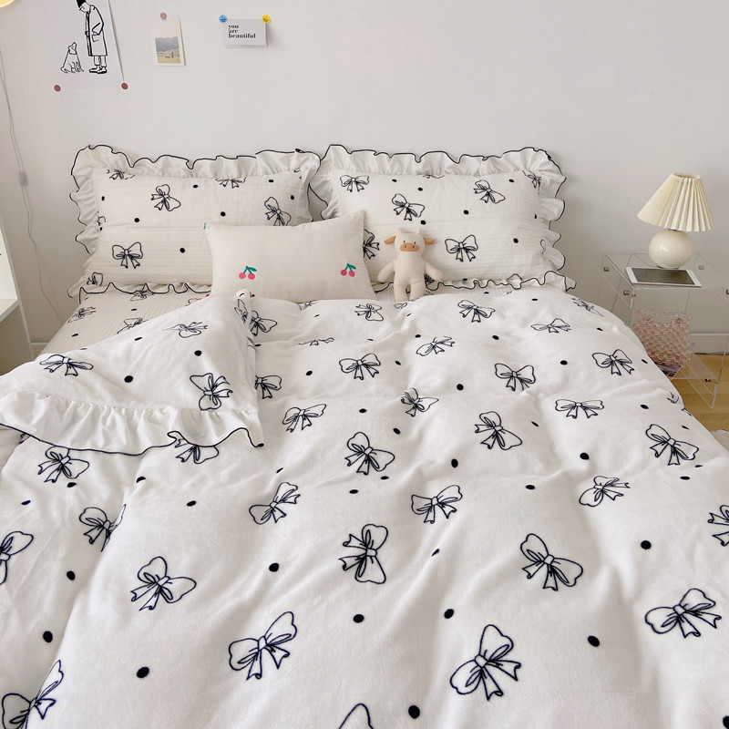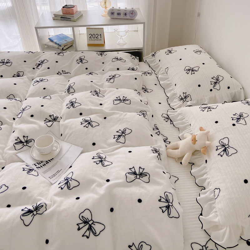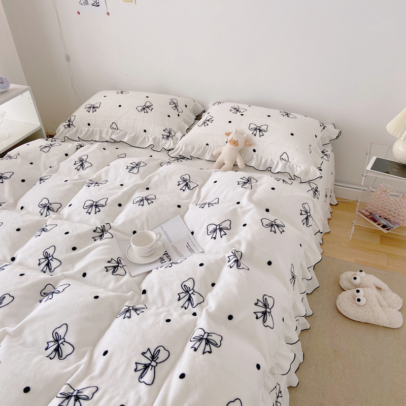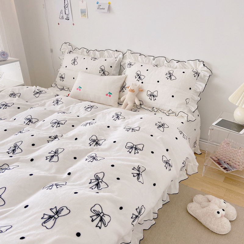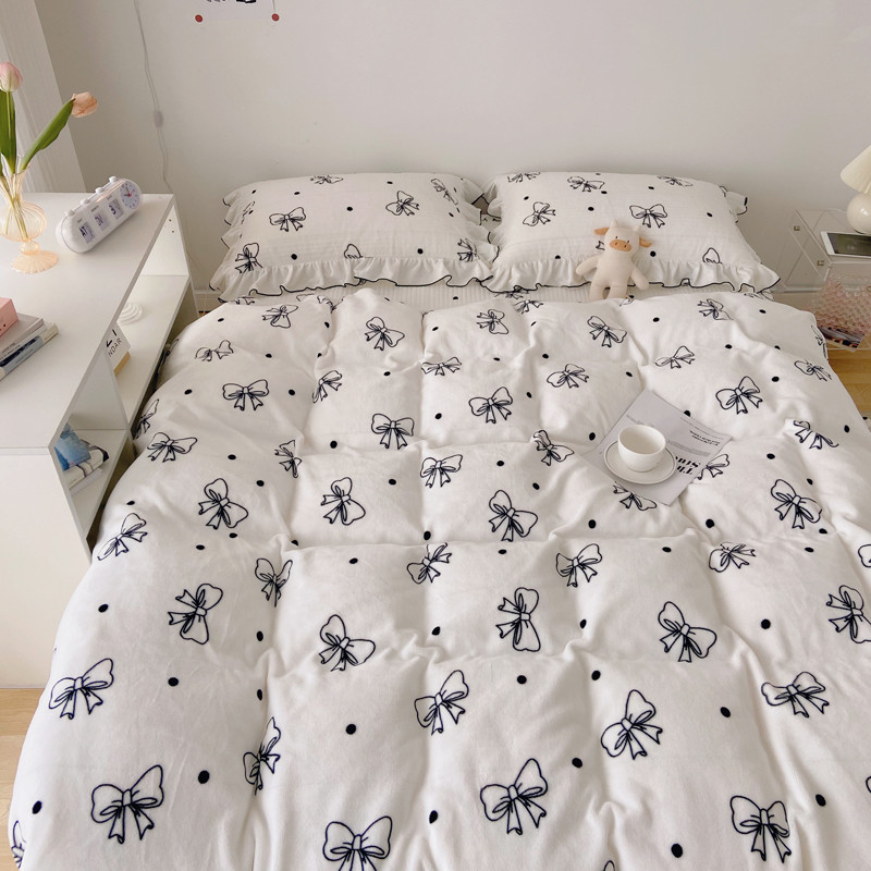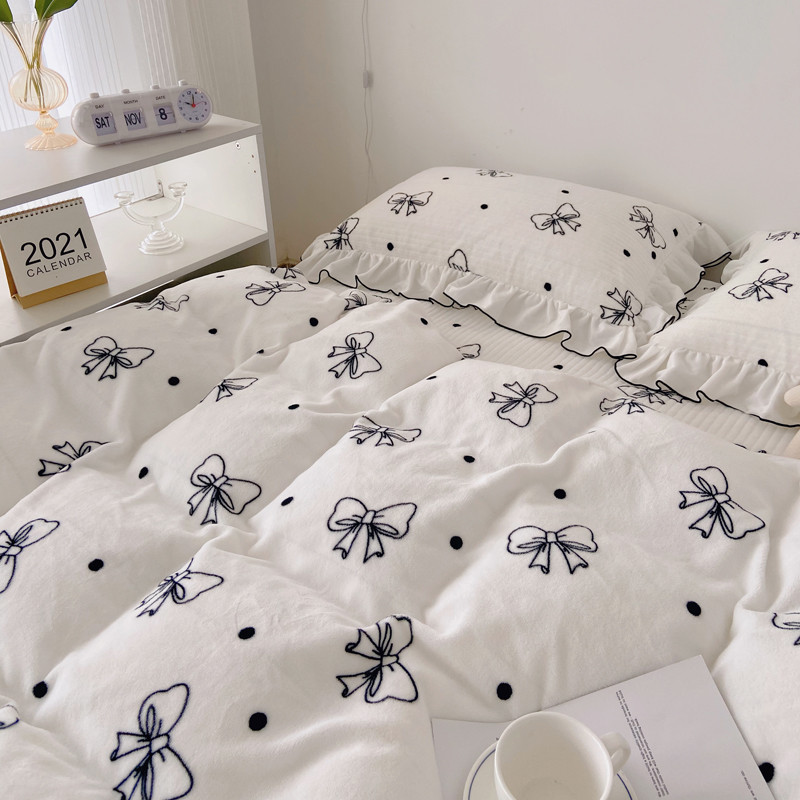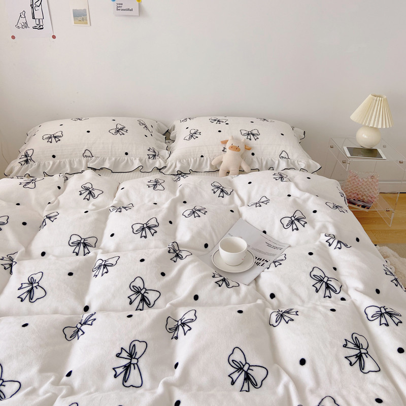 漫调 2021新款ins风波点黑白系列小清新牛奶绒床盖四件套 蝴蝶结