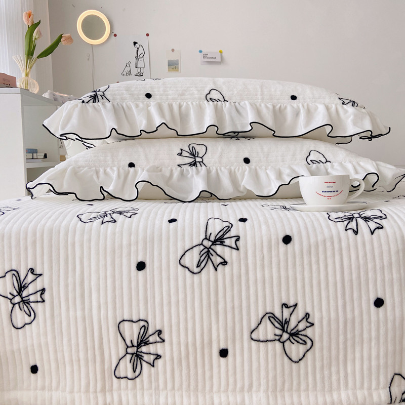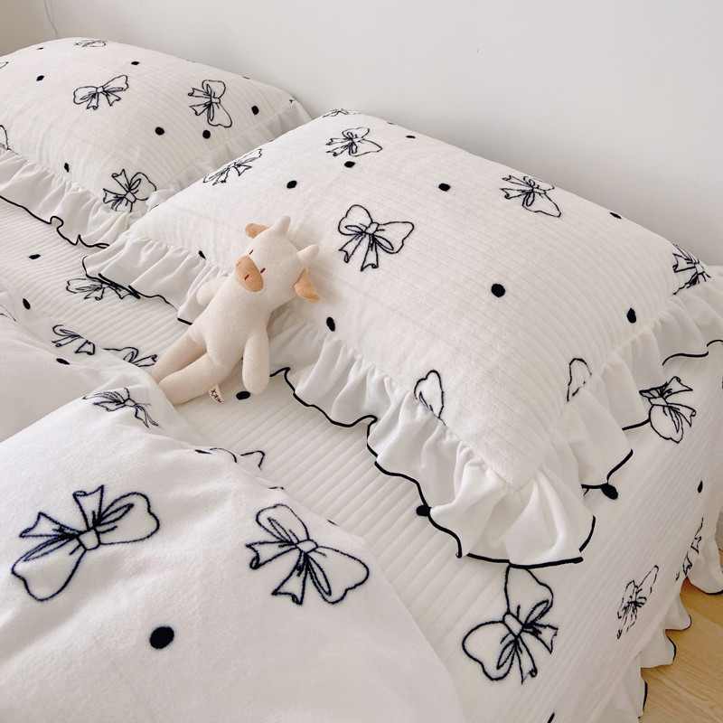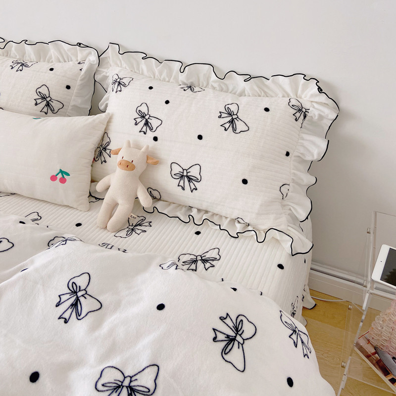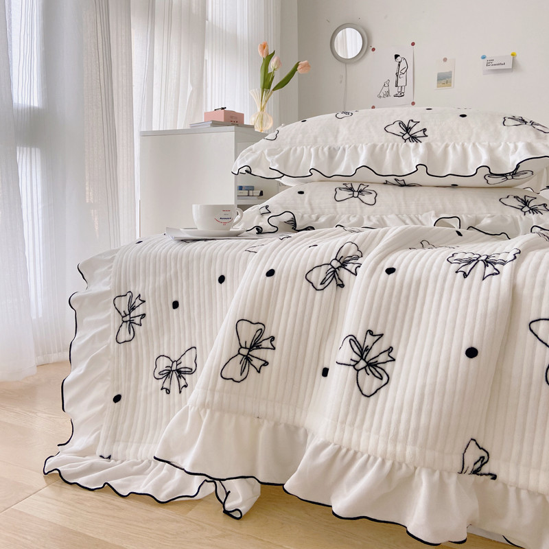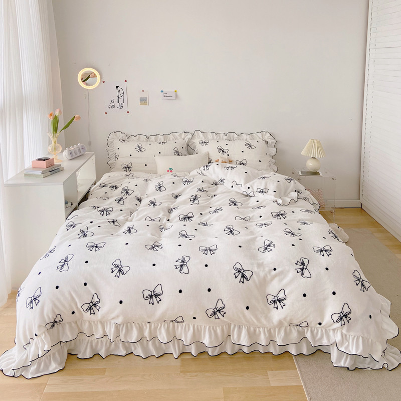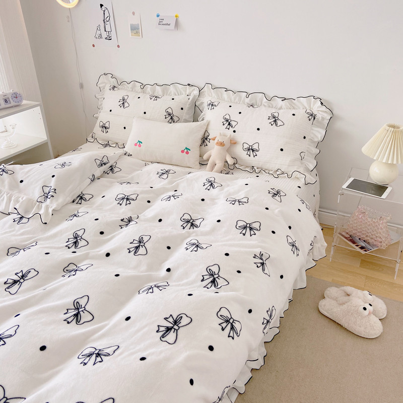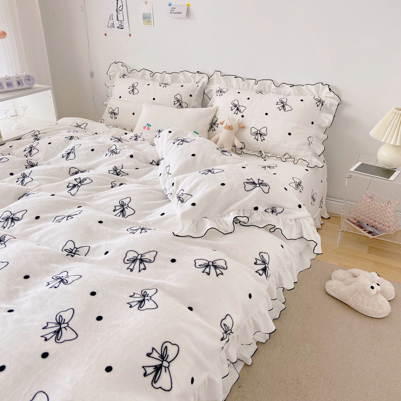 漫调 2021新款ins风波点黑白系列小清新牛奶绒床盖四件套 蝴蝶结
