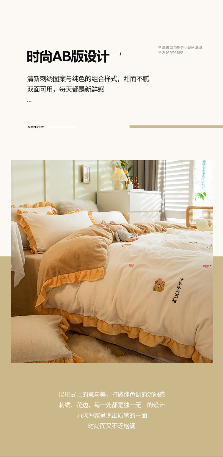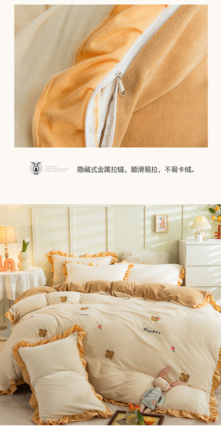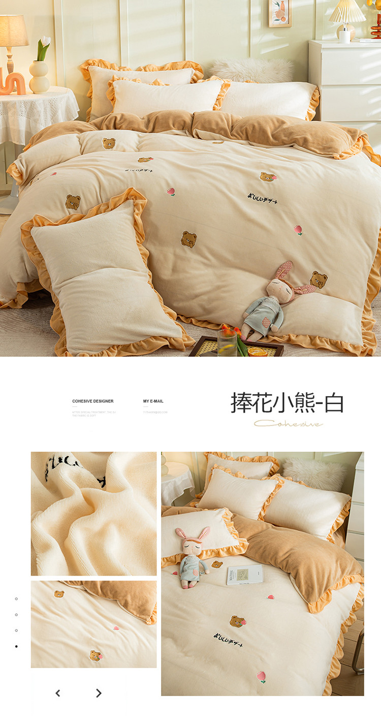 沐辰 2021新款超厚韩版刺绣牛奶绒四件套 捧花小熊-白