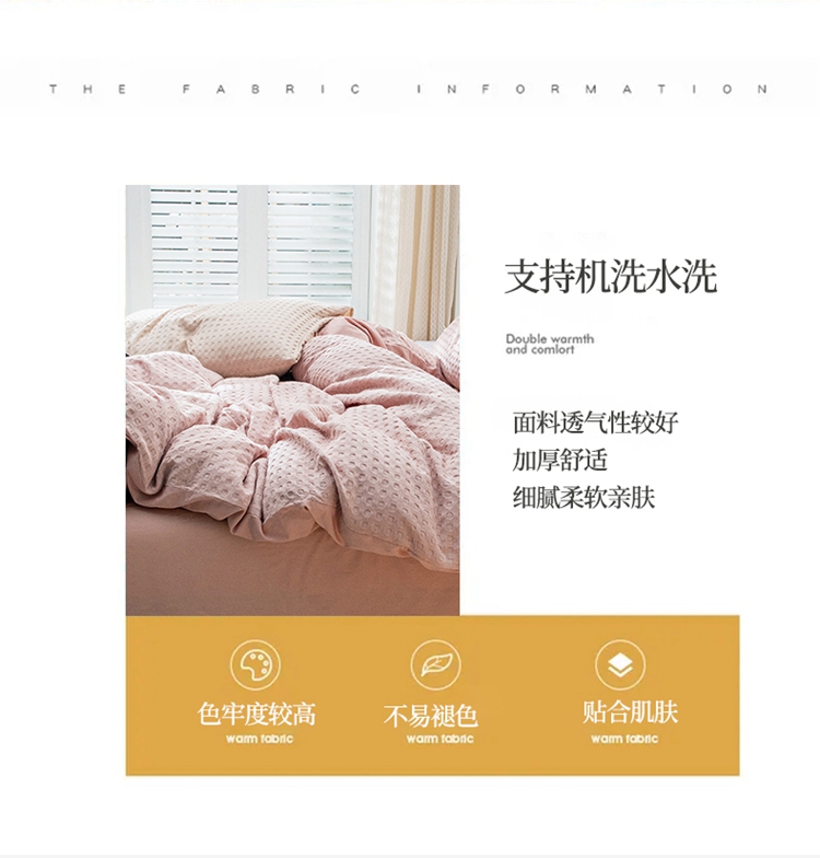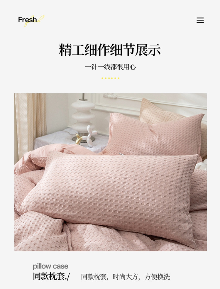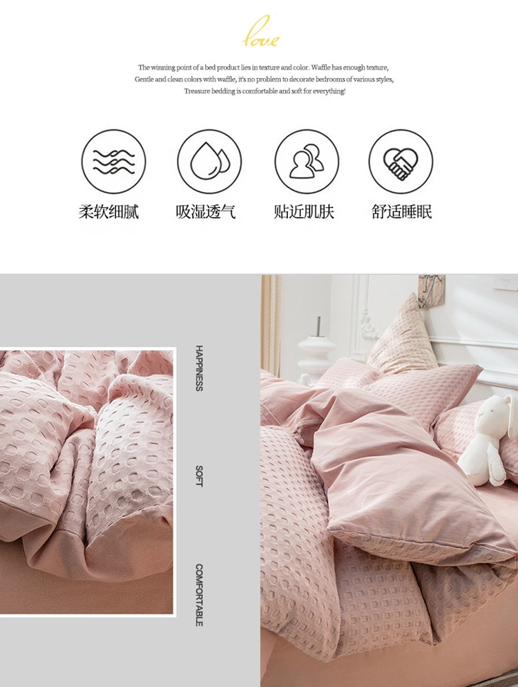 当前位置: 91家纺网 > 商品网购 > 床品套件 > 四件套 > 全棉普通四件套 > 网客家纺 2024新款全棉华夫格四件套 爱洛粉