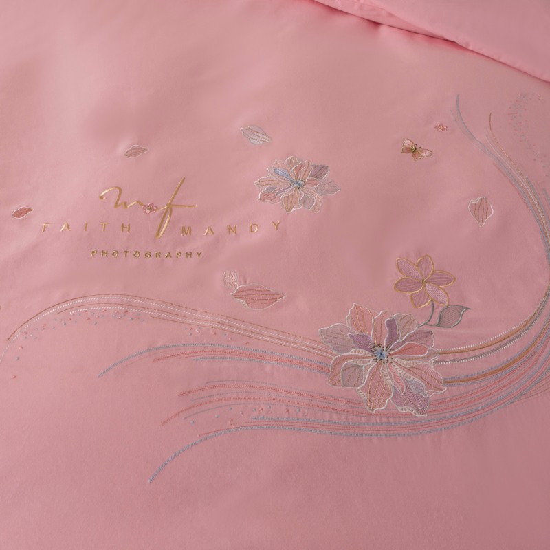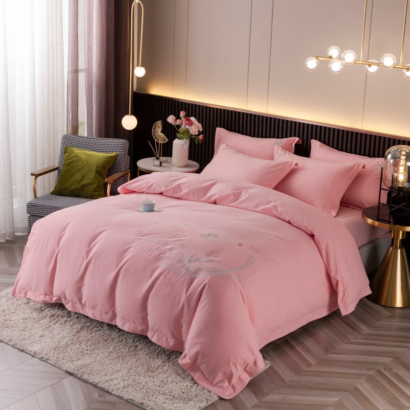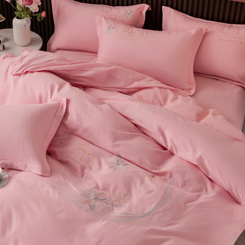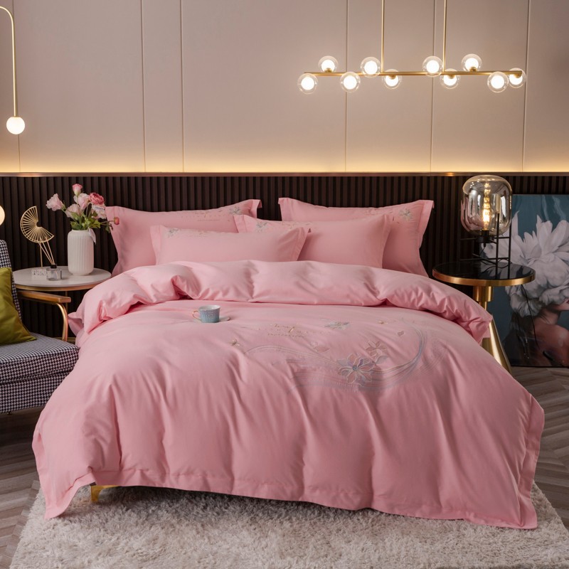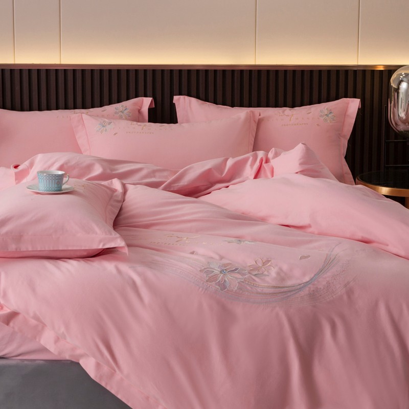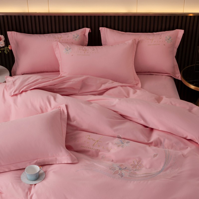 优姿 2022新款100S长绒棉宽边绣花四件套似锦年华-粉色