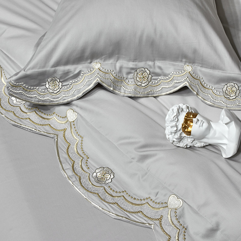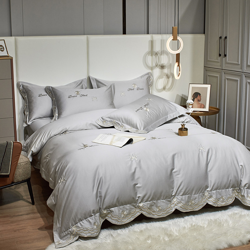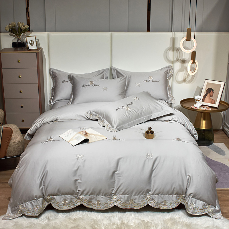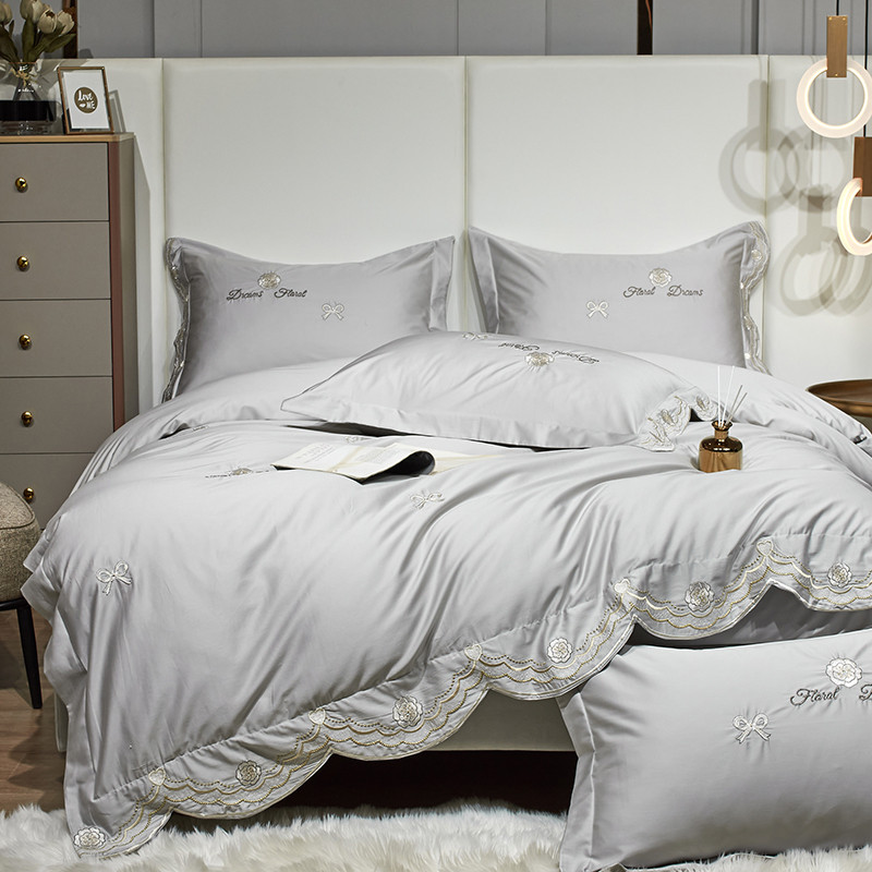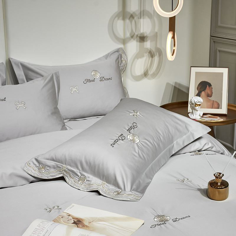 玖玖爱家纺 2022新款100支贡缎长绒棉刺绣四件套-香奈尔 香奈尔-浅灰