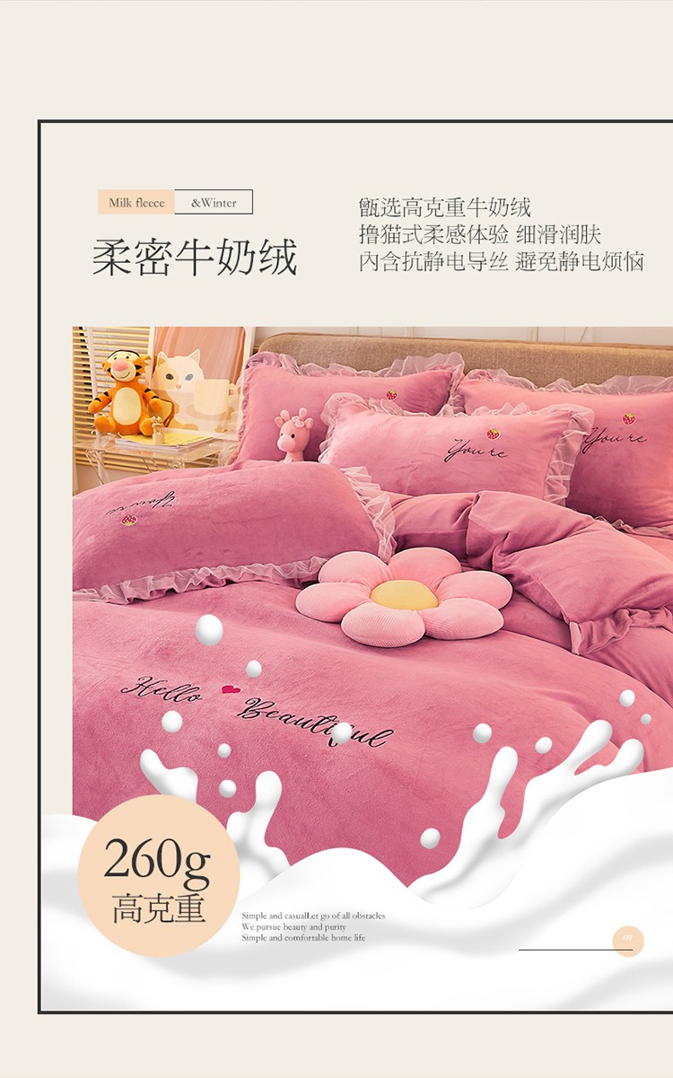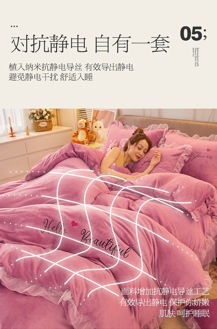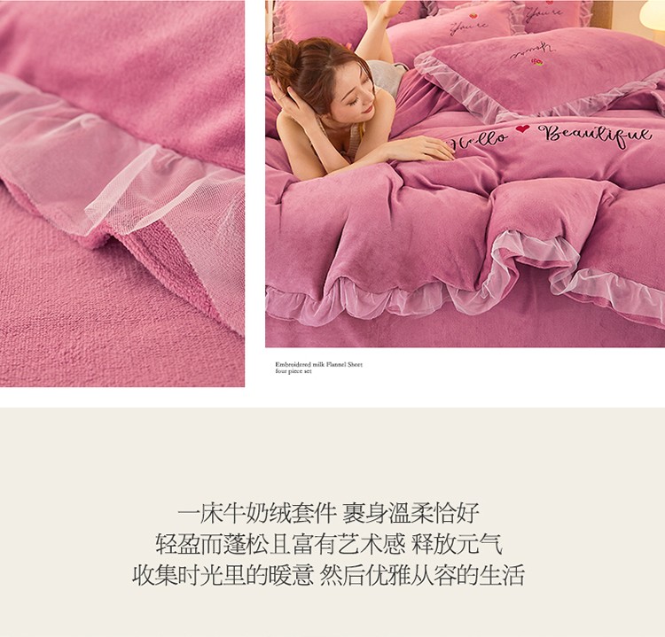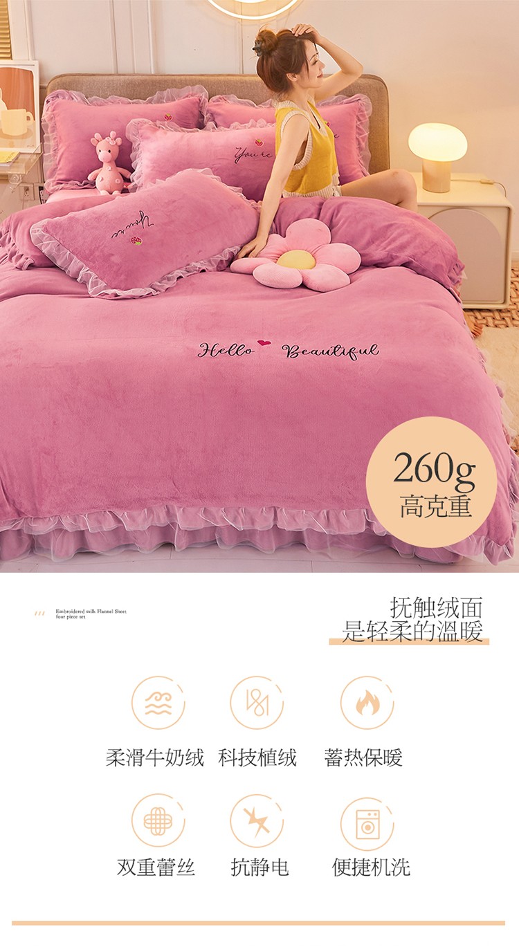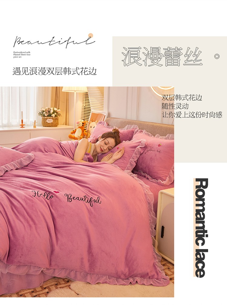 (总)找底底家纺 2025新款花边9-10斤牛奶绒床盖款四件套,花妖,梨花落,小樱桃,紫蔻