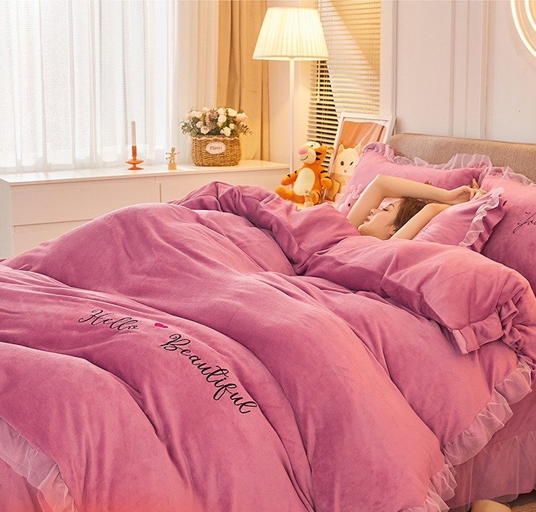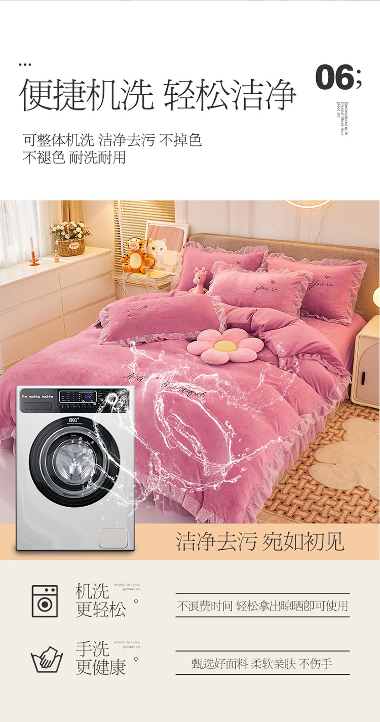 (总)找底底家纺 2022新款水晶绒蕾丝花边韩版四件套,大红,黛蓝,豆沙色,姜黄,墨绿,浅灰,玉女粉