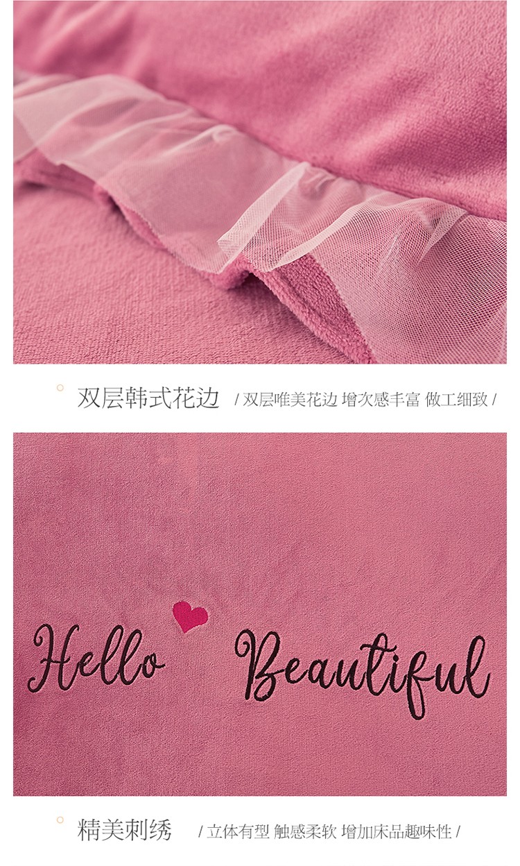 商品名称:找底底新款230g牛奶绒法莱绒刺绣蕾丝边床裙款四件套 豆沙色