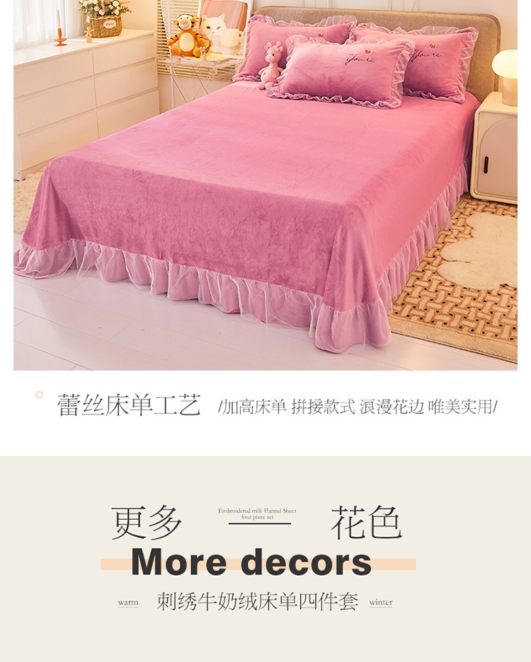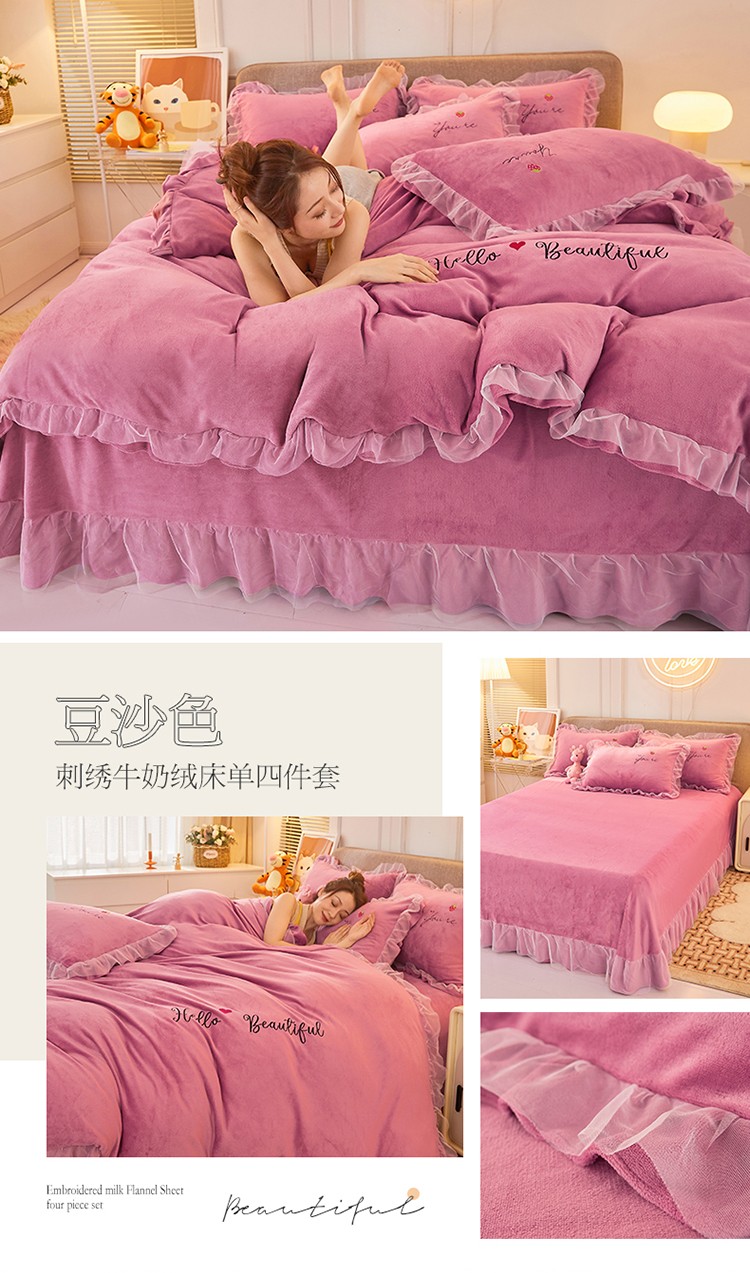 找底底2023新款230g牛奶绒法莱绒刺绣蕾丝边床裙款四件套,豆沙色,橘橙色,玛卡蓝,嫩黄,浅粉色,雾紫,质感灰
