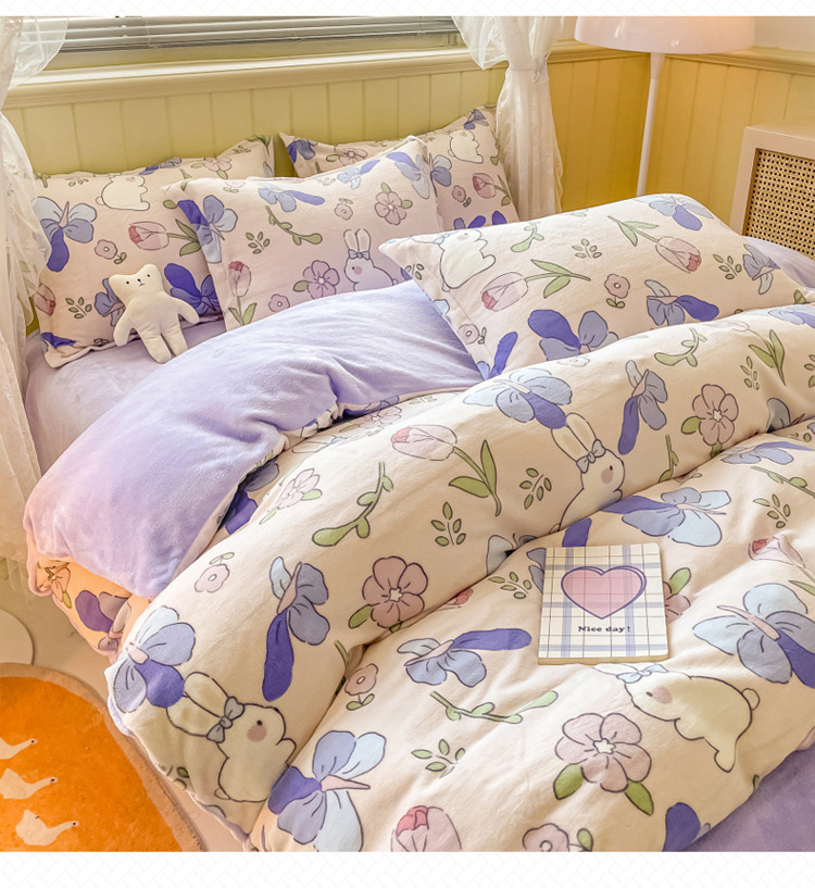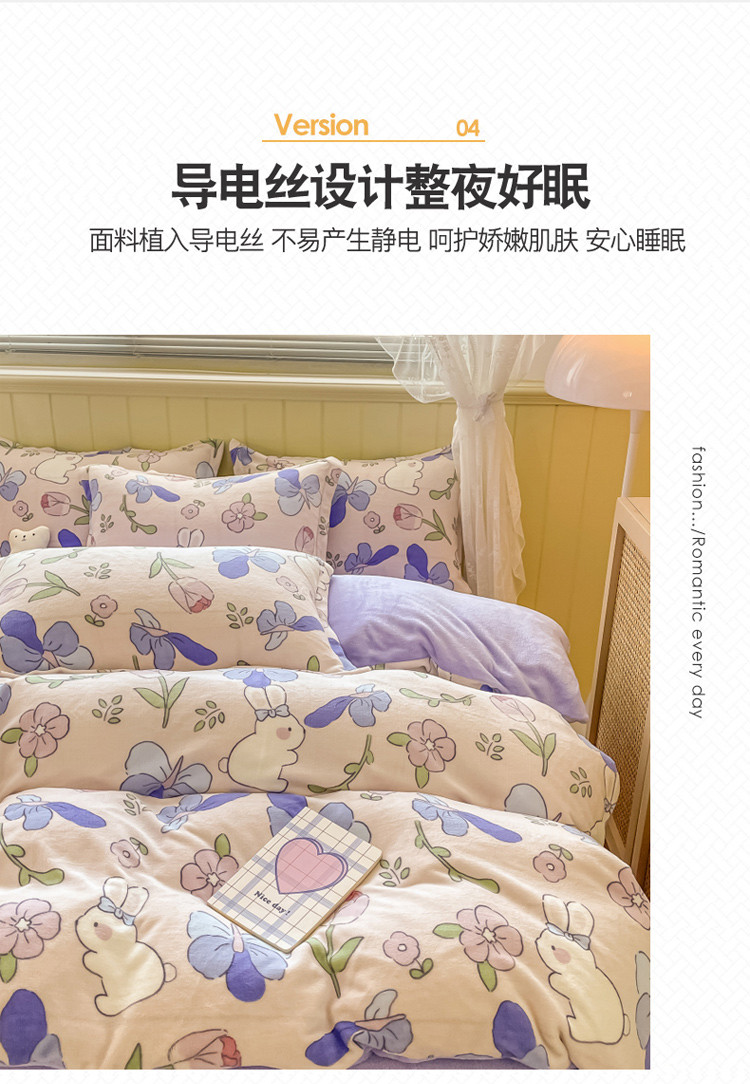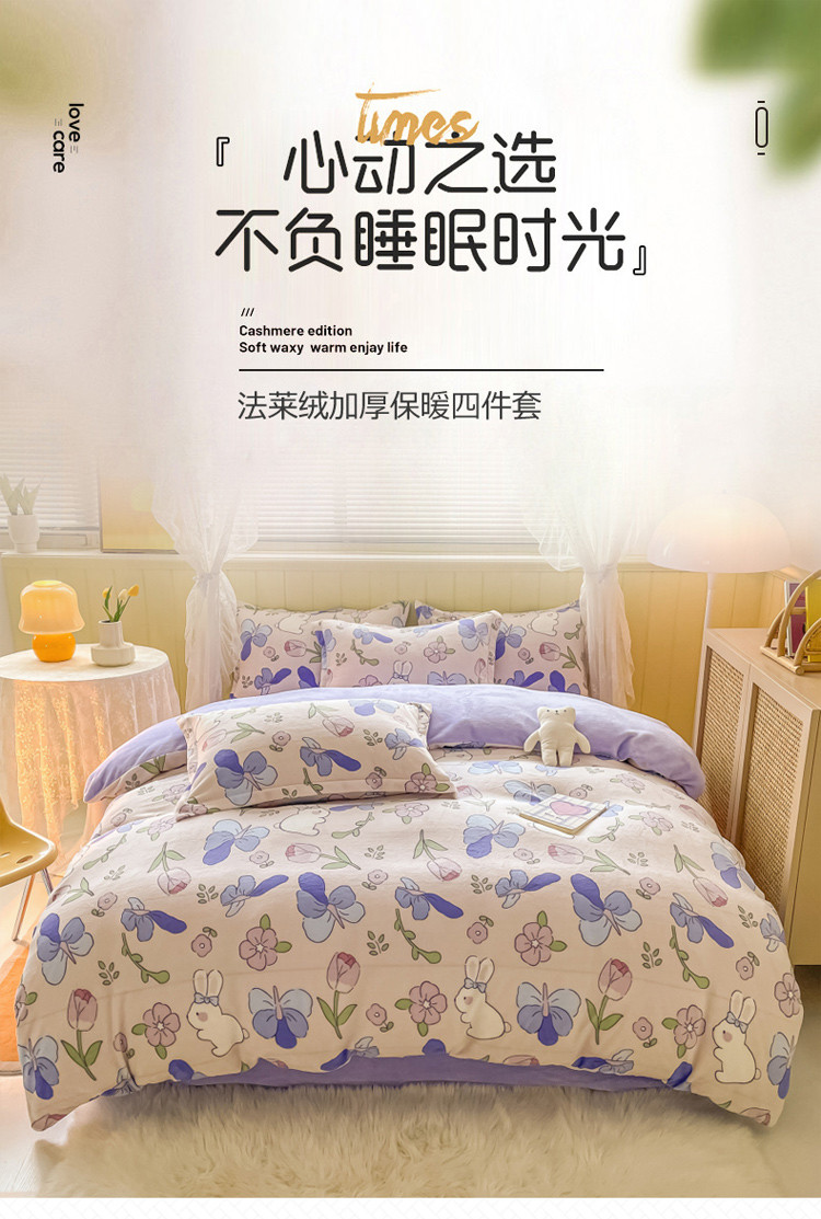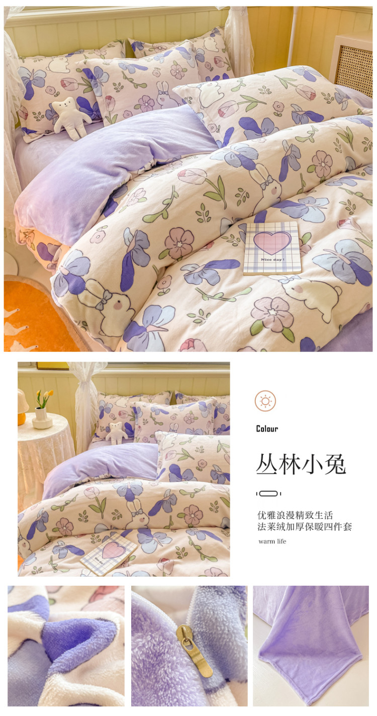 当前位置: 91家纺网 > 商品网购 > 床品套件 > 四件套 > 法莱绒四件套 > 柒月家居 2022新款小清新法莱绒四件套 丛林小兔