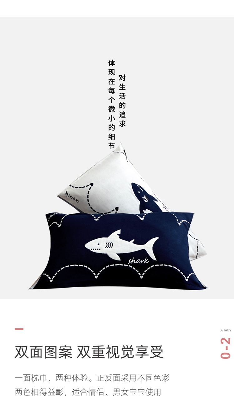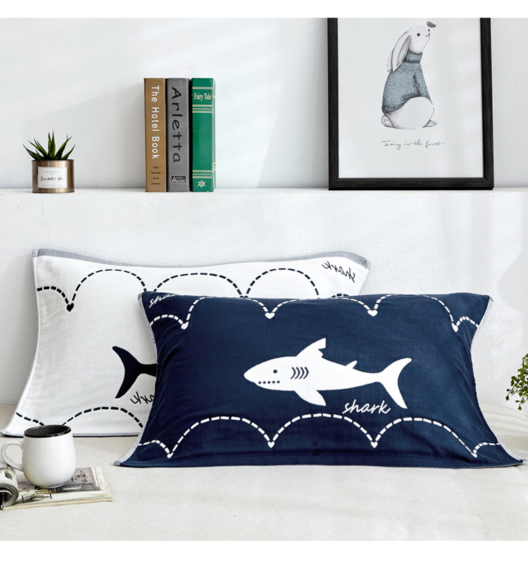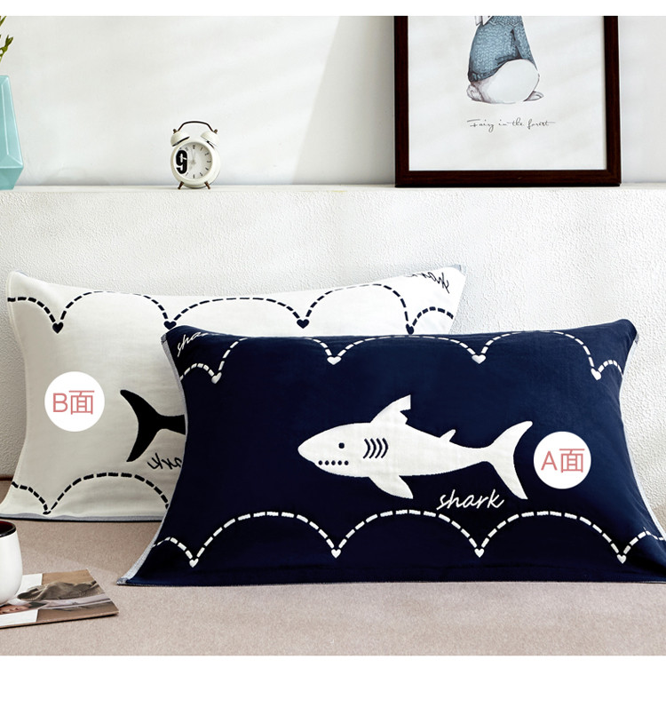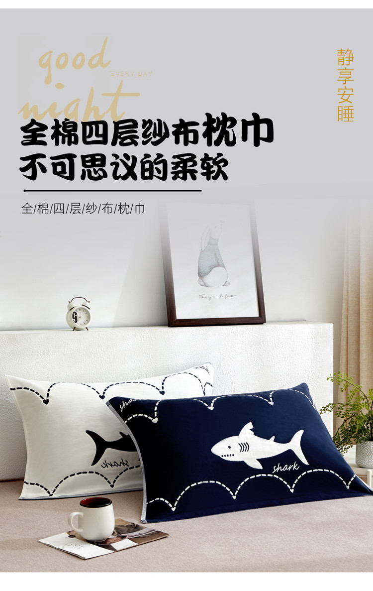朴尔 2022新款全棉四层纱布大版花独版枕巾(一对) 鲸鱼-藏青(50*80)