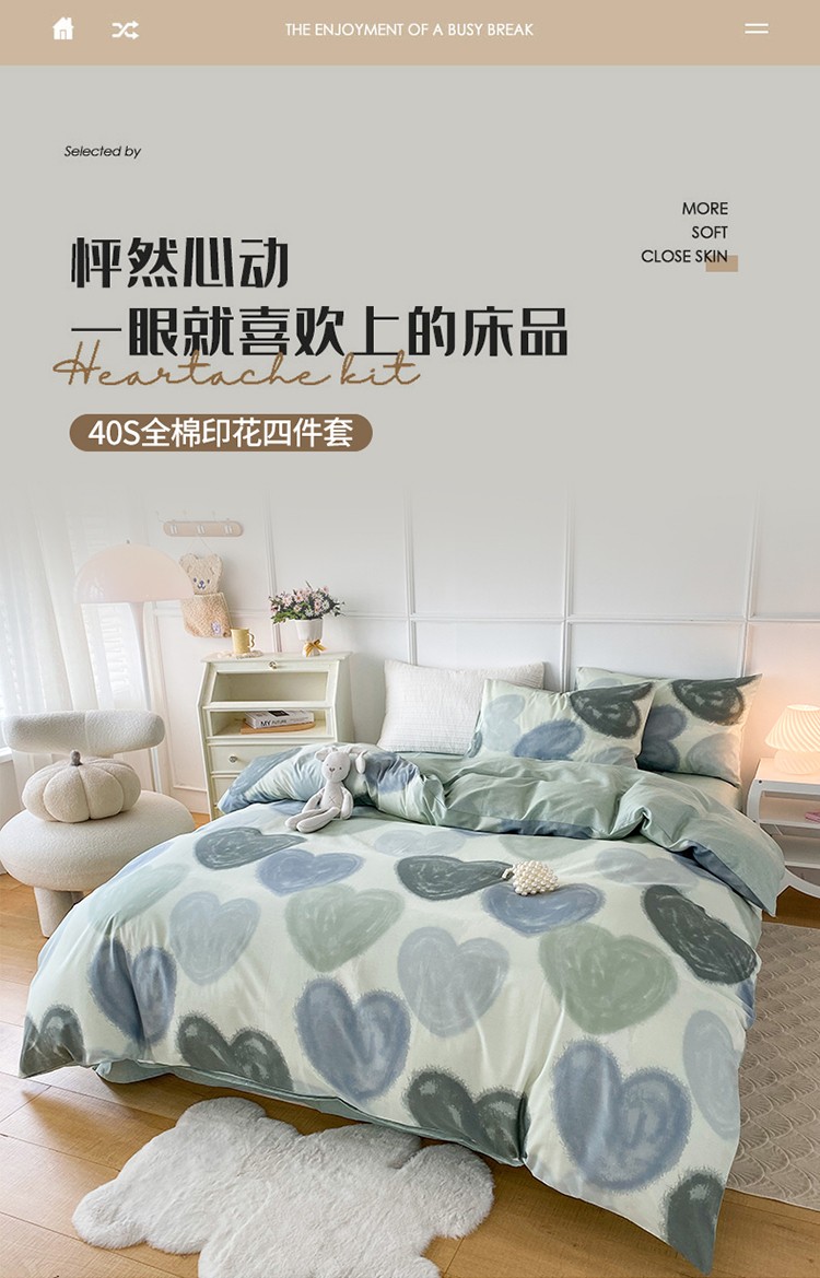 (总)珺柔 2023新款13070全棉四件套-第3批,宝宝兔,豹纹粉,北欧之春,都尚,风信子,浪漫花香,菱格熊,领结兔,绿光,玫瑰星球,梦的旋律-灰,梦的旋律-蓝,梦的旋律-绿,条纹爱心,兔时光,夏洛克,线条熊兔,小兔仙,永恒,油墨画