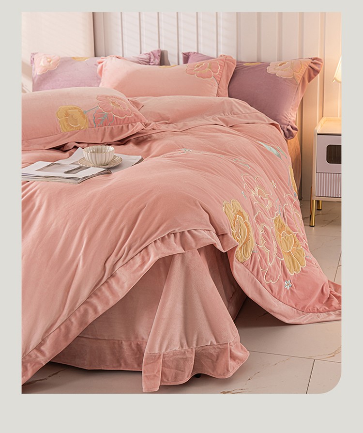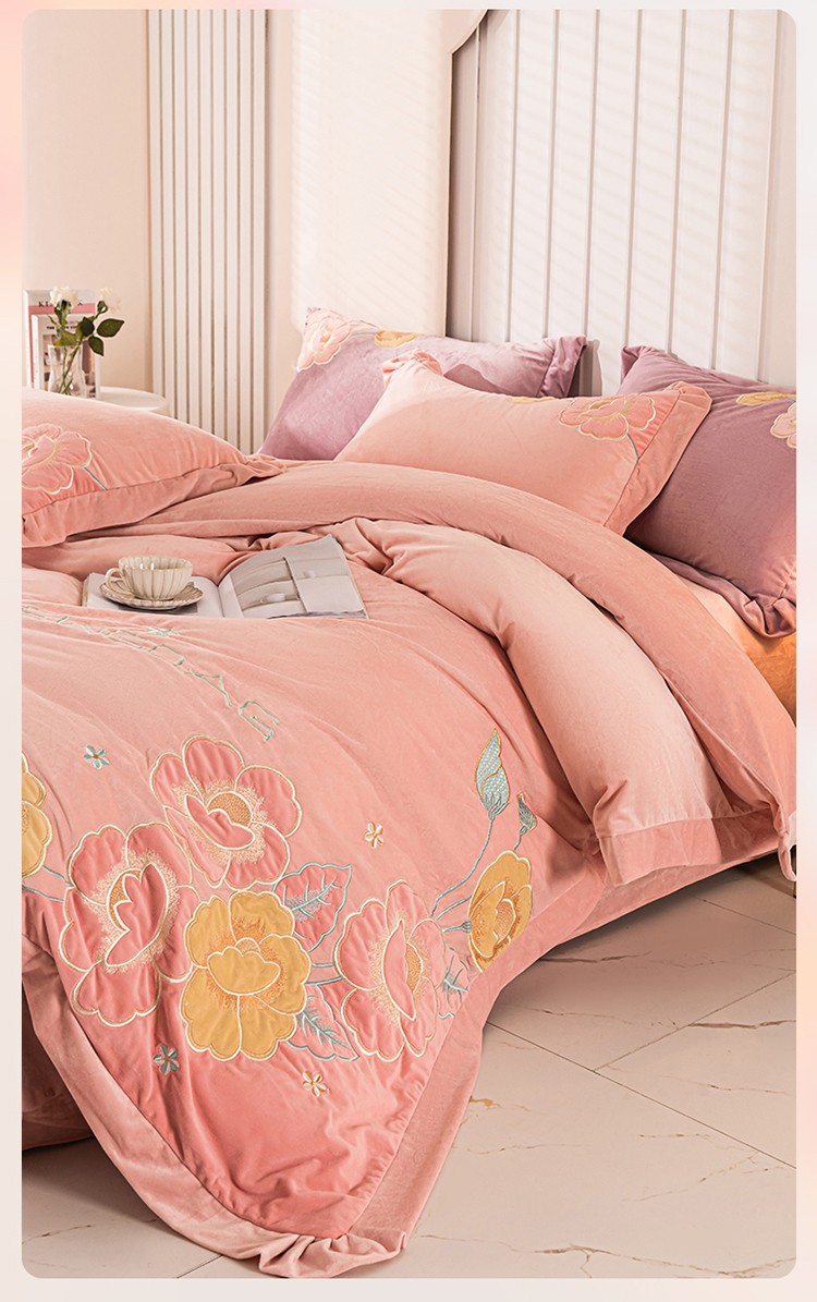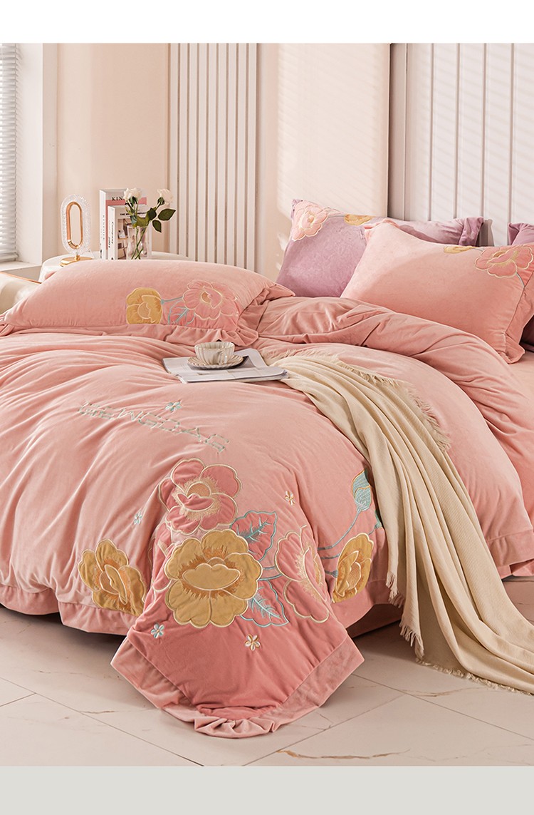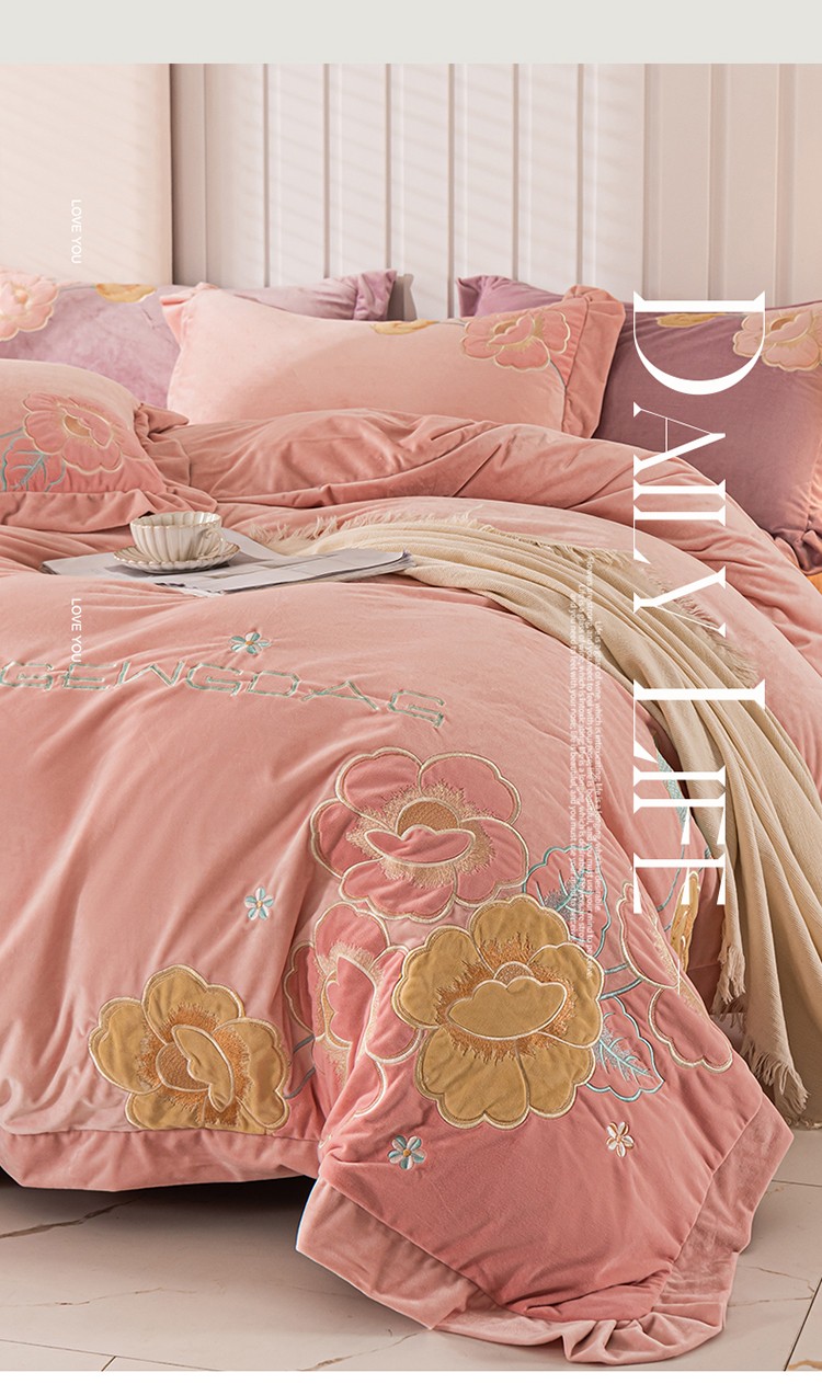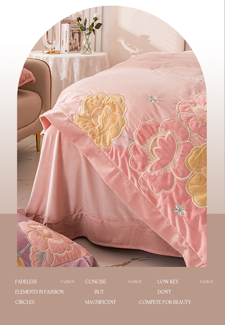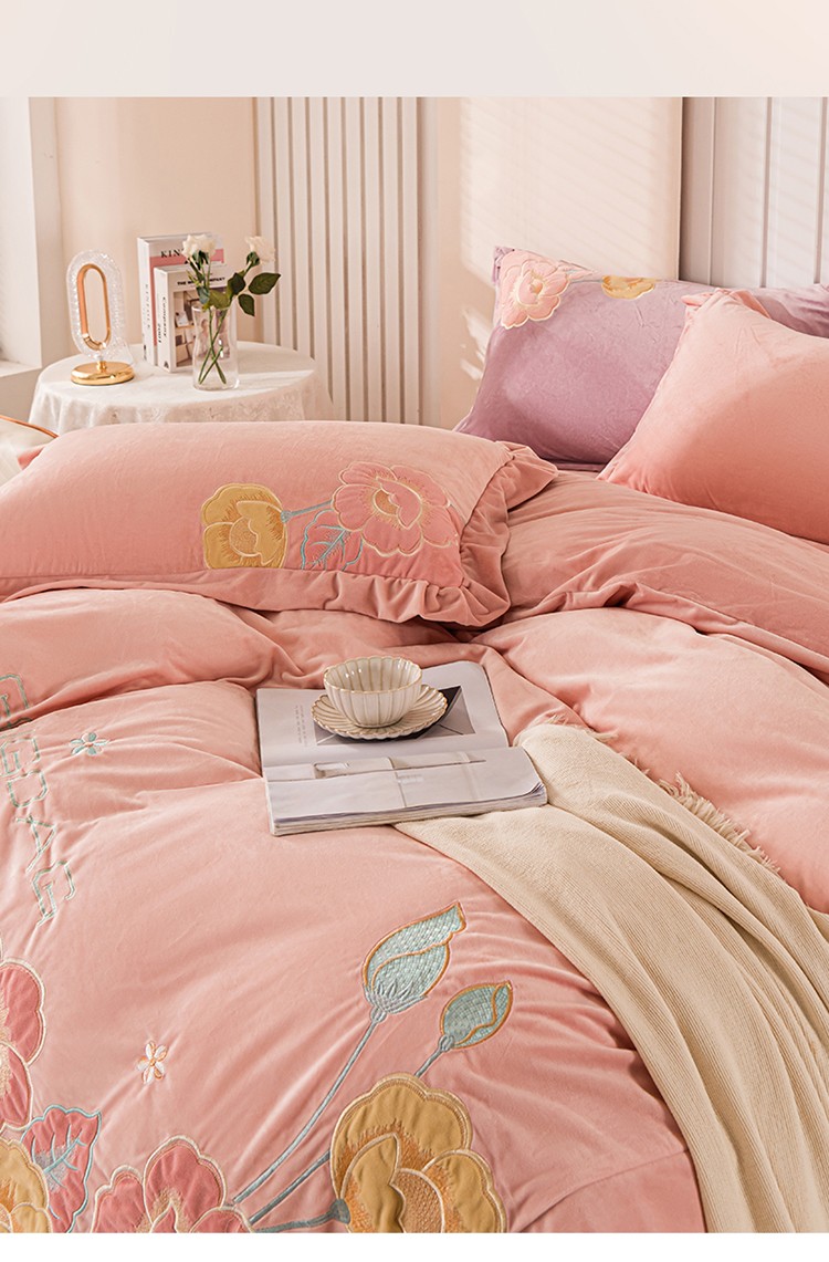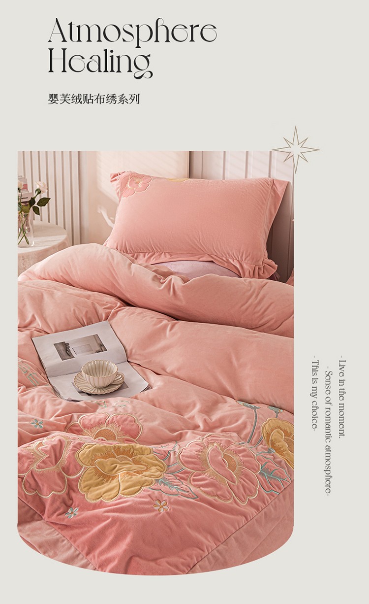 名品优仓 2022新款大贴布绣刺绣婴芙绒四件套百花齐放柔粉色