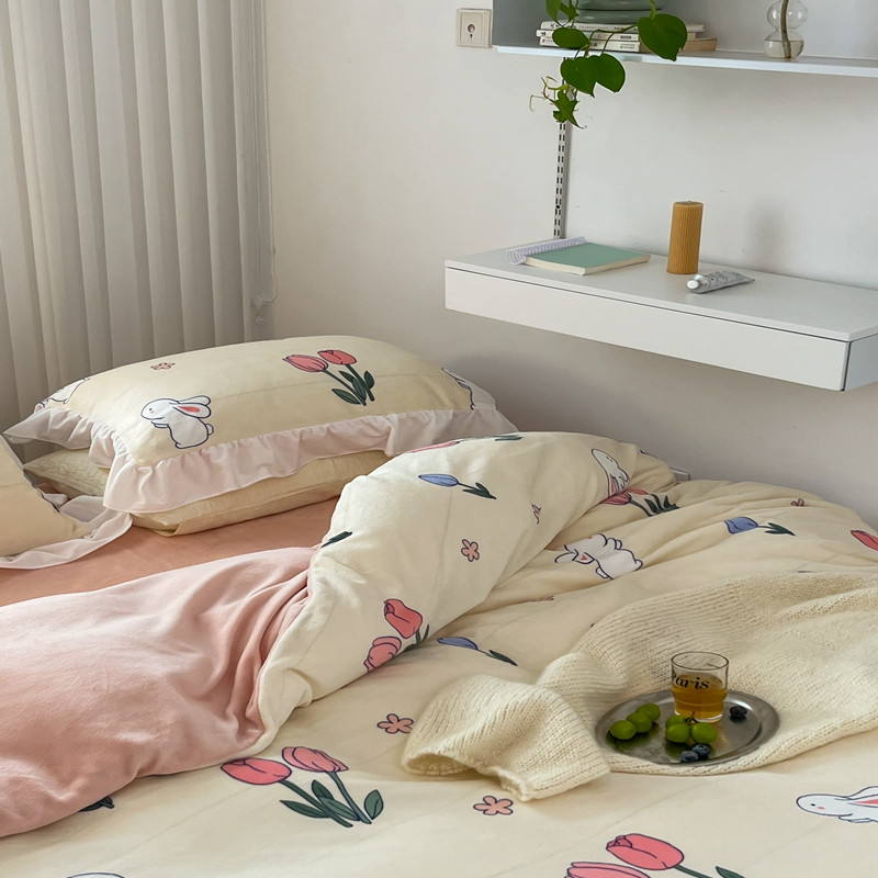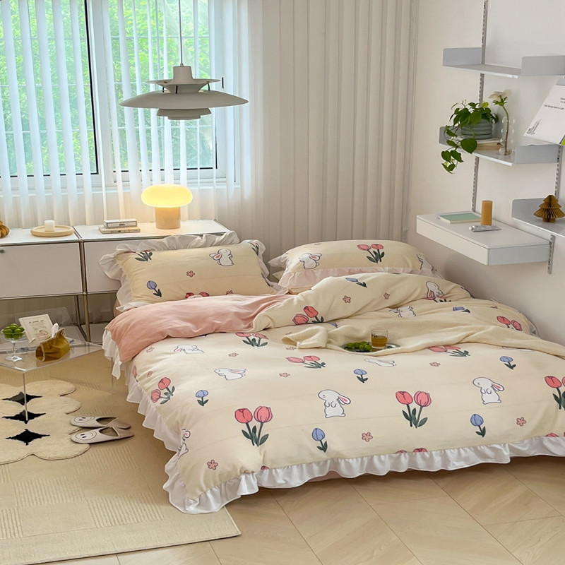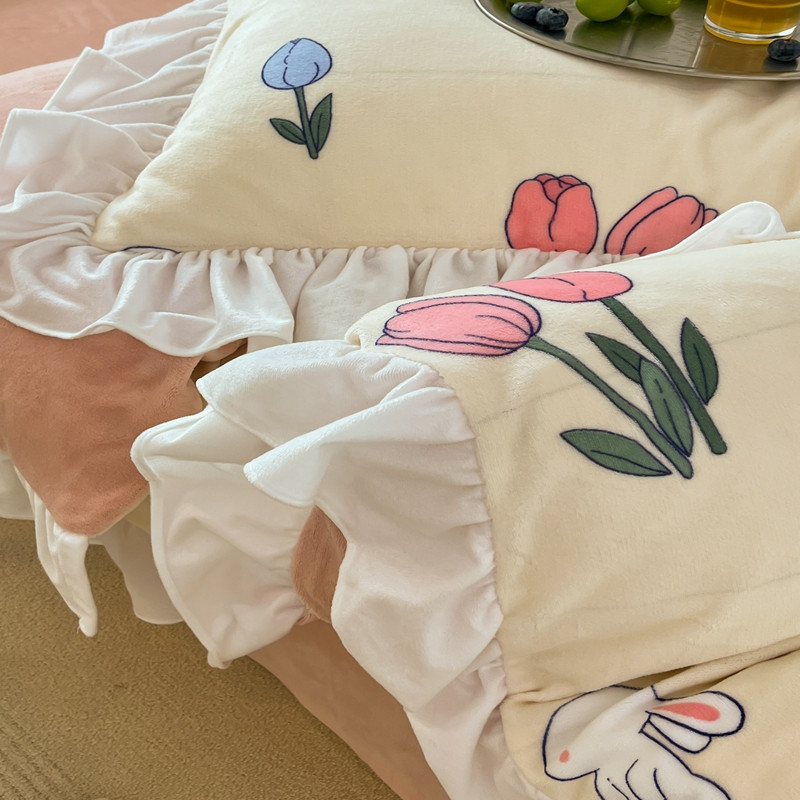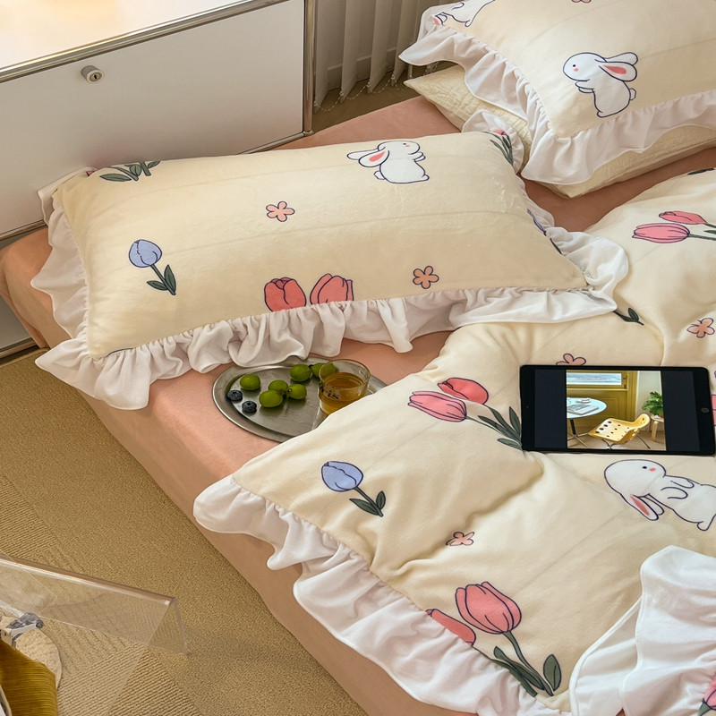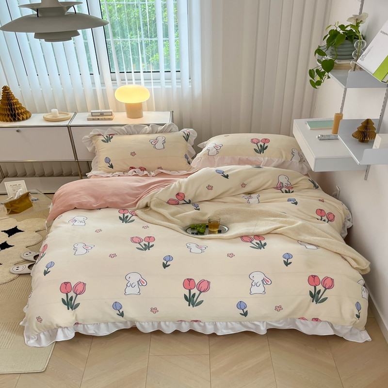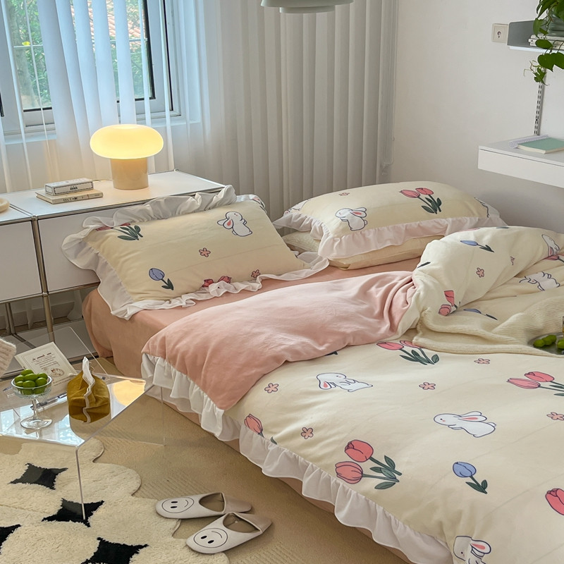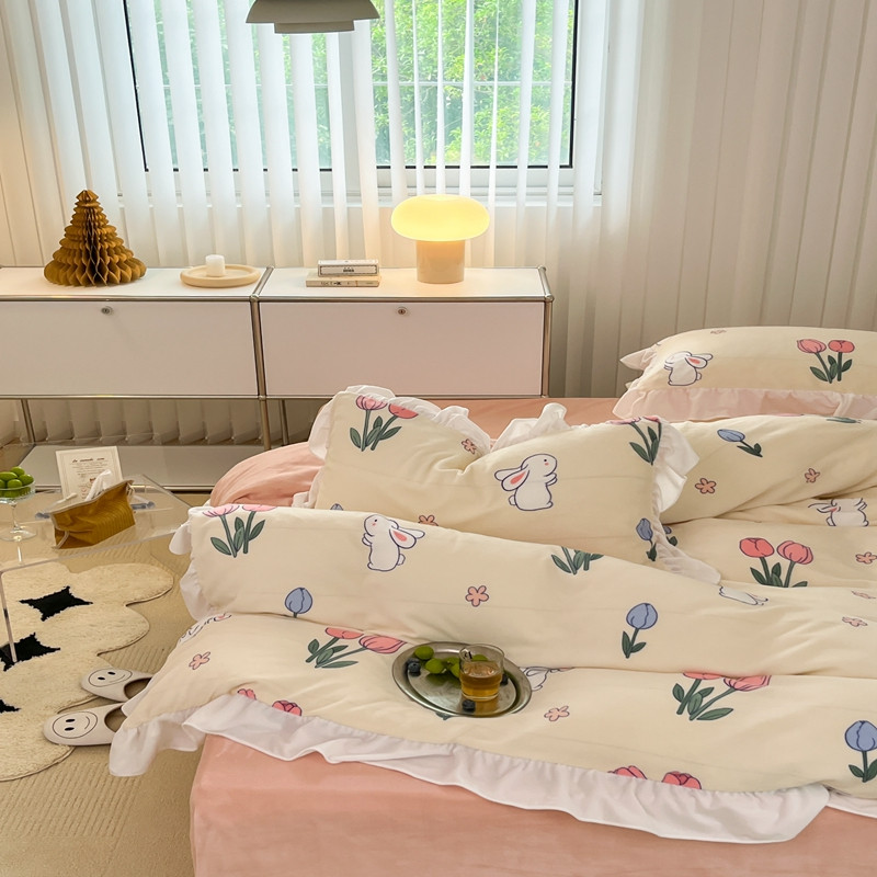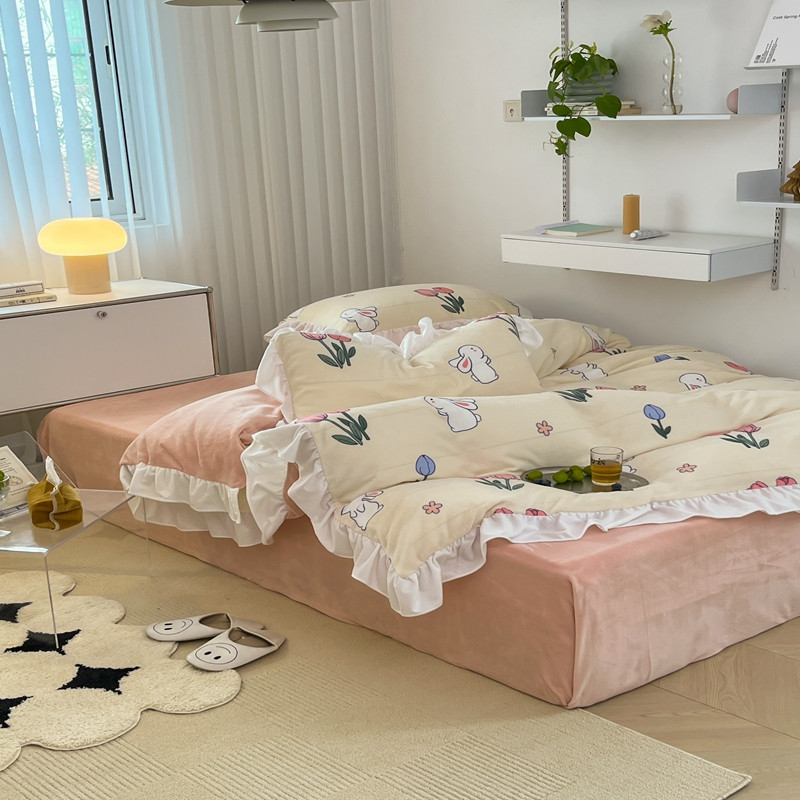 昔可 2022新款花边牛奶绒四件套 粉粉郁金兔