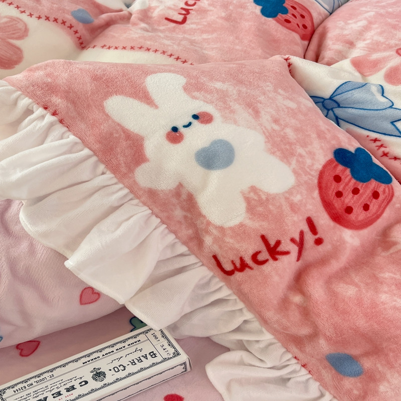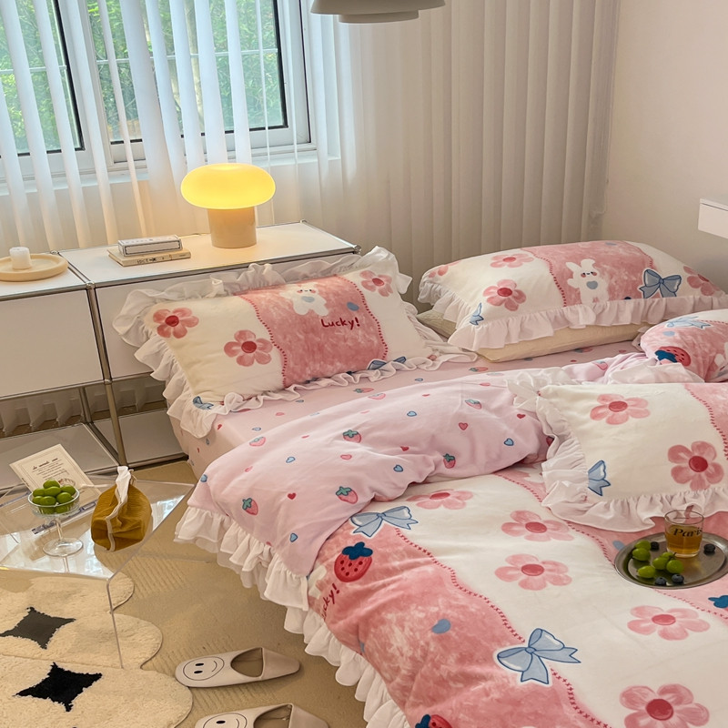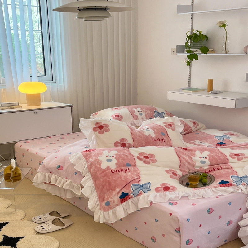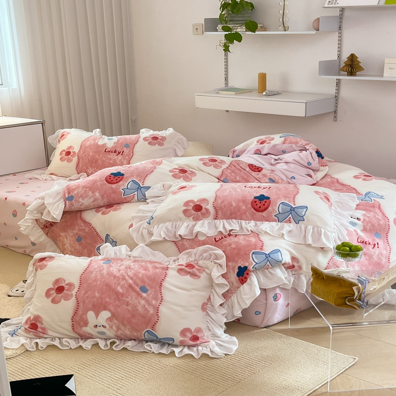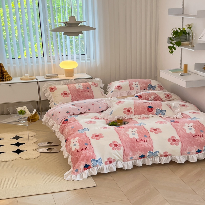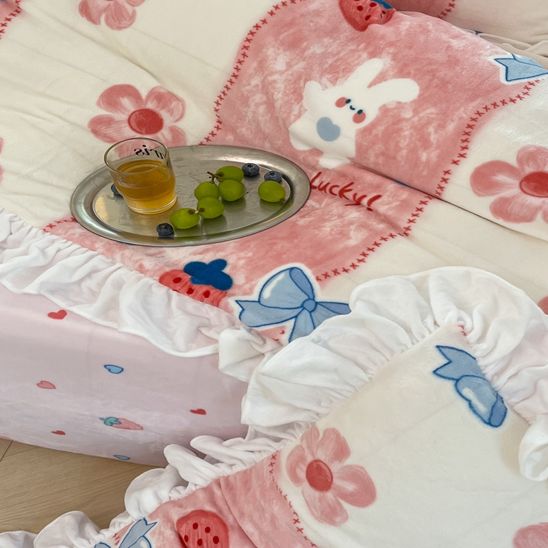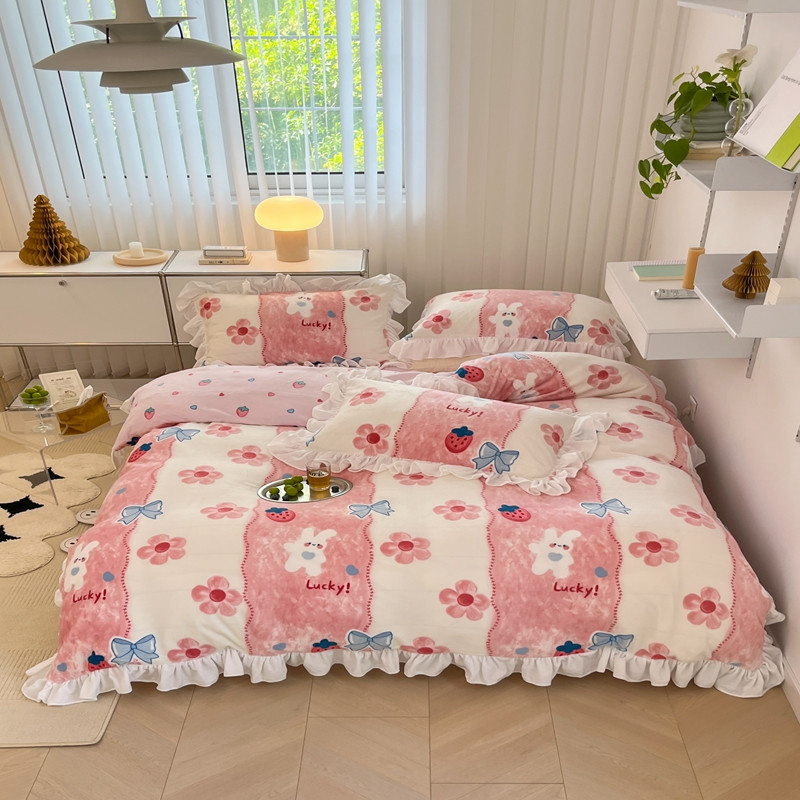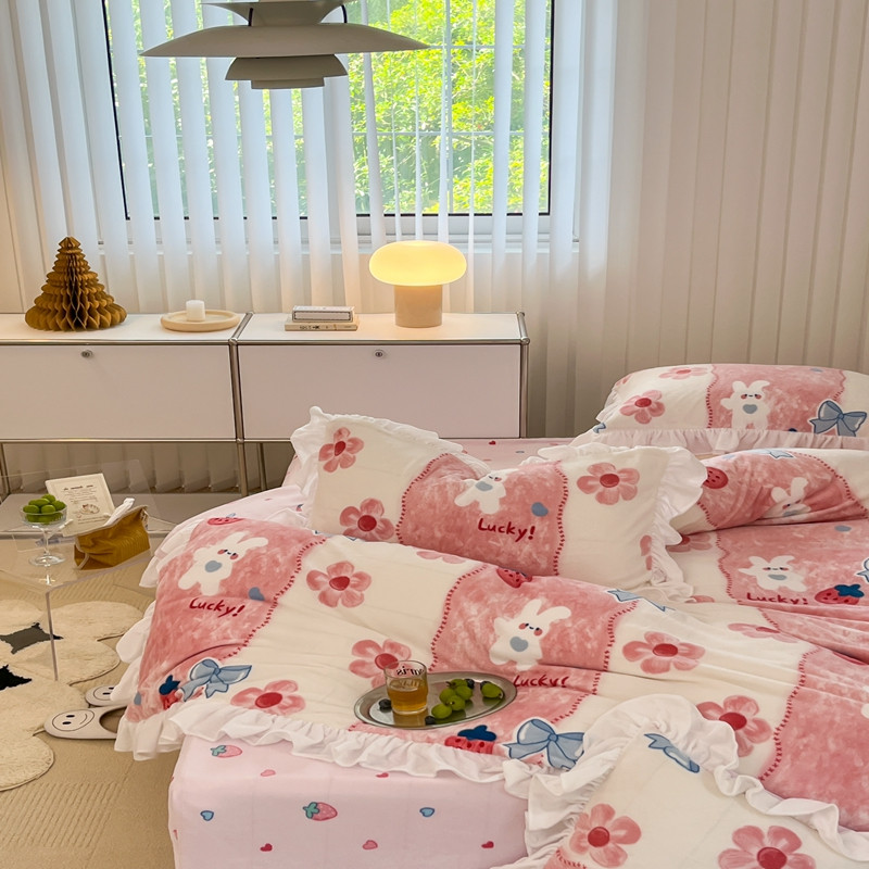 昔可 2022新款花边牛奶绒四件套 油画小兔