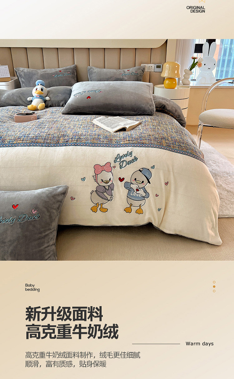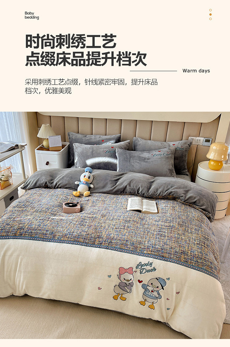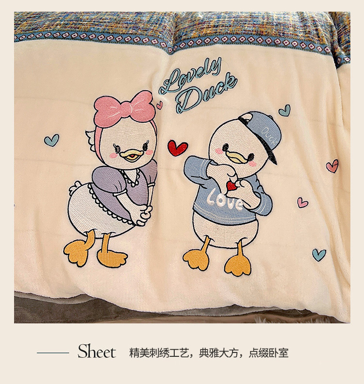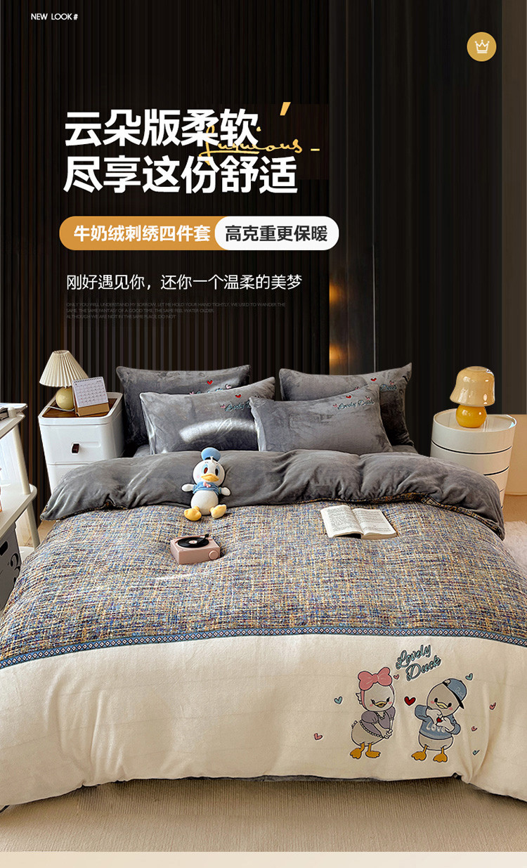 芃成 2022新款牛奶绒小香风刺绣卡通四件套 相亲相爱 咖