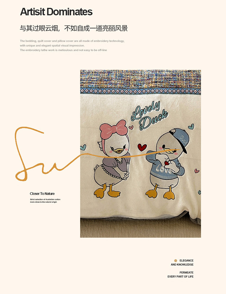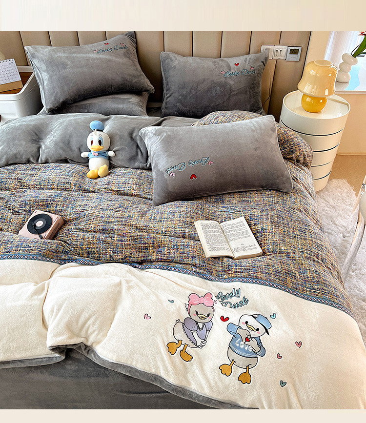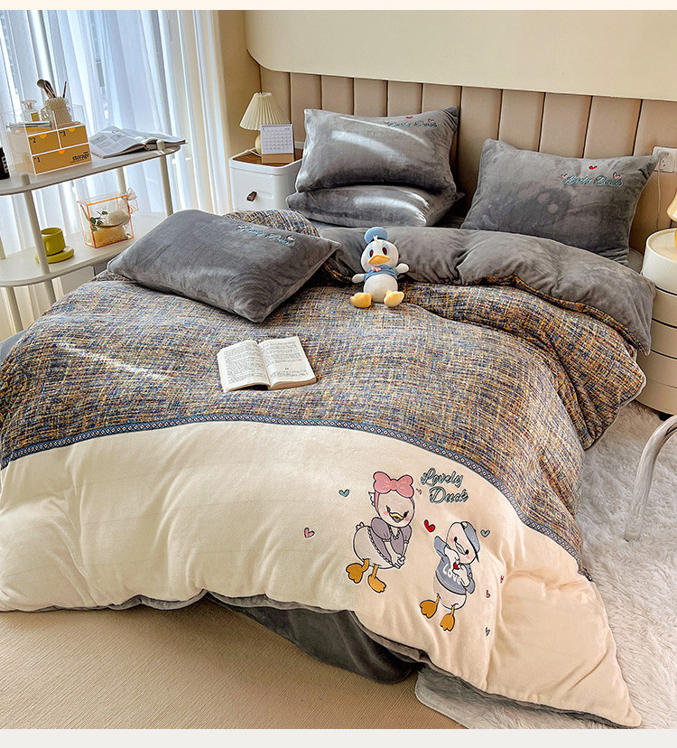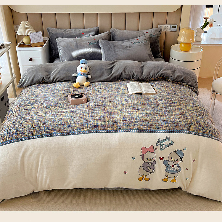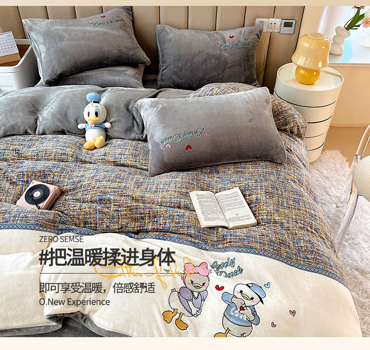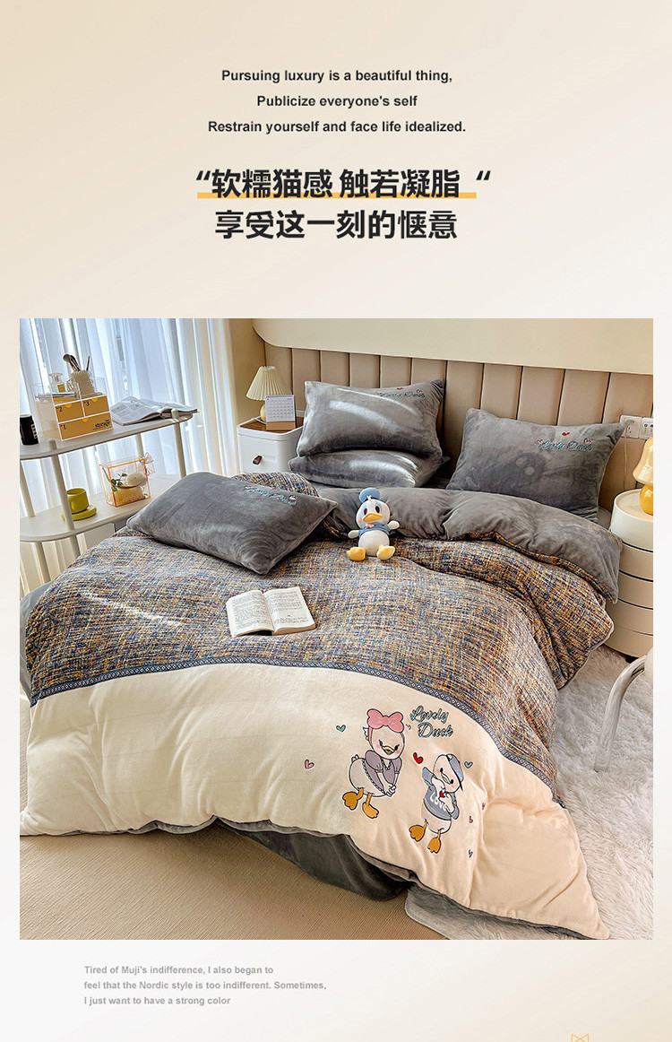 芃成 2022新款牛奶绒小香风刺绣卡通四件套 相亲相爱 咖