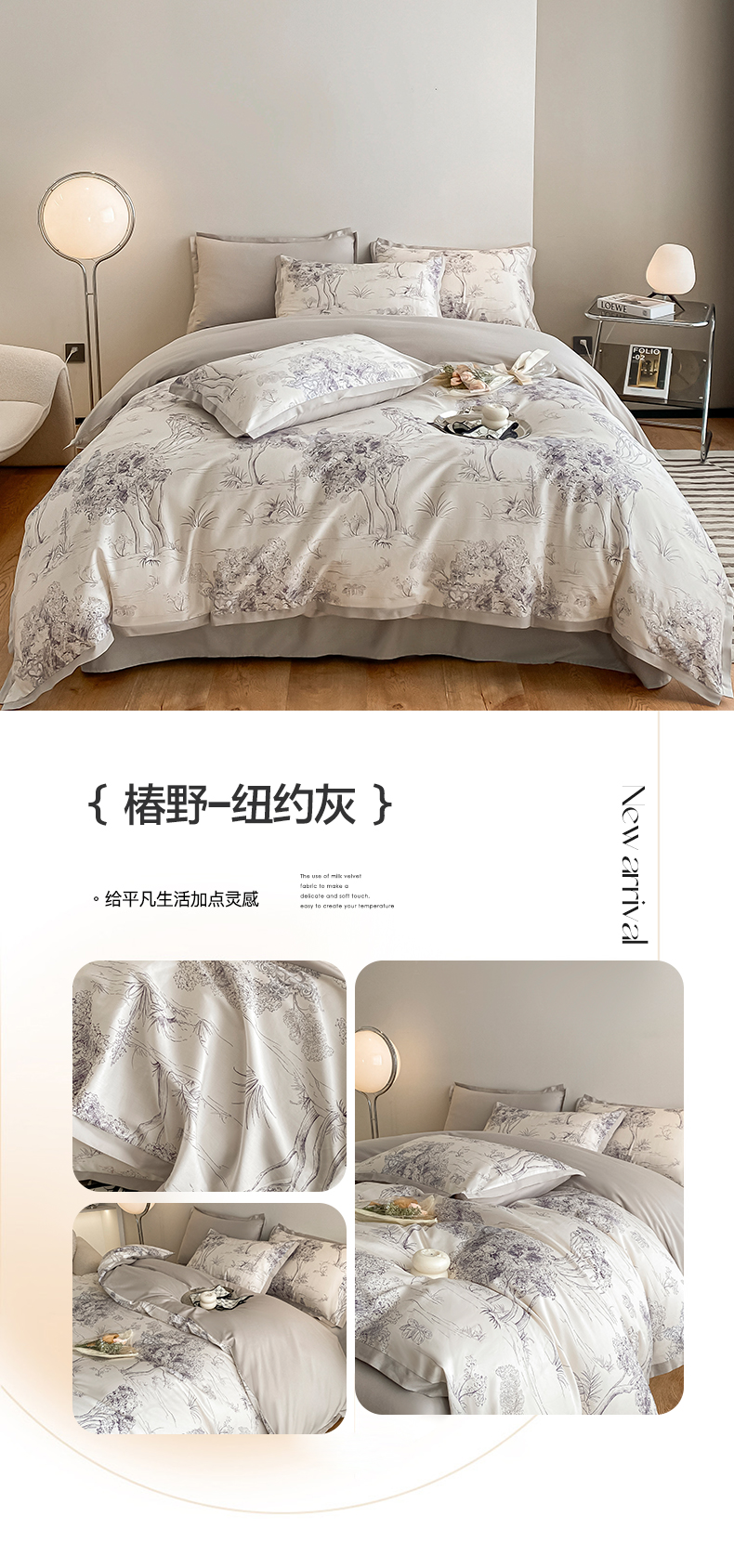 商品名称:(总)秀色 2025新款50支贡缎长绒棉床上四件套数码印花被套轻奢高级感床品 椿野-纽约灰