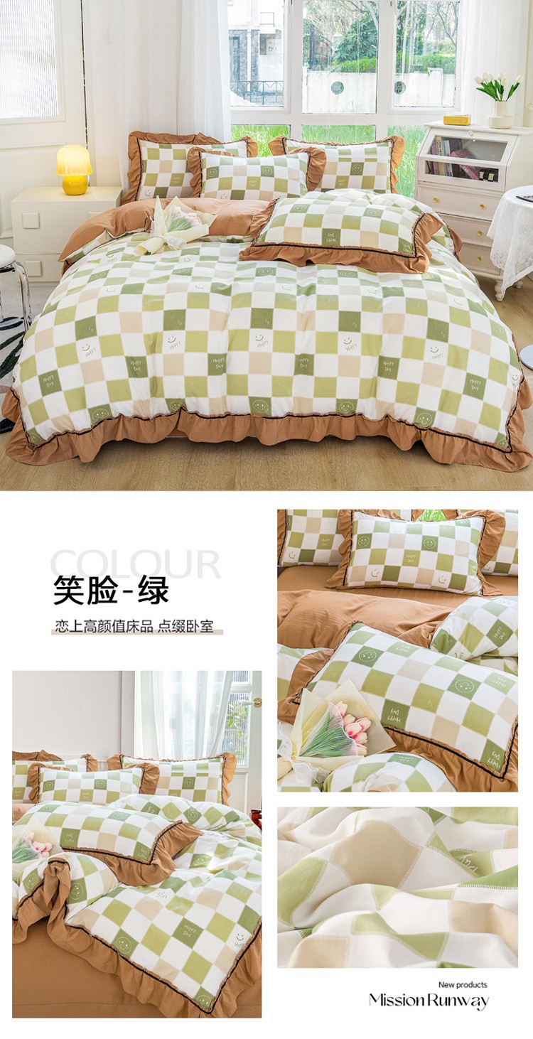 商品名称:尹黛尔 2024新款水洗棉麻四件套韩版双层纱轻法式花边四件套 笑脸-绿