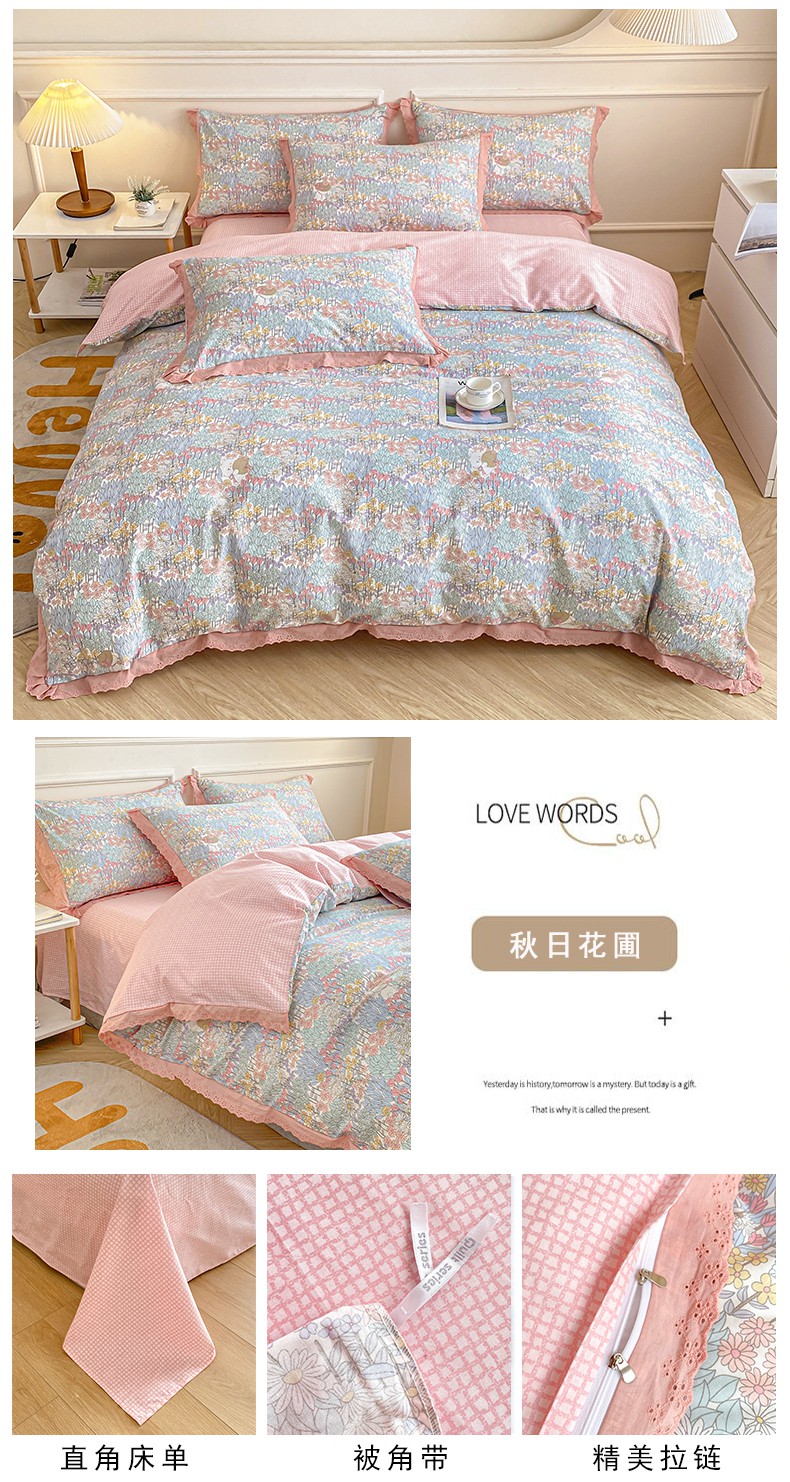 当前位置: 91家纺网 > 商品网购 > 床品套件 > 四件套 > 全棉普通四件套 > 宇彬20223年新款13372全棉韩版刺绣花边和印花花边四件套和单被套 刺绣花边 秋日花圃
