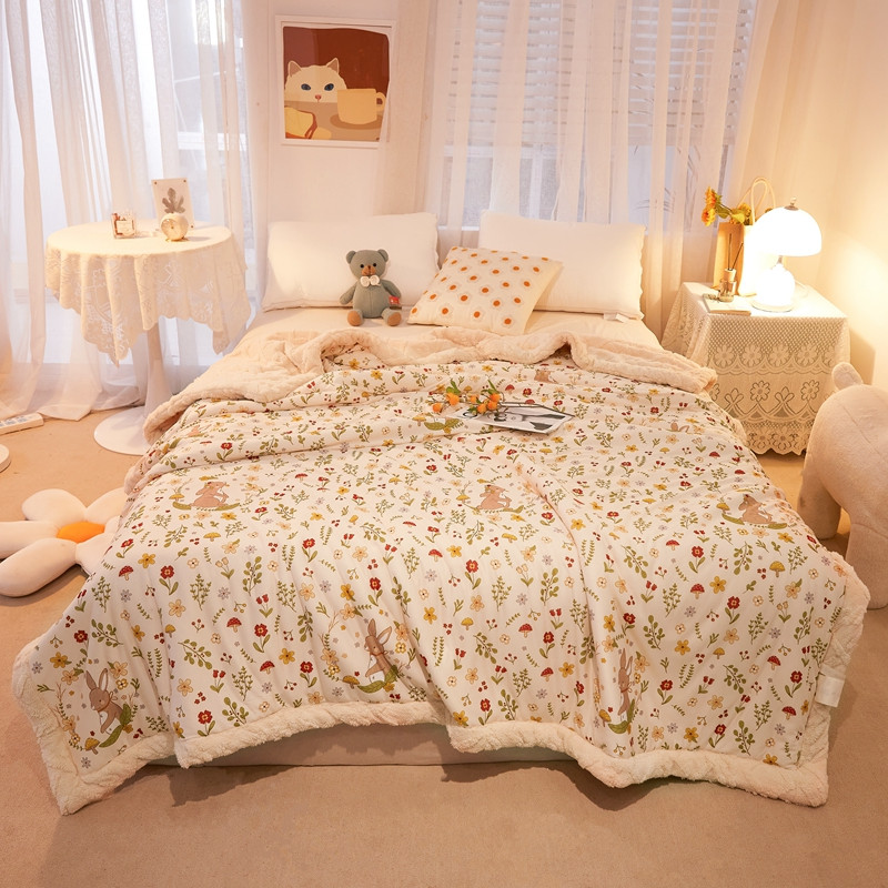 蓝冰家纺 2023新款针织印花毛毯 白色小花