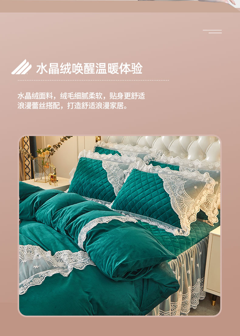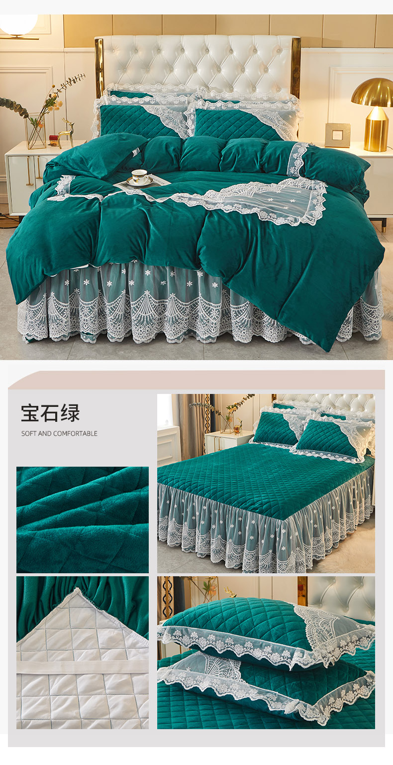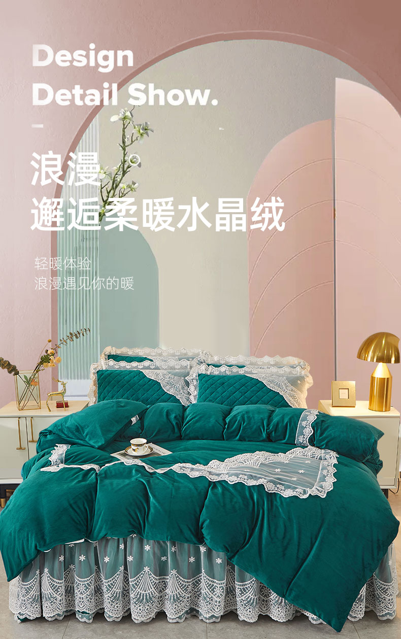 当前位置: 91家纺网 > 商品网购 > 床品套件 > 四件套 > 全棉普通四件套 > 2023新款水晶绒保暖床裙四件套爱妮系列 宝石绿