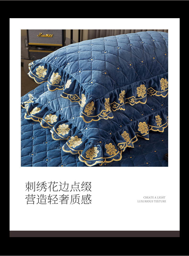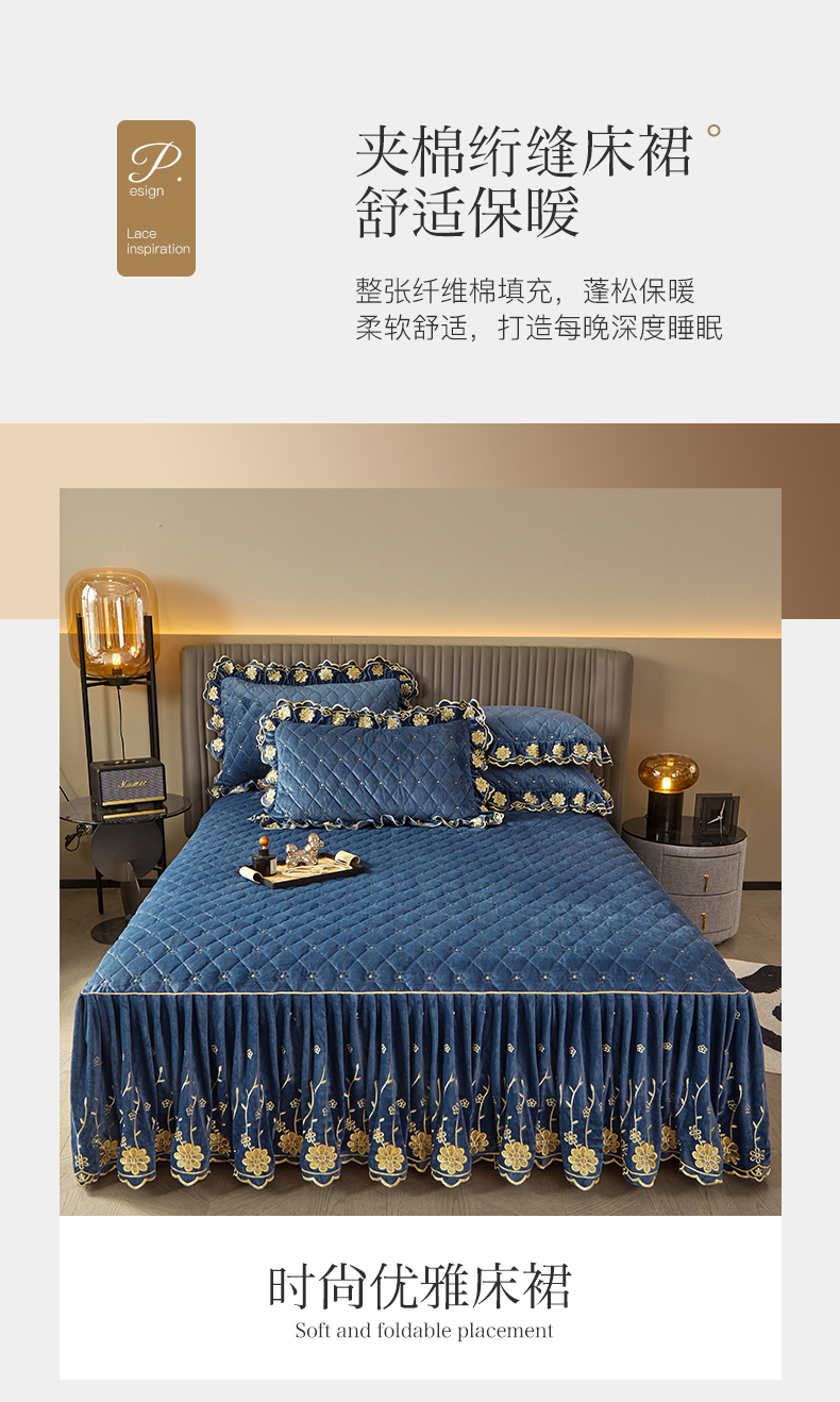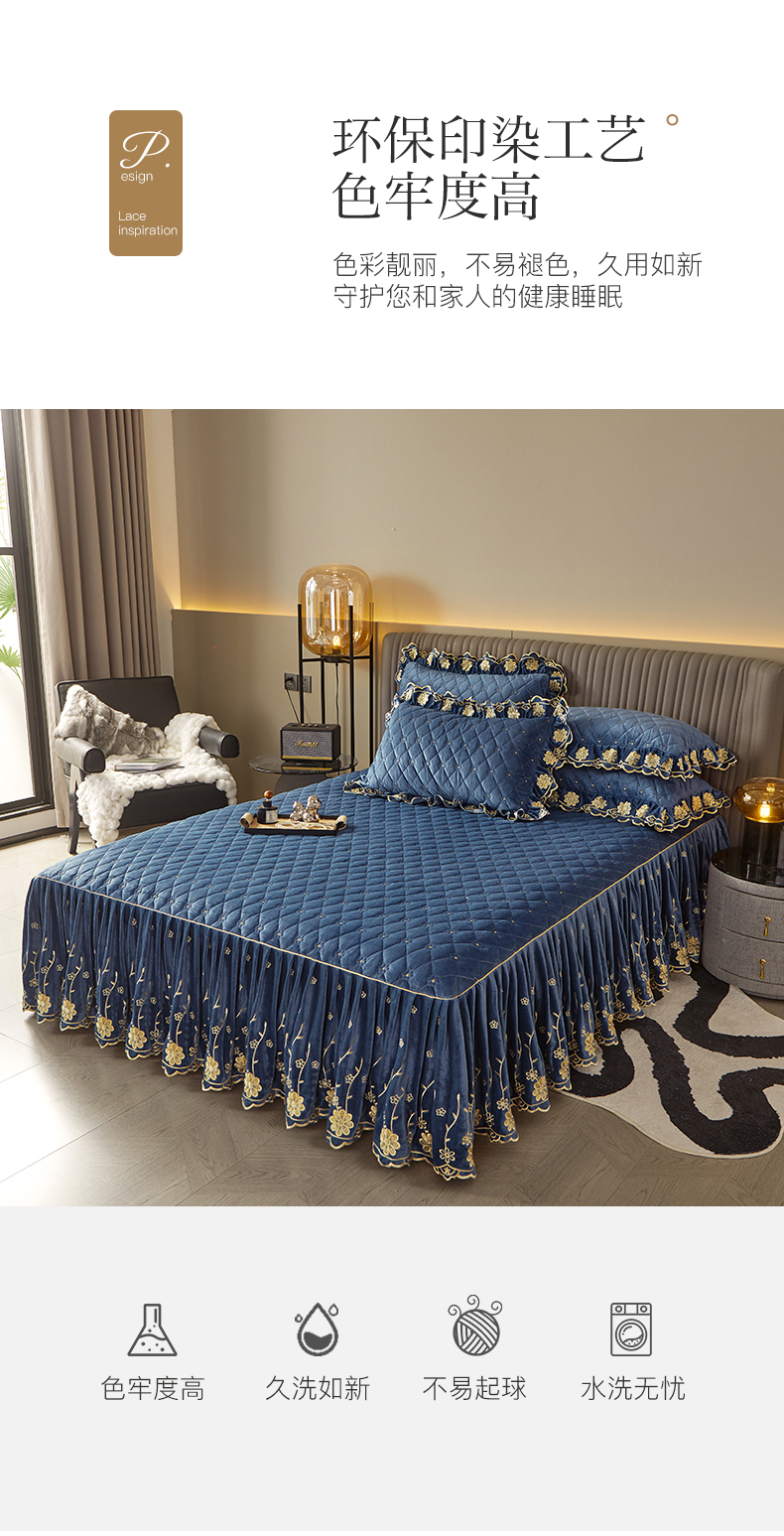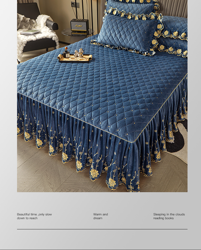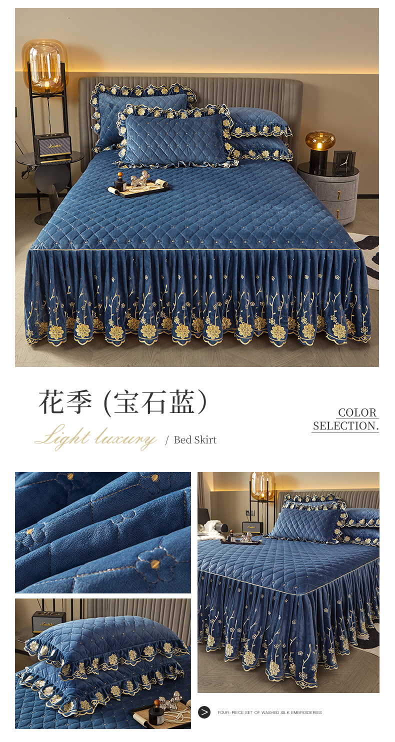 商品名称:罗艺轩 2024新款花季宝宝绒全套夹棉絎缝加厚系列床裙三件套 宝石蓝