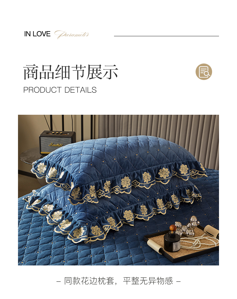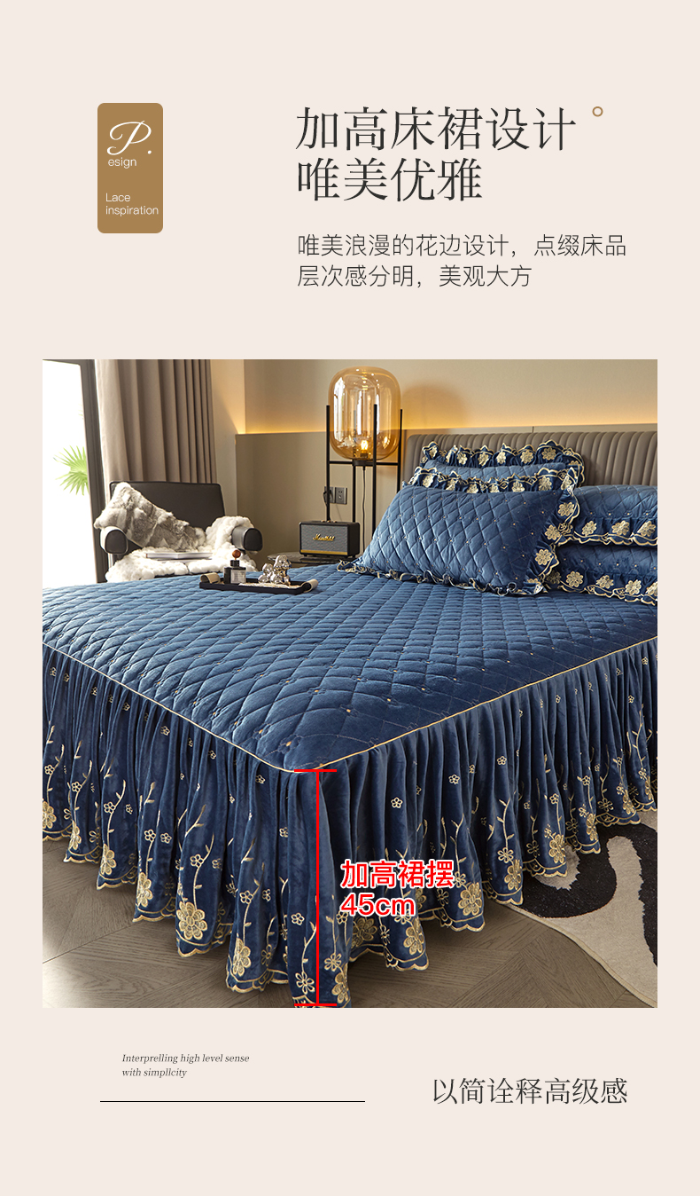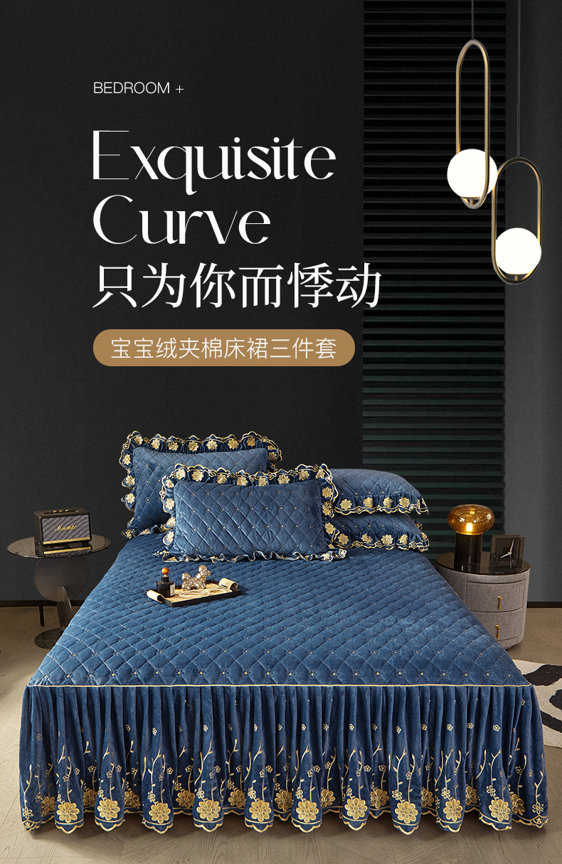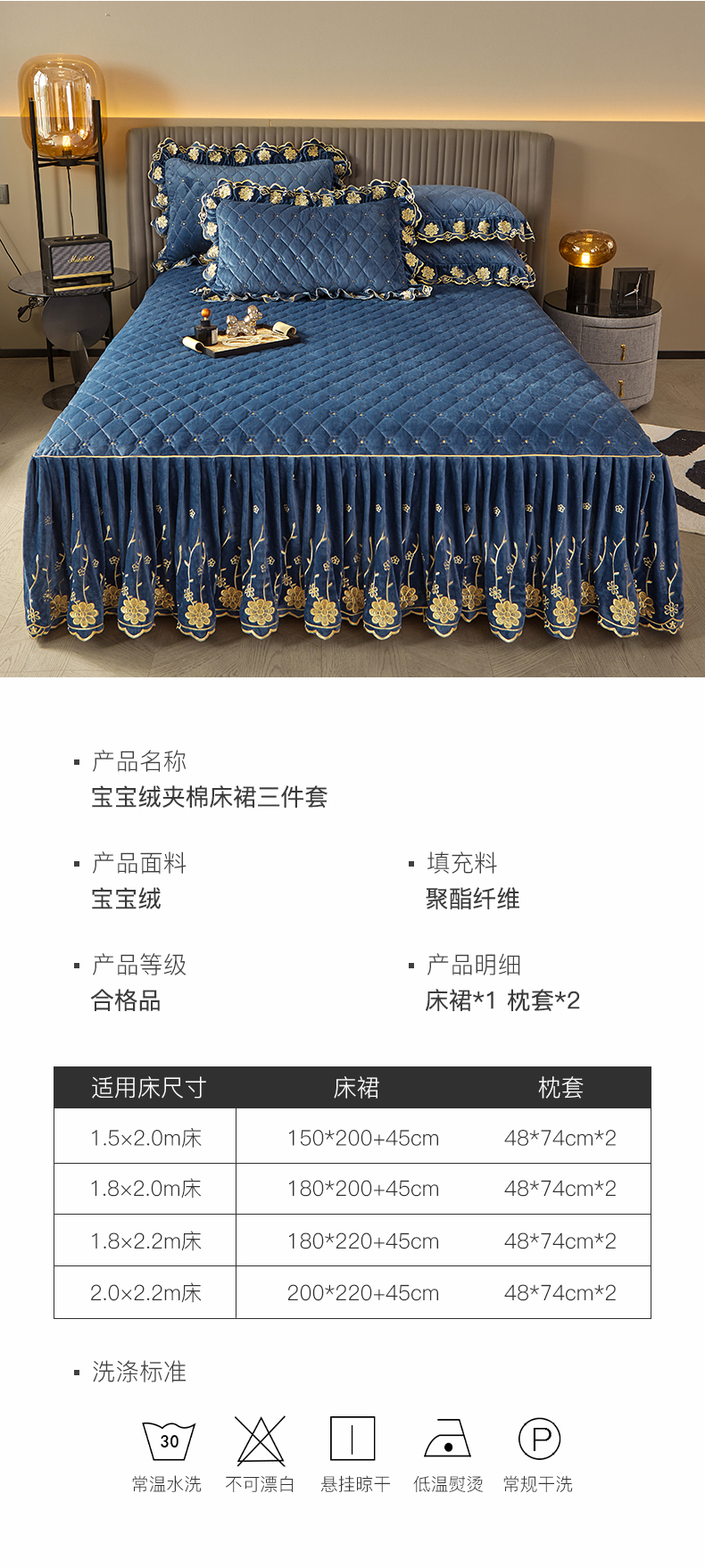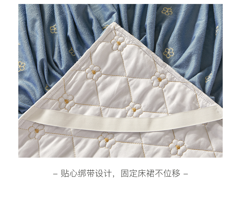 商品名称:罗艺轩 2024新款花季宝宝绒全套夹棉絎缝加厚系列床裙三件套 宝石蓝