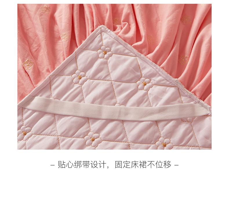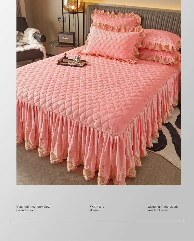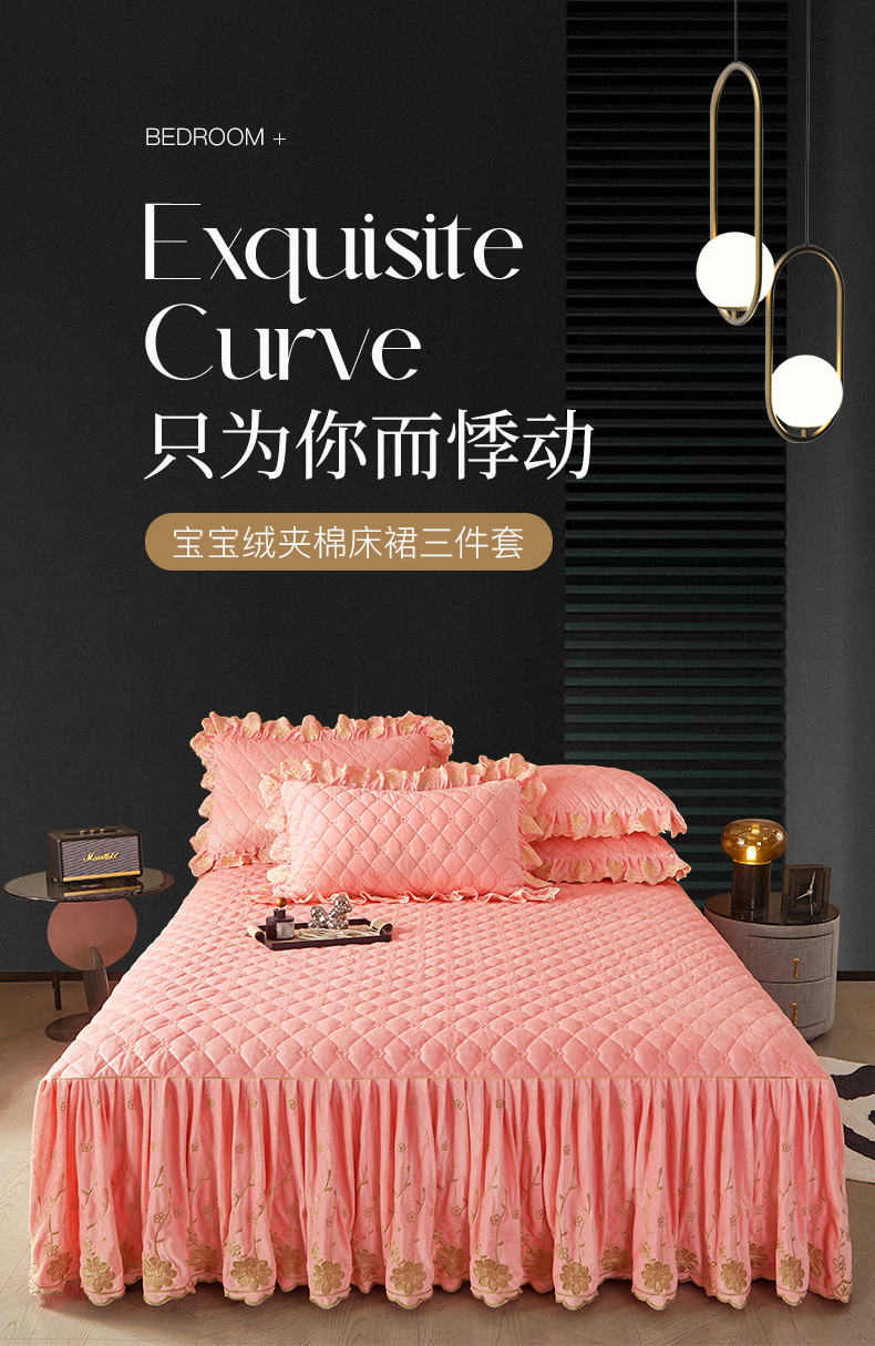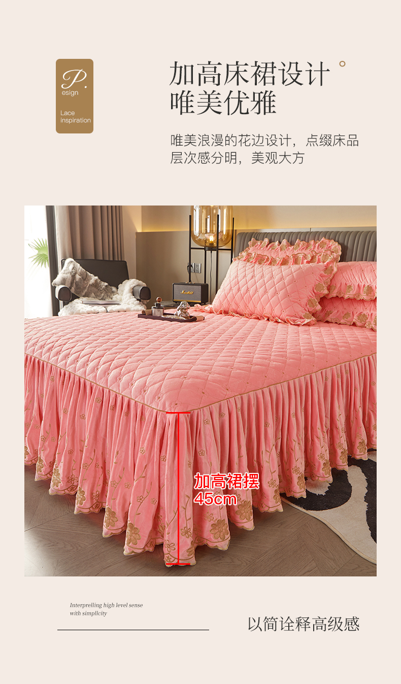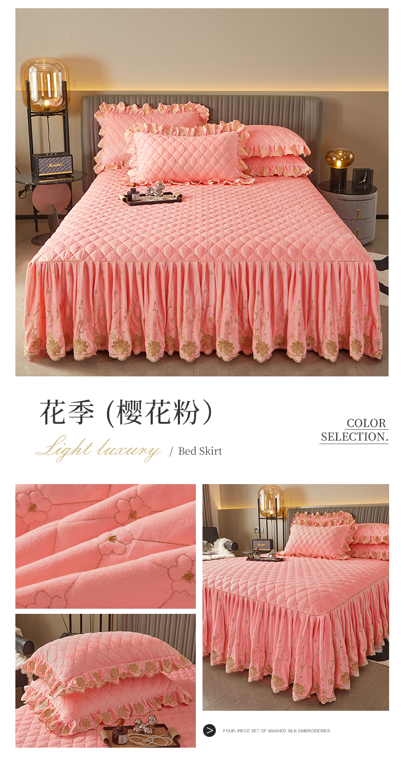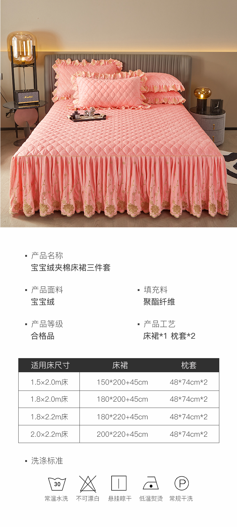 商品名称:罗艺轩 2024新款花季宝宝绒全套夹棉絎缝加厚系列床裙三件套 樱花粉