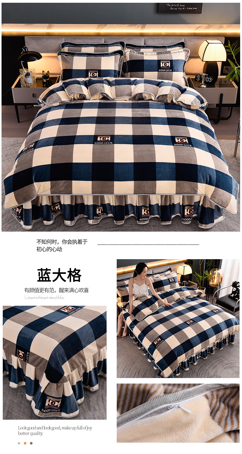 商品名称:盈超2023新款A类高克重印花牛奶绒金貂绒床裙款保暖绒四件套 蓝大格